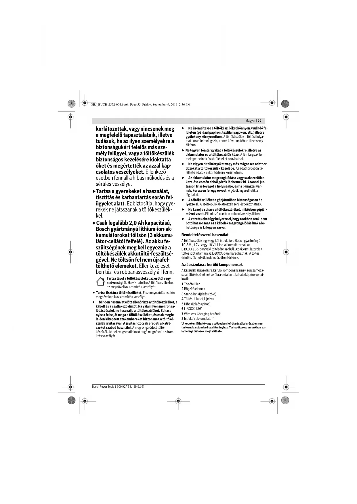 OBJ_BUCH-2572-004.book Page 53 Friday, September 9, 2016 2:56 PM54 | Magyar 1 609 92A 33J | (9.9.16) Bosch Power Tools Poruchy – príčiny a ich odstránenie Údržba a servis Ak by táto nabíjačka napriek starostlivej výrobe a kontrole predsa len prestala niekedy fungovať, treba dať opravu vyko- nať autorizovanej servisnej opravovni ručného elektrického náradia Bosch. Servisné stredisko a poradenstvo pri používaní Servisné stredisko Vám odpovie na otázky týkajúce sa opravy a údržby Vášho produktu ako aj náhradných súčiastok. Rozlo- žené obrázky a informácie k náhradným súčiastkam nájdete aj na web-stránke: www.bosch-pt.com Tím poradcov Bosch Vám s radosťou poskytne pomoc pri otázkach týkajúcich sa našich produktov a ich príslušenstva. V prípade akýchkoľvek otázok a objednávok náhradných sú- čiastok uvádzajte bezpodmienečne 10-miestne vecné číslo uvedené na typovom štítku výrobku. Slovakia Na www.bosch-pt.sk si môžete objednať opravu vášho stroja alebo náhradné diely online. Tel.: (02) 48 703 800 Fax: (02) 48 703 801 E-Mail: servis.naradia@sk.bosch.com www.bosch.sk Likvidácia Nabíjačky, príslušenstvo a obaly treba dať na recykláciu zod- povedajúcu ochrane životného prostredia. Neodhadzujte nabíjačky do komunálneho odpadu! Len pre krajiny EÚ: Podľa Európskej smernice 2012/19/EÚ o starých elektrických a elektronických výrob- koch a podľa jej aplikácií v národnom práve Vášho štátu treba nabíjačky, ktoré sa už nedajú používať, separovane zbierať a dávať na recykláciu zodpovedajúcu ochrane život- ného prostredia. Zmeny vyhradené. Magyar A termék és alkalmazási lehetőségei- nek leírása Olvassa el az összes bizton- sági figyelmeztetést és elő- írást. A következőkben leírt előírások betartásának elmu- lasztása áramütésekhez, tűz- höz és/vagy súlyos testi sérülésekhez vezethet. Kérjük ezt a biztonsági útmutatót gondosan őrizze meg. Csak akkor használja a töltőkészüléket, ha annak minden funkcióját meg tudja itélni és megfelelően végre tudja hajtani, vagy ha erre megfelelő utasításokat kapott. Biztonsági előírások Ez a töltőkészülék nincs arra előirá- nyozva, hogy gyerekek és korláto- zott fizikai, érzékelési vagy szelle- mi képességű, illetve kellő tapasz- talattal és/vagy tudással nem ren- delkező személyek használják. Ezt a töltőkészüléket legalább 8 éves gyerekek és olyan személyek is használhatják, akiknek a fizikai, ér- zékelési, vagy értelmi képességeik Príčina Odstránenie Červená indikácia chyby 5 bliká Nabíjanie nie je možné Akumulátor nie je (správne) umiestnený v L-BOXXe Dajte akumulátor do správnej pozície vo vložke L-BOXXu pre bezdrôtové nabíjanie, spodná strana akumulátora smeruje ku dnu L-BOXXu. Rozpoznanie cudzieho objektu Na nabíjacej ploche 1 sa na- chádza nejaký ďalší/iný pred- met ako akumulátor (možno vL-BOXXe) Odstráňte predmet Do L-BOXXu bol umiestnený nesprávny akumulátor Umiestnite kompatibilný aku- mulátor Bola použitá nesprávna vlož- ka L-BOXXu (akumulátory tak nie sú v správnej pozícii) Použite správnu vložku L-BOXXu (dá sa rozpoznať podľa nálepky pre bezdrôto- vé nabíjanie na L-BOXXe) Akumulátor je pokazený Akumulátor vymeniť za nový Indikácia pohotovostného stavu (zelená) 3 nesvieti Palubné napätie je príliš nízke Naštartujte motor (nabíjanie štartovacej batérie). Zástrčka nabíjačky nie je (nie je správne) zasunutá do zá- suvky Zástrčku zasuňte do zásuvky (zasuňte ju celkom) Je poškodená zásuvka vo vo- zidle, elektrická zásuvka, sie- ťový kábel alebo nabíjačka Palubné napätie je príliš nízke Skontrolujte napätie v sieti alebo v palubnej sieti vozidla, v prípade potreby dajte nabí- jačku skontrolovať v autorizovanom zákazníc- kom stredisku pre elektrické náradie značky Bosch. OBJ_BUCH-2572-004.book Page 54 Friday, September 9, 2016 2:56 PMMagyar | 55 Bosch Power Tools 1 609 92A 33J | (9.9.16) korlátozottak, vagy nincsenek meg a megfelelő tapasztalataik, illetve tudásuk, ha az ilyen személyekre a biztonságukért felelős más sze- mély felügyel, vagy a töltőkészülék biztonságos kezelésére kioktatta őket és megértették az azzal kap- csolatos veszélyeket. Ellenkező esetben fennáll a hibás működés és a sérülés veszélye. Tartsa a gyerekeket a használat, tisztítás és karbantartás során fel- ügyelet alatt. Ez biztosítja, hogy gye- rekek ne játsszanak a töltőkészülék- kel. Csak legalább 2,0 Ah kapacitású, Bosch gyártmányú lithium-ion-ak- kumulátorokat töltsön (3 akkumu- látor-cellától felfelé). Az akku fe- szültségének meg kell egyeznie a töltőkészülék akkutöltő-feszültsé- gével. Ne töltsön fel nem újrafel- tölthető elemeket. Ellenkező eset- ben tűz- és robbanásveszély áll fenn. Tartsa távol a töltőkészüléket az esőtől vagy nedvességtől. Ha víz hatol be A töltőkészülékbe, ez megnöveli az áramütés veszélyét. Tartsa tisztán a töltőkészüléket. Elszennyeződés esetén megnövekedik az áramütés veszélye. Minden használat előtt ellenőrizze a töltőkészüléket, a kábelt és a csatlakozó dugót. Ha valamilyen megrongá- lódást észlel, ne használja a töltőkészüléket. Sohase nyissa fel saját maga a töltőkészüléket, és csak megfe- lelően kiképzett szakembereket bízzon meg a töltőké- szülék javításával. A javításhoz csak eredeti alkatré- szeket szabad használni. A megrongálódott töltő- készülék, kábel, vagy csatlakozó dugó megnöveli az áram- ütés veszélyét. Ne üzemeltesse a töltőkészüléket könnyen gyulladó fe- lületen (például papíron, textilanyagokon, stb.) illetve gyúlékony környezetben. A töltőkészülék a töltési folya- mat során felmelegszik, ennek következtében tűzveszély