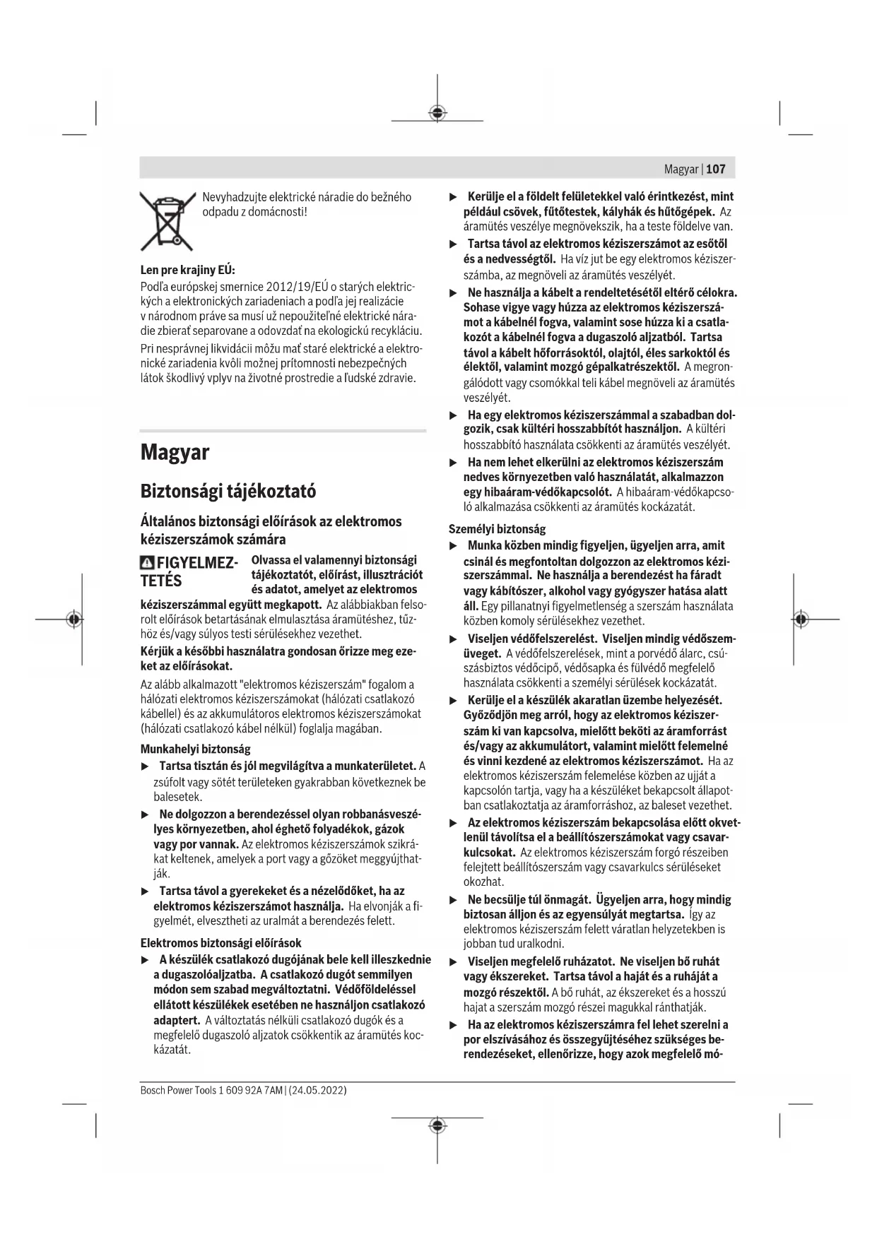 Vékony fémlemezek, vagy más, könnyen rezgésbe jövő nagy felületű anyagok csiszolása a zajkibocsátást 15 dB-lel is megnövelheti. A meg- növekedett zajkibocsátást megfelelő csillapító szőnyeg alkalmazásá- val csökkenteni lehet. A megnövekedett zajkibocsátást a zajteljesít- ménnyel kapcsolatos kockázatok megbecslésénél és a megfelelő hal- lásvédő felszerelés kiválasztásánál is figyelembe kell venni. Az ezen utasításokban megadott rezgésszint és zajkibocsátá- si érték egy szabványban rögzített mérési módszerrel került meghatározásra és az elektromos kéziszerszámok egymással való összehasonlítására alkalmazható. Ez az érték a rezgés- és zajkibocsátás ideiglenes becslésére is alkalmas. A megadott rezgésszint és zajkibocsátási érték az elektro- mos kéziszerszám fő alkalmazásaira vonatkozik. Ha az elekt- romos kéziszerszámot más alkalmazásokra, eltérő betétszer- számokkal vagy nem kielégítő karbantartás mellett használ- ják, a rezgésszint és a zajkibocsátási érték a fenti értékektől eltérhet. Ez az egész munkaidőre vonatkozó rezgés- és zajki- bocsátást lényegesen megnövelheti. A rezgés- és zajkibocsátás pontos megbecsüléséhez figye- lembe kell venni azokat az időszakokat is, amikor a készülék kikapcsolt állapotban van, vagy amikor be van ugyan kap- csolva, de nem kerül ténylegesen használatra. Ez az egész munkaidőre vonatkozó rezgés- és zajkibocsátást lényegesen csökkentheti. Hozzon kiegészítő biztonsági intézkedéseket a kezelőnek a rezgések hatása elleni védelmére, például: Az elektromos ké- ziszerszám és a betétszerszámok karbantartása, a kezek me- legen tartása, a munkamenetek megszervezése. Újraindulás elleni védelem Az újraindulás elleni védelem az áramellátás megszakítása majd helyreállítása esetén meggátolja az elektromos kézi- szerszám akaratlan újraindulását. Az ismételt üzembe helyezéshez hozza a (6) be-/kikapcso- lót a kikapcsolt helyzetbe, majd ismét kapcsolja be az elekt- romos kéziszerszámot. Megjegyzés: Nagyon gyors ki- és visszakapcsolás esetén előfordulhat, hogy az újraindulás elleni védelem aktiválódik, és az elektromos kéziszerszám a (6) be-/kikapcsoló működ- tetése ellenére sem indul el. Hozza a (6) be-/kikapcsolót ki- kapcsolt helyzetbe és kapcsolja ismét be az elektromos kézi- szerszámot. Összeszerelés u Az elektromos kéziszerszámon végzendő bármely munka megkezdése előtt húzza ki a csatlakozó dugót a dugaszolóaljzatból. Védőberendezés felszerelése u Az elektromos kéziszerszámon végzendő bármely munka megkezdése előtt húzza ki a csatlakozó dugót a dugaszolóaljzatból. u Állítsa be úgy a(2)védőbúra helyzetét, hogy a kezelő irányába ne léphessenek ki szikrák. Védőbúra csiszoláshoz (lásd aAábrát) Tegye fel a(2)védőbúrát az orsónyakra. Állítsa be a munka- menetnek megfelelően a(2)védőbúra helyzetét. Reteszelje a(2)védőbúrát a(9)rögzítőcsavarral és húzza meg legalább 10Nm nyomatékkal a rögzítőcsavart. A csiszolószerszámok felszerelése (lásd aBábrát) A csiszolótesteknek kifogástalanul kereknek kell lenniük. A nem teljesen kerek csiszolótesteket ne használja, hanem cserélje ki, vagy egy lehúzókővel (külön tartozék) javítsa ki azokat. A lehúzókővel a csiszolótestek alapformájából különleges formájú csiszolótesteket is ki lehet alakítani. Ha menettel el- látott csiszolószerszámokat használ, ügyeljen arra, hogy Bosch Power Tools 1 609 92A 7AM | (24.05.2022)112 | Magyar a(3)csiszolóorsó vége ne érjen hozzá a csiszolószerszám nyílásokkal ellátott alapjához. – Forgassa el a(3)csiszolóorsót annyira, hogy a(3)csiszolóorsó furatának helyzete egybeessen a házon található kivágásokkal. Dugja keresztül a(10)tartócsapot a ház kivágásain és a(3)csiszolóorsó furatán. – Lazítsa ki a(1)befogó anyát a készülékkel szállított(11)körmöskulccsal és csavarja le a befogó anyát. – Tisztítsa meg a(3)csiszolóorsót és valamennyi felszere- lésre kerülő alkatrészt. – Tegye fel a csiszolótestet, majd a(11)körmöskulccsal húzza meg szorosra a(1)befogó anyát. Ügyeljen arra, hogy a csiszolótest a(2)védőbúrában szabadon forog- hasson. u Kúpalakú csiszolótesteket csak a nyitott(2)védőbúrával és a megfelelő befogó rend- szerrel ((1)befogó anya vagy (7)gyorsbefogó anya és (4)felfogó karima) használjon. A felfogó karima kicserélése (lásd aCábrát) Kúpalakú csiszolótestek rögzítéséhez használja a(4)felfogó karimát, a(1)befogó anyát és a nyitott(2)védőbúrát. Emelje ki egy csavarhúzóval a(13)zárgyűrűt a(3)csiszolóorsó hornyából és vegye le a(4)felfogó kari- mát. Szerelje fel a megfelelő(4)felfogó karimát. Gyorsbefogó anya (lásd aDábrát) Egy egyszerű, szerszámok alkalmazása nélküli csiszolószer- szám-cseréhez a(1)befogó anya helyett a(7)gyorsbefogó anyát is lehet használni. u A(7)gyorsbefogó anyát nem szabad keféléshez hasz- nálni. Csak hibátlan, kifogástalan(7) gyorsbefogó anyát hasz- náljon. A felcsavarozás során ügyeljen arra, hogy a(7)gyorsbefogó anya felirattal ellátott oldala ne a csi- szolókorong felé mutasson; a nyílnak a (12) indexre kell mutatnia. Forgassa el a(3)csiszolóorsót annyira, hogy a(3)csiszolóorsó furatának helyzete egybeessen a házon ta- lálható kivágásokkal. Dugja keresztül a(10)tartócsapot a ház kivágásain és a(3)csiszolóorsó furatán. A(7)gyorsbefogó anya megszorításához forgassa el erőtel- jesen a csiszolókorongot az óramutató járásával megegyező irányba Egy előírásszerűen megszorított, megrongálatlan gyorsbefo- gó anyát a peremes gyűrűnek az óramutató járásával ellenke- ző irányban való elforgatásával szabad kézzel ki lehet oldani. Egy beszorult gyorsbefogó anya kilazít