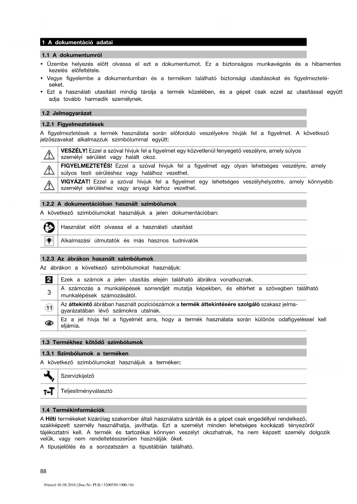 A figyelmeztetések a termék használata során előforduló veszélyekre hívják fel a figyelmet. A következő jelzőszavakat alkalmazzuk szimbólummal együtt: VESZÉLY! Ezzel a szóval hívjuk fel a figyelmet egy közvetlenül fenyegető veszélyre, amely súlyos személyi sérülést vagy halált okoz. FIGYELMEZTETÉS! Ezzel a szóval hívjuk fel a figyelmet egy olyan lehetséges veszélyre, amely súlyos testi sérüléshez vagy halálhoz vezethet. VIGYÁZAT! Ezzel a szóval hívjuk fel a figyelmet egy lehetséges veszélyhelyzetre, amely könnyebb személyi sérüléshez vagy anyagi kárhoz vezethet.