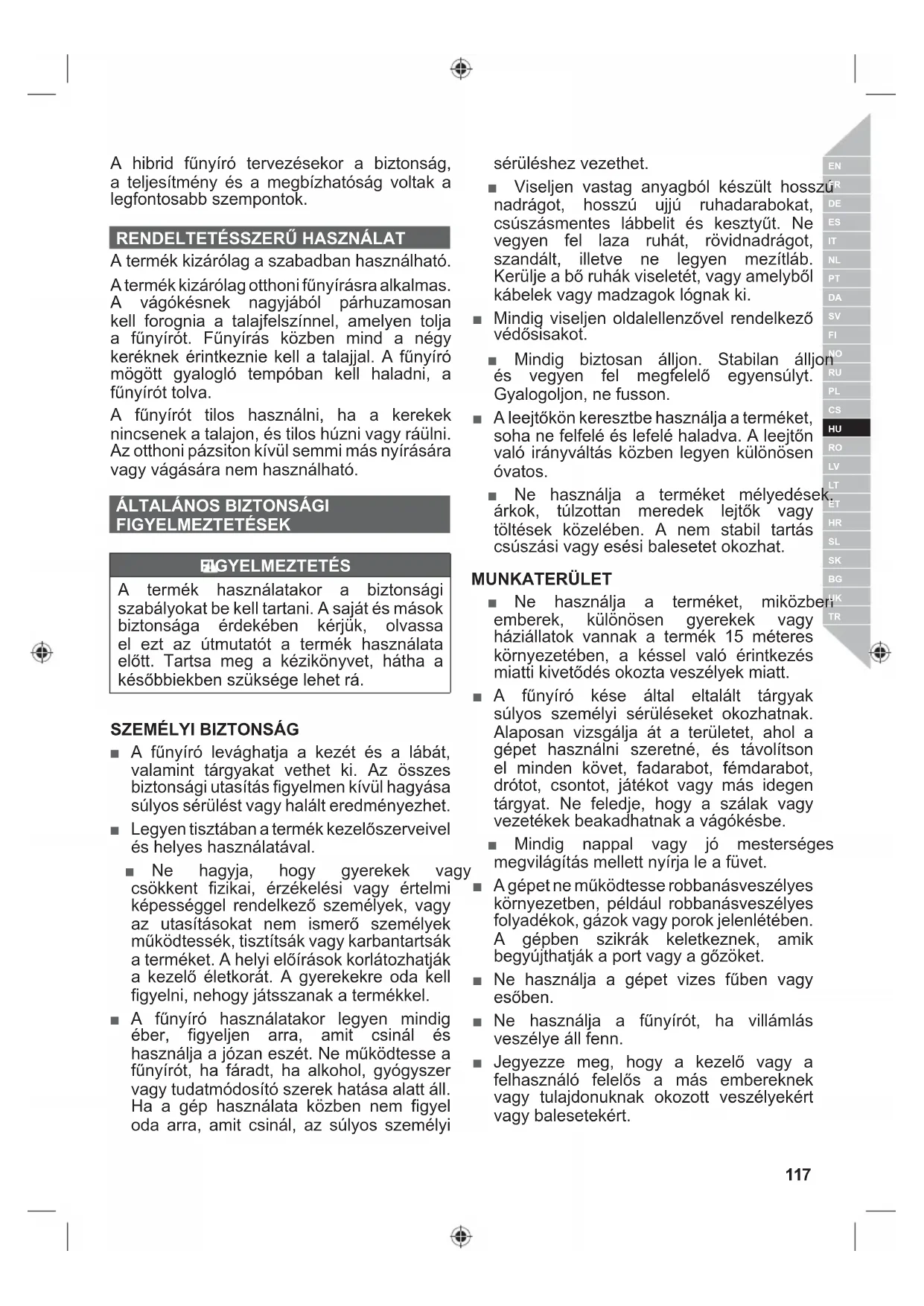 ■ A fűnyíró levághatja a kezét és a lábát, valamint tárgyakat vethet ki. Az összes biztonsági utasítás figyelmen kívül hagyása súlyos sérülést vagy halált eredményezhet. ■ Legyen tisztában a termék kezelőszerveivel és helyes használatával. ■ Ne hagyja, hogy gyerekek vagy csökkent fizikai, érzékelési vagy értelmi képességgel rendelkező személyek, vagy az utasításokat nem ismerő személyek működtessék, tisztítsák vagy karbantartsák a terméket. A helyi előírások korlátozhatják a kezelő életkorát. A gyerekekre oda kell figyelni, nehogy játsszanak a termékkel. ■ A fűnyíró használatakor legyen mindig éber, figyeljen arra, amit csinál és használja a józan eszét. Ne működtesse a fűnyírót, ha fáradt, ha alkohol, gyógyszer vagy tudatmódosító szerek hatása alatt áll. Ha a gép használata közben nem figyel oda arra, amit csinál, az súlyos személyi sérüléshez vezethet. ■ Viseljen vastag anyagból készült hosszú nadrágot, hosszú ujjú ruhadarabokat, csúszásmentes lábbelit és kesztyűt. Ne vegyen fel laza ruhát, rövidnadrágot, szandált, illetve ne legyen mezítláb. Kerülje a bő ruhák viseletét, vagy amelyből kábelek vagy madzagok lógnak ki. ■ Mindig viseljen oldalellenzővel rendelkező védősisakot. ■ Mindig biztosan álljon. Stabilan álljon és vegyen fel megfelelő egyensúlyt. Gyalogoljon, ne fusson. ■ A leejtőkön keresztbe használja a terméket, soha ne felfelé és lefelé haladva. A leejtőn való irányváltás közben legyen különösen óvatos. ■ Ne használja a terméket mélyedések, árkok, túlzottan meredek lejtők vagy töltések közelében. A nem stabil tartás csúszási vagy esési balesetet okozhat. MUNKATERÜLET ■ Ne használja a terméket, miközben emberek, különösen gyerekek vagy háziállatok vannak a termék 15 méteres környezetében, a késsel való érintkezés miatti kivetődés okozta veszélyek miatt. ■ A fűnyíró kése által eltalált tárgyak súlyos személyi sérüléseket okozhatnak. Alaposan vizsgálja át a területet, ahol a gépet használni szeretné, és távolítson el minden követ, fadarabot, fémdarabot, drótot, csontot, játékot vagy más idegen tárgyat. Ne feledje, hogy a szálak vagy vezetékek beakadhatnak a vágókésbe. ■ Mindig nappal vagy jó mesterséges megvilágítás mellett nyírja le a füvet. ■ A gépet ne működtesse robbanásveszélyes környezetben, például robbanásveszélyes folyadékok, gázok vagy porok jelenlétében. A gépben szikrák keletkeznek, amik begyújthatják a port vagy a gőzöket. ■ Ne használja a gépet vizes fűben vagy esőben. ■ Ne használja a fűnyírót, ha villámlás veszélye áll fenn. ■ Jegyezze meg, hogy a kezelő vagy a felhasználó felelős a más embereknek vagy tulajdonuknak okozott veszélyekért vagy balesetekért. 117 Magyar |