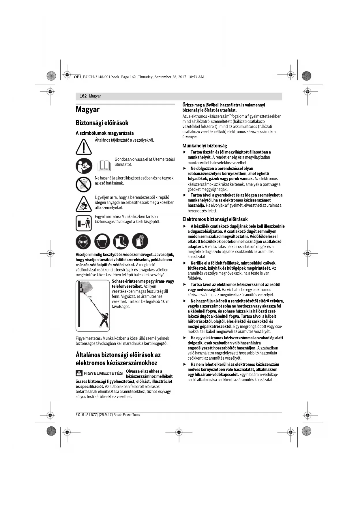 Súly az „EPTA-Procedure 01:2014” (01:2014 EPTA-eljárás) szerint kg 0,38 Érintésvédelmi osztály / II Akkumulátoros teleszkópos sövényvágó olló UniversalHedge Pole 18 OBJ_BUCH-3148-001.book Page 167 Thursday, September 28, 2017 10:53 AM168 | Magyar F 016 L81 577 | (28.9.17) Bosch Power Tools Az ezen előírásokban megadott rezgésszint az EN 60335 szabványban rögzített mérési módszerrel került meghatározásra és az elektromos kéziszerszámok összehasonlítására ez az érték felhasználható. Ez az érték a rezgési terhelés ideiglenes becslésére is alkalmas. A megadott rezgésszint az elektromos kéziszerszám fő alkalmazási területein való használat során fellépő érték. Ha az elektromos kéziszerszámot más alkalmazásokra, különböző tartozékokkal vagy nem kielégítő karbantartás mellett használják, a rezgésszint a fenti értéktől eltérhet. Ez az egész munkaidőre vonatkozó rezgési terhelést lényegesen megnövelheti. A rezgési terhelés pontos megbecsüléséhez figyelembe kell venni azokat az időszakokat is, amikor a berendezés kikapcsolt állapotban van, vagy amikor be van ugyan kapcsolva, de nem kerül ténylegesen használatra. Ez az egész munkaidőre vonatkozó rezgési terhelést lényegesen csökkentheti. Hozzon kiegészítő biztonsági intézkedéseket a kezelőnek a rezgések hatása elleni védelmére, például: Az elektromos kéziszerszám és a betétszerszámok karbantartása, a kezek melegen tartása, a munkamenetek megszervezése. Felszerelés és üzemeltetés Üzembevétel Az Ön biztonságáért A készüléken végzendő minden munka (például karbantartás, szerszámcsere, stb.) megkezdése előtt, valamint szállításhoz és tároláshoz vegye ki az akkumulátort a készülékből. Ha a be-/kikapcsolót a reteszelőgombbal akaratlanul bekapcsolják, sérülésveszély áll fenn. A sövényvágó olló kikapcsolása után a kések a másodperc néhány töredékéig még tovább mozognak. Ne érjen hozzá a mozgó késekhez. Csak akkor működtesse a kapcsolót, ha az akkumulátor teljesen be van tolva. Az akkumulátor behelyezése/kivétele (lásd a D + K ábrát) Megjegyzés: Ha nem megfelelő akkumulátorok kerülnek alkalmazásra, ez működési hibákhoz vagy a berendezés megrongálódásához vezethet. Tegye be a feltöltött 13 akkumulátort a teleszkópos fogantyúba. Gondoskodjon arról, hogy az akkumulátor teljesen be legyen tolva A 13 akkumulátornak a berendezésből való kivételéhez nyomja meg a 14 akkumulátor reteszelés feloldó gombot és húzza az akkumulátort előre, a késgerenda felé. Az akkumulátor feltöltése Ne használjon más töltőkészüléket. A kerti kisgéppel szállított töltőkészülék pontosan az Ön kerti kisgépébe beszerelt Li-ion-akkumulátorra van méretezve. Ügyeljen a helyes hálózati feszültségre! Az áramforrás feszültségének meg kell egyeznie a töltőkészülék típustábláján található adatokkal. A 230 V-os töltőkészülékeket 220 V hálózati feszültségről is szabad üzemeltetni. Az akkumulátor egy hőmérsékletellenőrző berendezéssel van felszerelve, amely az akkumulátor töltését csak 0 °C és 45 °C közötti hőmérséklet esetén teszi lehetővé. Ez igen magas akkumulátor-élettartamot biztosít. Megjegyzés: Az akkumulátor félig feltöltve kerül kiszállításra. Az akkumulátor teljes teljesítményének biztosítására az első alkalmazás előtt töltse fel teljesen az akkumulátort a töltő- készülékben. A Li-ion-akkumulátort bármikor fel lehet tölteni anélkül, hogy ez megrövidítené az élettartamát. A töltési folyamat megszakítása nem árt az akkumulátornak. A lithium-ionos-akkumulátort az „Electronic Cell Protection (ECP)” védi a túl erős kisülés ellen. Ha az akkumulátor kimerült, a kerti kisgépet egy védőkapcsoló kikapcsolja: A kerti kisgép ekkor nem működik tovább. A kerti kisgép automatikus kikapcsolása után ne nyomja tovább a be-/kikapcsolót. Ez megrongálhatja az akkumulátort. Vegye figyelembe az akkumulátornak a hulladékba való eltávolítással kapcsolatos előírásait. A töltési folyamat A töltési folyamat azonnal megkezdődik, mihelyt bedugja a töltőkészülék hálózati csatlakozó dugóját a dugaszoló aljzatba és a akkumulátort a akkumulátor-töltőkosárba. Az intelligens töltési eljárás alkalmazásának eredményeképpen a készülék automatikusan felismeri az akkumulátor töltési szintjét és az akkumulátor A tevékenység célja Ábra Oldal Az ábrázolásra kerülő komponensek A 320 Szállítmány tartalma B 321 A készülék összeszerelése C 321 Az akkumulátor beszerelése D 321 A tartóheveder rögzítése E 322 A teleszkóp magasságának beállítása F 322 A késvédő eltávolítása A késtartó gerenda kenése G 323 Az elfordítható fej beállítása H 323 Be-/kikapcsolás I 324 Munkavégzési tanácsok J 324–325 Az akkumulátor kivétele K 326 A berendezés karbantartása és tárolása L 326 Tartozék kiválasztása