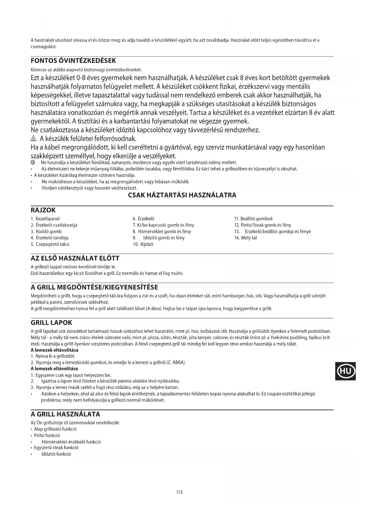 A grillező lapjait nedves kendővel törölje le. Első használatkor egy kicsit füstölhet a grill. Ez normális és hamar el fog múlni. A GRILL MEGDÖNTÉSE/KIEGYENESÍTÉSE Megdöntheti a grillt, hogy a csepegtető tálcára folyjon a zsír és a szaft, ha olyan ételeket süt, mint hamburger, hús, stb. Vagy használhatja a grill szintjét például a panini, szendvicsek sütéséhez. A grill megdöntéséhez nyissa fel a grill alatt található lábat (A ábra). Hajtsa be a talpat újra laposra, hogy kiegyenlítse a grillt. GRILL LAPOK A grill lapokat sok zsiradékot tartalmazó húsok sütéséhez lehet használni, mint pl. hús, kolbászok stb. Használja a grillsütőt ilyenkor a felemelt pozícióban. Mély tál - a mély tál nem zsíros ételek sütésére való, mint pl. pizza, sütés, tészták, pita kenyér, calzone, és tészták (mint pl. a Yorkshire pudding, tipikus brit étel). Használja a grillt ilyenkor vízszintes pozícióban. A felső csepegtető grill tál mindig fel kell legyen téve amikor használja a mély tálat. A lemezek eltávolítása