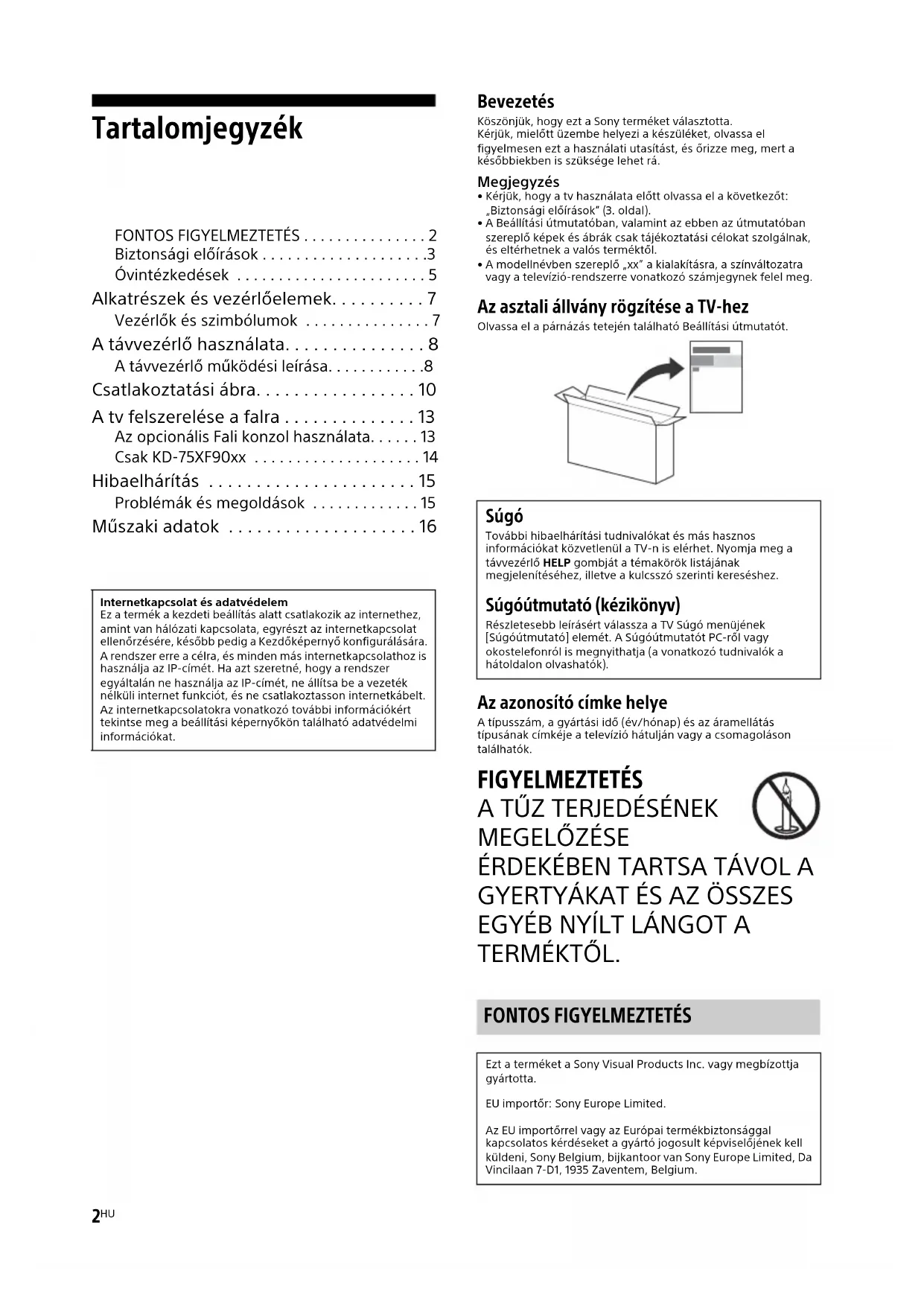 - Műszaki adatok Bevezetés Köszönjük, hogy ezt a Sony terméket választotta.Kérjük, mielőtt üzembe helyezi a készüléket, olvassa el figyelmesen ezt a használati utasítást, és őrizze meg, mert a későbbiekben is szüksége lehet rá.Megjegyzés• Kérjük, hogy a tv használata előtt olvassa el a következőt: „Biztonsági előírások” (3. oldal).• A Beállítási útmutatóban, valamint az ebben az útmutatóban szereplő képek és ábrák csak tájékoztatási célokat szolgálnak, és eltérhetnek a valós terméktől.• A modellnévben szereplő „xx” a kialakításra, a színváltozatra vagy a televízió-rendszerre vonatkozó számjegynek felel meg. Az asztali állvány rögzítése a TV-hez Olvassa el a párnázás tetején található Beállítási útmutatót. Az azonosító címke helye A típusszám, a gyártási idő (év/hónap) és az áramellátás típusának címkéje a televízió hátulján vagy a csomagoláson találhatók. FIGYELMEZTETÉS p. 16