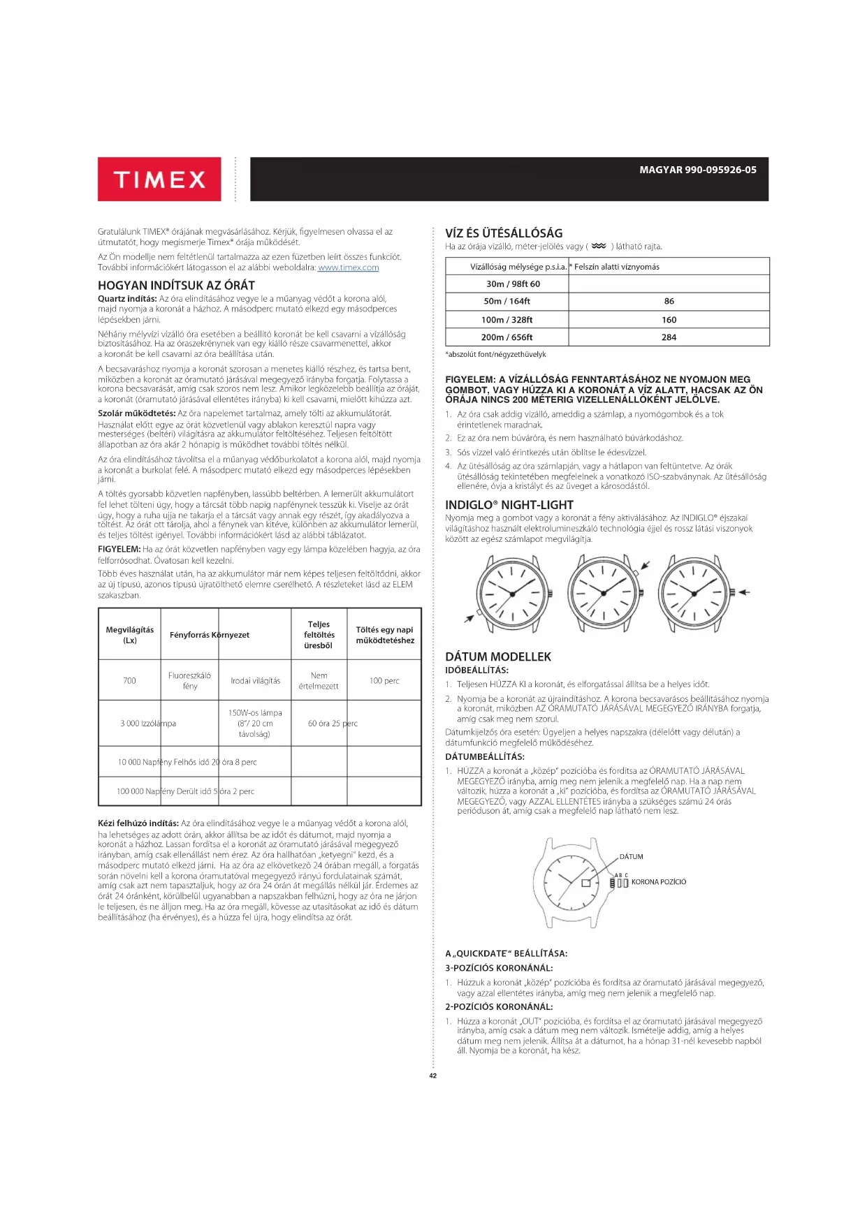 Quartz indítás: Az óra elindításához vegye le a műanyag védőt a korona alól, majd nyomja a koronát a házhoz. A másodperc mutató elkezd egy másodperces lépésekben járni. Néhány mélyvízi vízálló óra esetében a beállító koronát be kell csavarni a vízállóság biztosításához. Ha az óraszekrénynek van egy kiálló része csavarmenettel, akkor a koronát be kell csavarni az óra beállítása után. A becsavaráshoz nyomja a koronát szorosan a menetes kiálló részhez, és tartsa bent, miközben a koronát az óramutató járásával megegyező irányba forgatja. Folytassa a korona becsavarását, amíg csak szoros nem lesz. Amikor legközelebb beállítja az óráját, a koronát (óramutató járásával ellentétes irányba) ki kell csavarni, mielőtt kihúzza azt. Szolár működtetés: Az óra napelemet tartalmaz, amely tölti az akkumulátorát. Használat előtt egye az órát közvetlenül vagy ablakon keresztül napra vagy mesterséges (beltéri) világításra az akkumulátor feltöltéséhez. Teljesen feltöltött állapotban az óra akár 2 hónapig is működhet további töltés nélkül. Az óra elindításához távolítsa el a műanyag védőburkolatot a korona alól, majd nyomja a koronát a burkolat felé. A másodperc mutató elkezd egy másodperces lépésekben járni. A töltés gyorsabb közvetlen napfényben, lassúbb beltérben. A lemerült akkumulátort fel lehet tölteni úgy, hogy a tárcsát több napig napfénynek tesszük ki. Viselje az órát úgy, hogy a ruha ujja ne takarja el a tárcsát vagy annak egy részét, így akadályozva a töltést. Az órát ott tárolja, ahol a fénynek van kitéve, különben az akkumulátor lemerül, és teljes töltést igényel. További információkért lásd az alábbi táblázatot. FIGYELEM: Ha az órát közvetlen napfényben vagy egy lámpa közelében hagyja, az óra felforrósodhat. Óvatosan kell kezelni. Több éves használat után, ha az akkumulátor már nem képes teljesen feltöltődni, akkor az új típusú, azonos típusú újratölthető elemre cserélhető. A részleteket lásd az ELEM szakaszban. Megvilágítás (Lx) Fényforrás Környezet Teljes feltöltés üresből Töltés egy napi működtetéshez