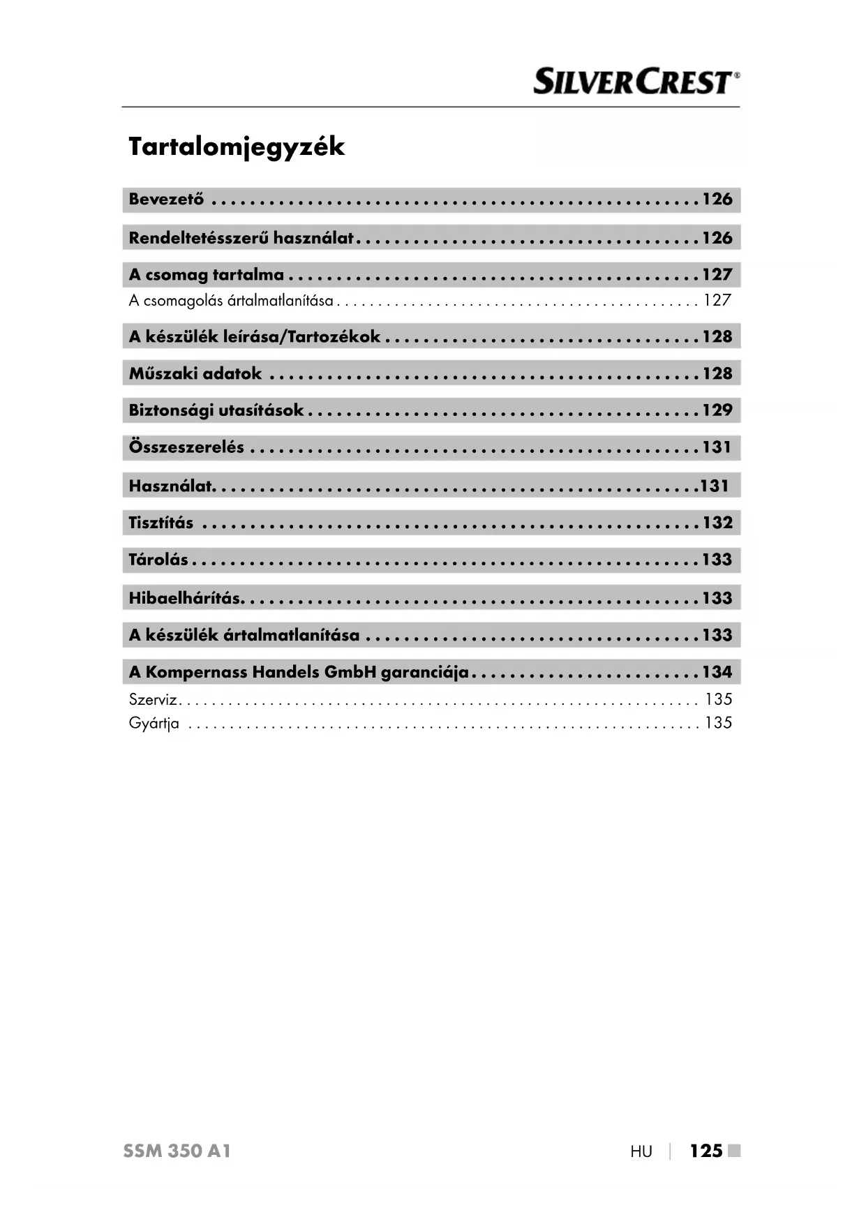HU SSM 350 A1 A Kompernass Handels GmbH garanciája Tisztelt Vásárlónk! A készülékre a vásárlás napjától számított 3 év garanciát vállalunk. A termék meghibásodása esetén. Önt jogszabályban foglalt jogok illetik meg az eladóval szemben. Az alábbi garanciánk nem korlátozza vagy szünteti meg a jogsza- bályban biztosított jogokat. Garanciális feltételek A garanciális időszak a vásárlás napján kezdődik. Gondosan őrizze meg a nyugtát. Ez a vásárlás igazolásához szükséges. Ha a termékvásárlás napjától számított három éven belül anyag- vagy gyár- tási hibát észlel, akkor a terméket saját belátásunk szerint ingyen megjavítjuk, kicseréljük vagy visszafizetjük az árát. A garancia feltétele a hibás készülék és a vásárlást igazoló bizonylat (pénztári blokk) három éves garanciaidőn belüli bemutatása, valamint a hiba lényegének és megjelenése idejének rövidleírása. Ha garanciánk fedezetet nyújt a hibára, akkor javított vagy egy új terméket kap vissza. A termék javítása vagy cseréje esetén a garancia nem kezdődik elölről. Garanciális idő és a jogszabályban foglalt szavatossági igények A garancia ideje nem hosszabbodik meg a jótállással. Ez a cserélt és javított alkatrészekre is vonatkozik. Az esetlegesen már a vásárláskor is fennálló sérülé- seket és hiányosságokat a kicsomagolás után azonnal jelezni kell. A garanciai lejárta után esedékes javítások díjkötelesek. A garancia köre A készüléket szigorú minőségi előírások szerint gyártottuk és kiszállítás előtt lelkiismeretesen ellenőriztük. A garancia anyag- vagy gyártási hibákra vonatkozik. A garancia nem terjed ki a termék normális elhasználódásnak kitett és ezért kopó alkatrészeknek tekinthető alkatrészeire vagy a törékeny alkatrészek – mint például kapcsolók, akkumuláto- rok vagy üvegből készült alkatrészek – sérüléseire. A garancia megszűnik akkor, ha a termék megsérül, nem megfelelően használják vagy nem tartják karban. A termék megfelelő használata érdekében a használati útmutatóban foglalt összes utasítást pontosan be kell tartani. Feltétlenül kerülni kell minden olyan felhasználási és kezelési módot, amit a használati útmutató nem javasol, vagy amelynek elkerülésére kifejezetten figyelmeztet. A termék csak magánhasználatra és nem ipari használatra készült. A garancia érvényét veszti visszaélésszerű vagy szakszerűtlen kezelés, erőszak alkalmazá- sa vagy olyan beavatkozások esetén, amelyeket általunk nem engedélyezett szervizben végeztek el.HU