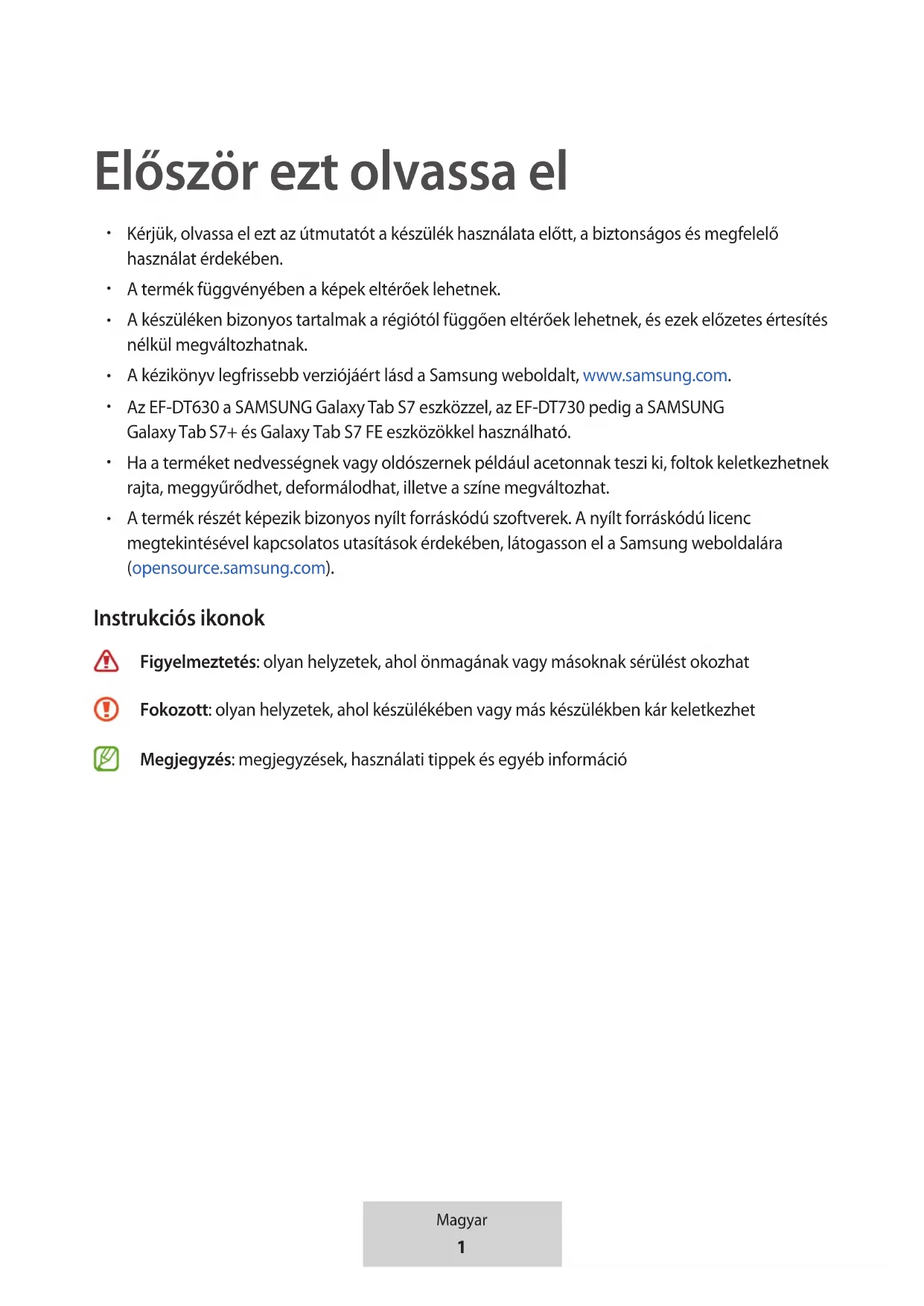 A termék részét képezik bizonyos nyílt forráskódú szoftverek. A nyílt forráskódú licenc megtekintésével kapcsolatos utasítások érdekében, látogasson el a Samsung weboldalára (opensource.samsung.com). Instrukciós ikonok Figyelmeztetés: olyan helyzetek, ahol önmagának vagy másoknak sérülést okozhat Fokozott: olyan helyzetek, ahol készülékében vagy más készülékben kár keletkezhet Megjegyzés: megjegyzések, használati tippek és egyéb információ2 Magyar Használatbavétel A csomag tartalma