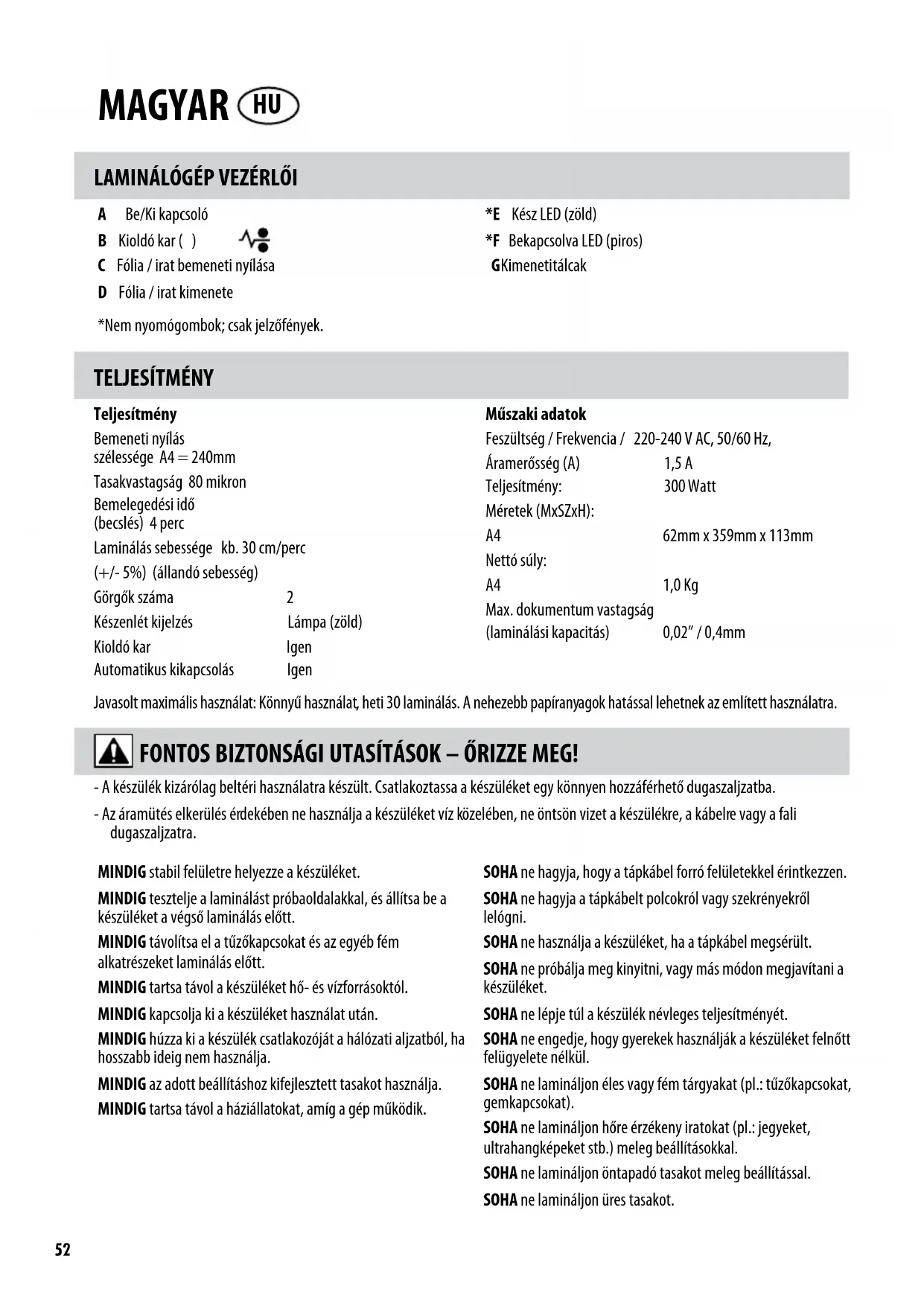 Teljesítmény Bemeneti nyílás szélessége A4 = 240mm Tasakvastagság 80 mikron Bemelegedési idő (becslés) 4 perc Laminálás sebessége kb. 30 cm/perc (+/- 5%) (állandó sebesség) Görgők száma 2 Készenlét kijelzés Lámpa (zöld) Kioldó kar Igen Automatikus kikapcsolás Igen Műszaki adatok Feszültség / Frekvencia / 220-240 V AC, 50/60 Hz, Áramerősség (A) 1,5 A Teljesítmény: 300 Watt Méretek (MxSZxH): A4 62mm x 359mm x 113mm Nettó súly: A4 1,0 Kg Max. dokumentum vastagság (laminálási kapacitás) 0,02” / 0,4mm - A készülék kizárólag beltéri használatra készült. Csatlakoztassa a készüléket egy könnyen hozzáférhető dugaszaljzatba. - Az áramütés elkerülés érdekében ne használja a készüléket víz közelében, ne öntsön vizet a készülékre, a kábelre vagy a fali dugaszaljzatra. MINDIG stabil felületre helyezze a készüléket. MINDIG tesztelje a laminálást próbaoldalakkal, és állítsa be a készüléket a végső laminálás előtt. MINDIG távolítsa el a tűzőkapcsokat és az egyéb fém alkatrészeket laminálás előtt. MINDIG tartsa távol a készüléket hő- és vízforrásoktól. MINDIG kapcsolja ki a készüléket használat után. MINDIG húzza ki a készülék csatlakozóját a hálózati aljzatból, ha hosszabb ideig nem használja. MINDIG az adott beállításhoz kifejlesztett tasakot használja. MINDIG tartsa távol a háziállatokat, amíg a gép működik. SOHA ne hagyja, hogy a tápkábel forró felületekkel érintkezzen. SOHA ne hagyja a tápkábelt polcokról vagy szekrényekről lelógni. SOHA ne használja a készüléket, ha a tápkábel megsérült. SOHA ne próbálja meg kinyitni, vagy más módon megjavítani a készüléket. SOHA ne lépje túl a készülék névleges teljesítményét. SOHA ne engedje, hogy gyerekek használják a készüléket felnőtt felügyelete nélkül. SOHA ne lamináljon éles vagy fém tárgyakat (pl.: tűzőkapcsokat, gemkapcsokat). SOHA ne lamináljon hőre érzékeny iratokat (pl.: jegyeket, ultrahangképeket stb.) meleg beállításokkal. SOHA ne lamináljon öntapadó tasakot meleg beállítással. SOHA ne lamináljon üres tasakot. MAGYAR