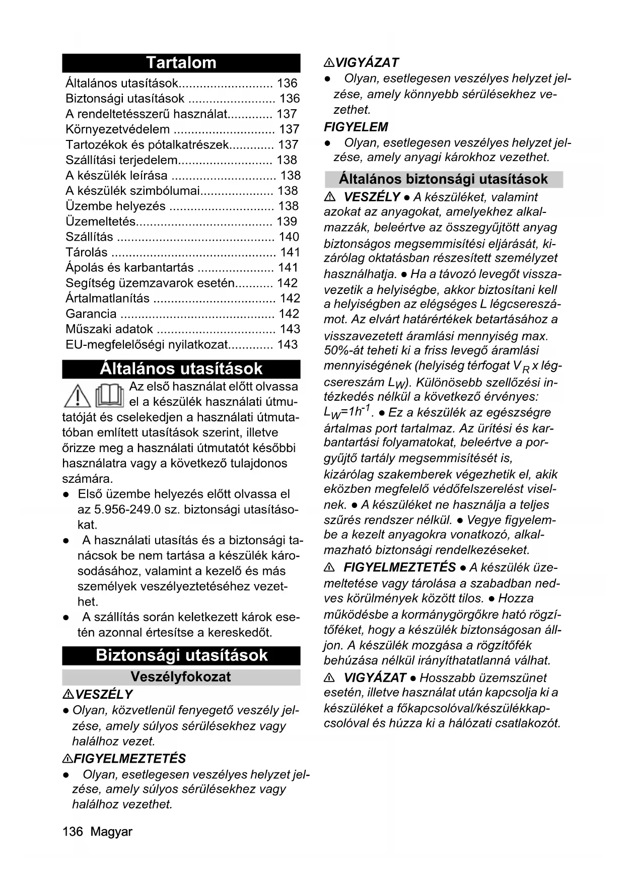 Długość kabla m 10136 Magyar Tartalom Általános utasítások Az első használat előtt olvassa el a készülék használati útmu- tatóját és cselekedjen a használati útmuta- tóban említett utasítások szerint, illetve őrizze meg a használati útmutatót későbbi használatra vagy a következő tulajdonos számára. ● Első üzembe helyezés előtt olvassa el az 5.956-249.0 sz. biztonsági utasításo- kat. ● A használati utasítás és a biztonsági ta- nácsok be nem tartása a készülék káro- sodásához, valamint a kezelő és más személyek veszélyeztetéséhez vezet- het. ● A szállítás során keletkezett károk ese- tén azonnal értesítse a kereskedőt. Biztonsági utasítások Veszélyfokozat VESZÉLY ● Olyan, közvetlenül fenyegető veszély jel- zése, amely súlyos sérülésekhez vagy halálhoz vezet. 몇 FIGYELMEZTETÉS ● Olyan, esetlegesen veszélyes helyzet jel- zése, amely súlyos sérülésekhez vagy halálhoz vezethet. 몇 VIGYÁZAT ● Olyan, esetlegesen veszélyes helyzet jel- zése, amely könnyebb sérülésekhez ve- zethet. FIGYELEM ● Olyan, esetlegesen veszélyes helyzet jel- zése, amely anyagi károkhoz vezethet. Általános biztonsági utasítások VESZÉLY ● A készüléket, valamint azokat az anyagokat, amelyekhez alkal- mazzák, beleértve az összegyűjtött anyag biztonságos megsemmisítési eljárását, ki- zárólag oktatásban részesített személyzet használhatja. ● Ha a távozó levegőt vissza- vezetik a helyiségbe, akkor biztosítani kell a helyiségben az elégséges L légcsereszá- mot. Az elvárt határértékek betartásához a visszavezetett áramlási mennyiség max. 50%-át teheti ki a friss levegő áramlási mennyiségének (helyiség térfogat V