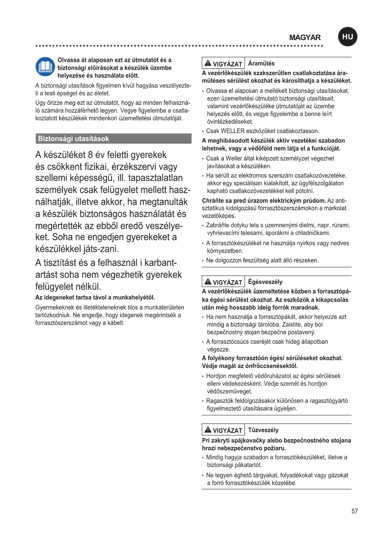 MAGYAR58 Spjkovačku uschovajte na bezpečnom mieste. A használatonkívülikészülékeketésszerszámokatszáraz, magasanfekvő,vagyzárt,gyermekekáltalelnemérhető helyenkelltárolni.Anemhasználtforrasztószerszámot kapcsoljafeszültség-ésnyomásmenteshelyzetbe. A hlózati kbelt csak az erre megfelelő hlózati csatlakozó aljzatba vagy adapterbe szabad bedugni. Ellenőrizze,hogymegegyezik-eahálózatifeszültséga típustáblaadataival.Csakkikapcsoltállapotbancsatlakoztas- sa a készüléket a csatlakozó aljzatba. Kbel nepoužívajte na čely, na ktoré nie je určený.A készüléketsohaneemeljefelavezetéknélfogva.Kábel nepoužívajtenavyťahovaniezástrčkyzozásuvky.Kábel chráňteprehorúčavou,olejmiaostrýmihranami. Buďte opatrný. Figyeljenodaarra,amitcsinál.Körültekinté- sselvégezzeamunkáját.Spájkovačkunepoužívajte,keďste nekoncentrovaný. Vyhnite sa neobvyklému držaniu tela. Svoje pracovisko usporiadajteergonomicky.Ügyeljenarra,hogyhelyesen tartsaaszerszámotmunkavégzésközben,mertahelytelen tartássérülésekhezvezethet. A forrasztószerszmot csak műszakilag kifogstalan állapotban szabad üzemeltetni.Avédőberendezéseket nemszabadüzemenkívülhelyezni. Az üzemzavarokat és hibákat azonnal el kell hárítani. A készülék/szerszámhasználataelőttgondosanellenőrizze avédőberendezésekhibátlanésmegfelelőműködését. Ellenőrizze,hogyamozgóalkatrészekkifogástalanul működnek-eésnemszorulnak-e,vagynemsérültek-eazal- katrészek.Akészülékkifogástalanműködésénekelőfeltétele, hogyazegyesalkatrészekmegfelelőenlegyenekösszesze- relve, és megfeleljenek minden feltételnek. A megfelelő szerszmot hasznlja. Csakatartozéklistán szereplővagyagyártóáltalengedélyezetttartozékokatvagy kiegészítőeszközökethasználja.AWELLERtartozékokat vagykiegészítőeszközöketcsakeredetiWELLERkés- zülékekenhasználja.Másszerszámokésmástartozékok használatasérülésveszélytjelenthetazÖnszámára. Biztosítsa a szerszámot.Amunkadarabrögzítéséhez használjonbefogószerkezeteket. Használja a forrasztási füstelszívót. Ha rendelkezésre állnakaberendezésekaforrasztásifüst-elszívócsatlakozta- tásához,győződjönmegezekcsatlakoztatásáróléshelyes használatáról. Rendeltetésszerű hasznlat TápegységWELLERforrasztóeszközökhöz.Aforrasztóbe- rendezéstkizárólagahasználatiútmutatóbanmegnevezett célra,vagyisforrasztásrahasználjaazittmegadottfeltételek mellett. Ezakészülékcsakszobahőmérsékletenésbeltérbenhasz- nálható.Óvjanedvességtőlésközvetlennapsugárzástól.