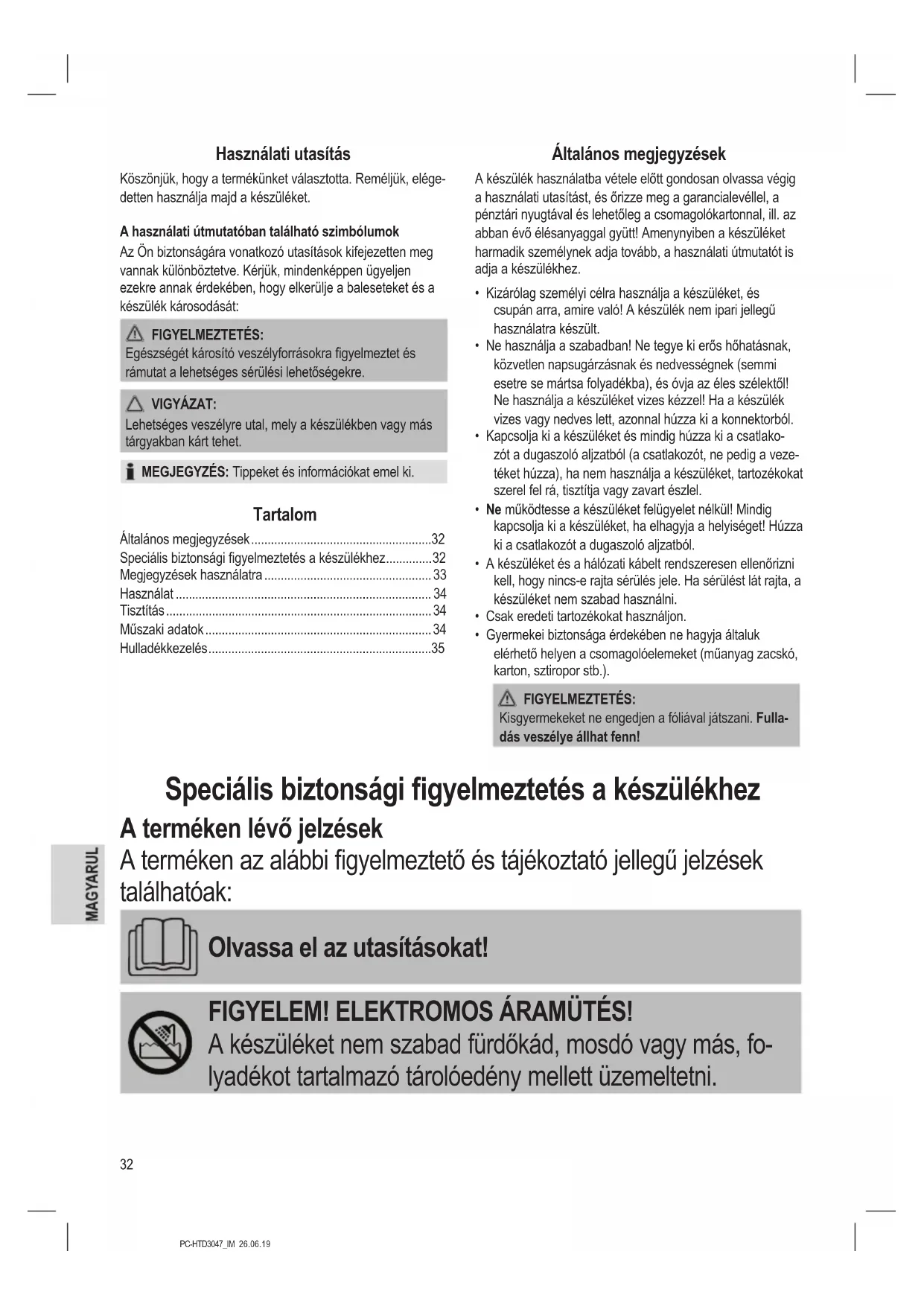 - Gyermekei biztonsága érdekében ne hagyja általuk elérhető helyen a csomagolóelemeket (műanyag zacskó, karton, sztiropor stb.). FIGYELMEZTETÉS: Kisgyermekeket ne engedjen a fóliával játszani. Fulla- dás veszélye állhat fenn! Speciális biztonsági gyelmeztetés a készülékhez A terméken lévő jelzések A terméken az alábbi gyelmeztető és tájékoztató jellegű jelzések találhatóak: Olvassa el az utasításokat! FIGYELEM! ELEKTROMOS ÁRAMÜTÉS! A készüléket nem szabad fürdőkád, mosdó vagy más, fo- lyadékot tartalmazó tárolóedény mellett üzemeltetni.33 PC-HTD3047_IM 26.06.19 FIGYELMEZTETÉS: