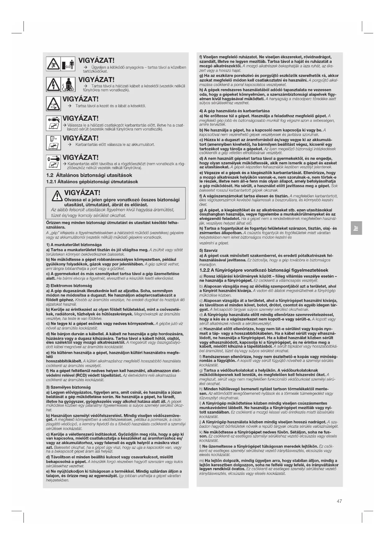 VIGYÁZAT! Olvassa el a jelen gépre vonatkozó összes biztonsági utasítást, útmutatást, ábrát és előírást. Az alább felsorolt utasítások gyelmen kívül hagyása áramütést, tüzet és/vagy komoly sérülést okozhat. Őrizzen meg minden biztonsági útmutatást és utasítást későbbi felha- sználásra. A „gép” kifejezés a gyelmeztetésekben a hálózatról működő (vezetékes) gépekre vagy az akkumulátorról (vezeték nélküli) működő gépekre vonatkozik.