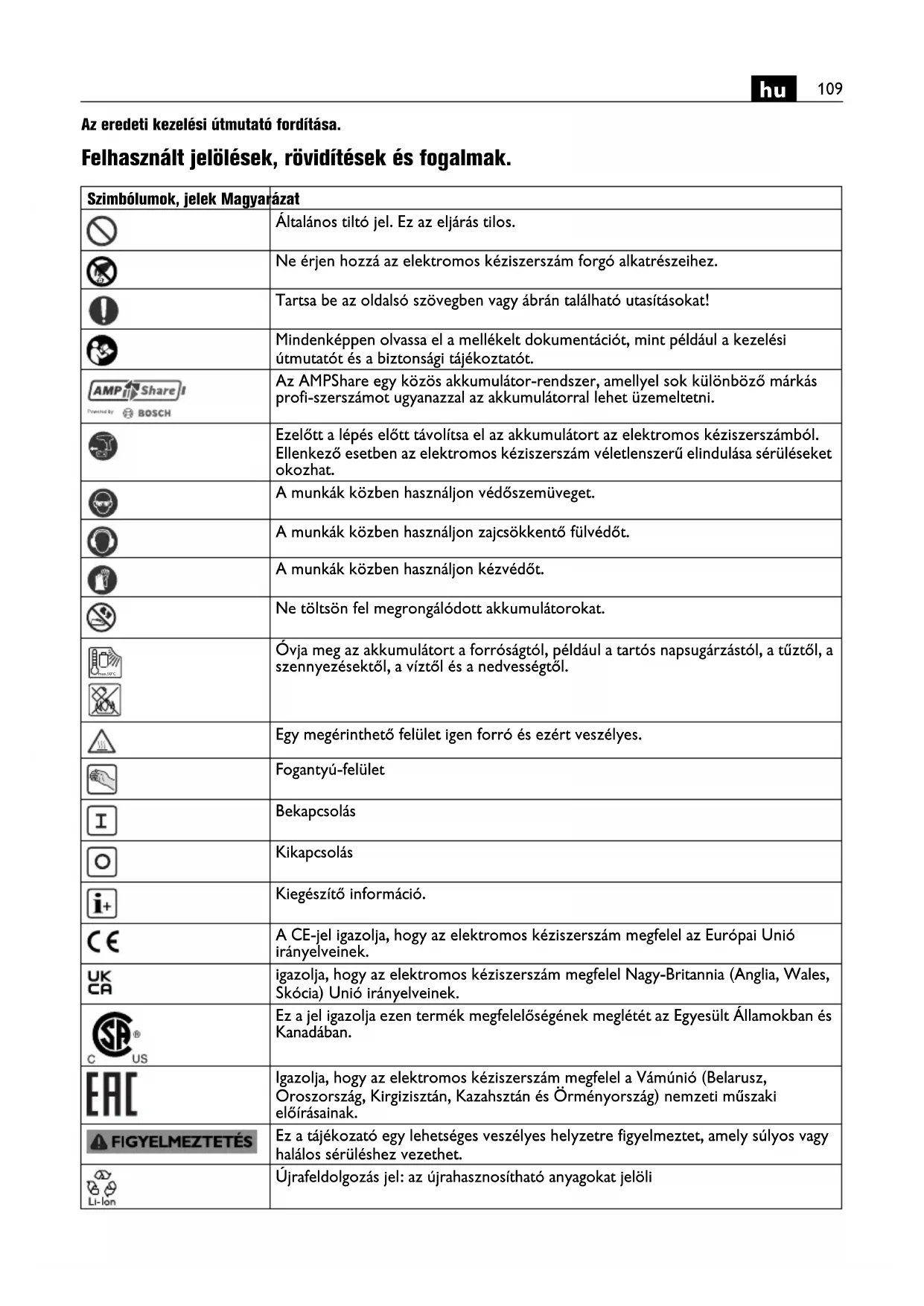 Az eredeti kezelési útmutató fordítása. Felhasznált jelölések, rövidítések és fogalmak. Szimbólumok, jelek Magyarázat Általános tiltó jel. Ez az eljárás tilos. Ne érjen hozzá az elektromos kéziszerszám forgó alkatrészeihez. Tartsa be az oldalsó szövegben vagy ábrán található utasításokat! Mindenképpen olvassa el a mellékelt dokumentációt, mint például a kezelési útmutatót és a biztonsági tájékoztatót. Az AMPShare egy közös akkumulátor-rendszer, amellyel sok különböző márkás profi-szerszámot ugyanazzal az akkumulátorral lehet üzemeltetni. Ezelőtt a lépés előtt távolítsa el az akkumulátort az elektromos kéziszerszámból. Ellenkező esetben az elektromos kéziszerszám véletlenszerű elindulása sérüléseket okozhat. A munkák közben használjon védőszemüveget. A munkák közben használjon zajcsökkentő fülvédőt. A munkák közben használjon kézvédőt. Ne töltsön fel megrongálódott akkumulátorokat. Óvja meg az akkumulátort a forróságtól, például a tartós napsugárzástól, a tűztől, a szennyezésektől, a víztől és a nedvességtől. Egy megérinthető felület igen forró és ezért veszélyes. Fogantyú-felület Bekapcsolás Kikapcsolás Kiegészítő információ. A CE-jel igazolja, hogy az elektromos kéziszerszám megfelel az Európai Unió irányelveinek. igazolja, hogy az elektromos kéziszerszám megfelel Nagy-Britannia (Anglia, Wales, Skócia) Unió irányelveinek. Ez a jel igazolja ezen termék megfelelőségének meglétét az Egyesült Államokban és Kanadában. Igazolja, hogy az elektromos kéziszerszám megfelel a Vámúnió (Belarusz, Oroszország, Kirgizisztán, Kazahsztán és Örményország) nemzeti műszaki előírásainak. Ez a tájékozató egy lehetséges veszélyes helyzetre figyelmeztet, amely súlyos vagy halálos sérüléshez vezethet. Újrafeldolgozás jel: az újrahasznosítható anyagokat jelöli max.50°C110