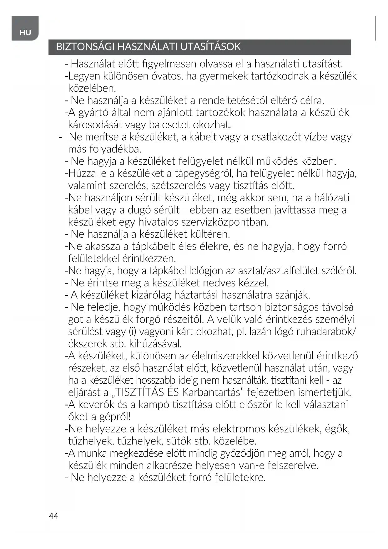 A készüléket, különösen az élelmiszerekkel közvetlenül érintkező részeket, az első használat elő, közvetlenül használat után, vagy ha a készüléket hosszabb ideig nem használták, sztani kell - az eljárást a „TISZTÍTÁS ÉS Karbantartás” fejezetben ismertetjük.