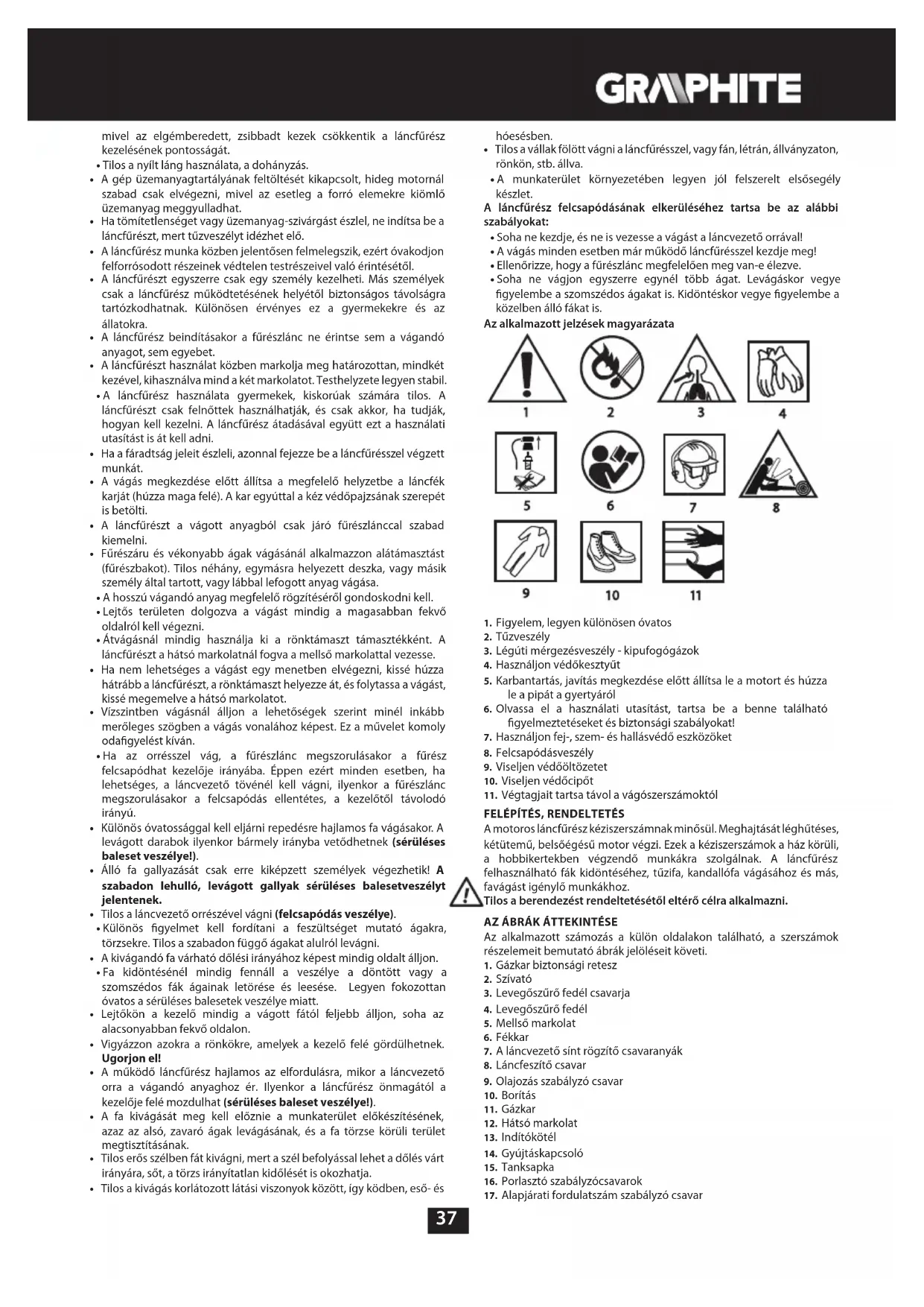 - Tilos a vállmagasság fölötti vágás. Kerülni kell a láncvezető orrészével a vágást, ez hirtelen hátra, fel irányuló visszacsapódást válthat ki. Munkavégzés közben használja a láncfűrészt teljes felszereléssel és viseljen megfelelő munkaruhát. A biztonsági felszerelések leszerelése, a nem megfelelő kezelés, karbantartás, a helytelenül kicserélt láncvezető vagy fűrészlánc mind hozzájárulhatnak a sérülésveszély növekedéséhez egy esetleges visszacsapódás során. Tilos bármiféle átalakítást végezni a láncfűrészen. A láncfűrész meg nem engedett átalakítása esetén elvész a jótálláshoz való jog. A jótállás elvesztését okozza a láncfűrész jelen használati utasításban foglaltakkal ellentétes használata.