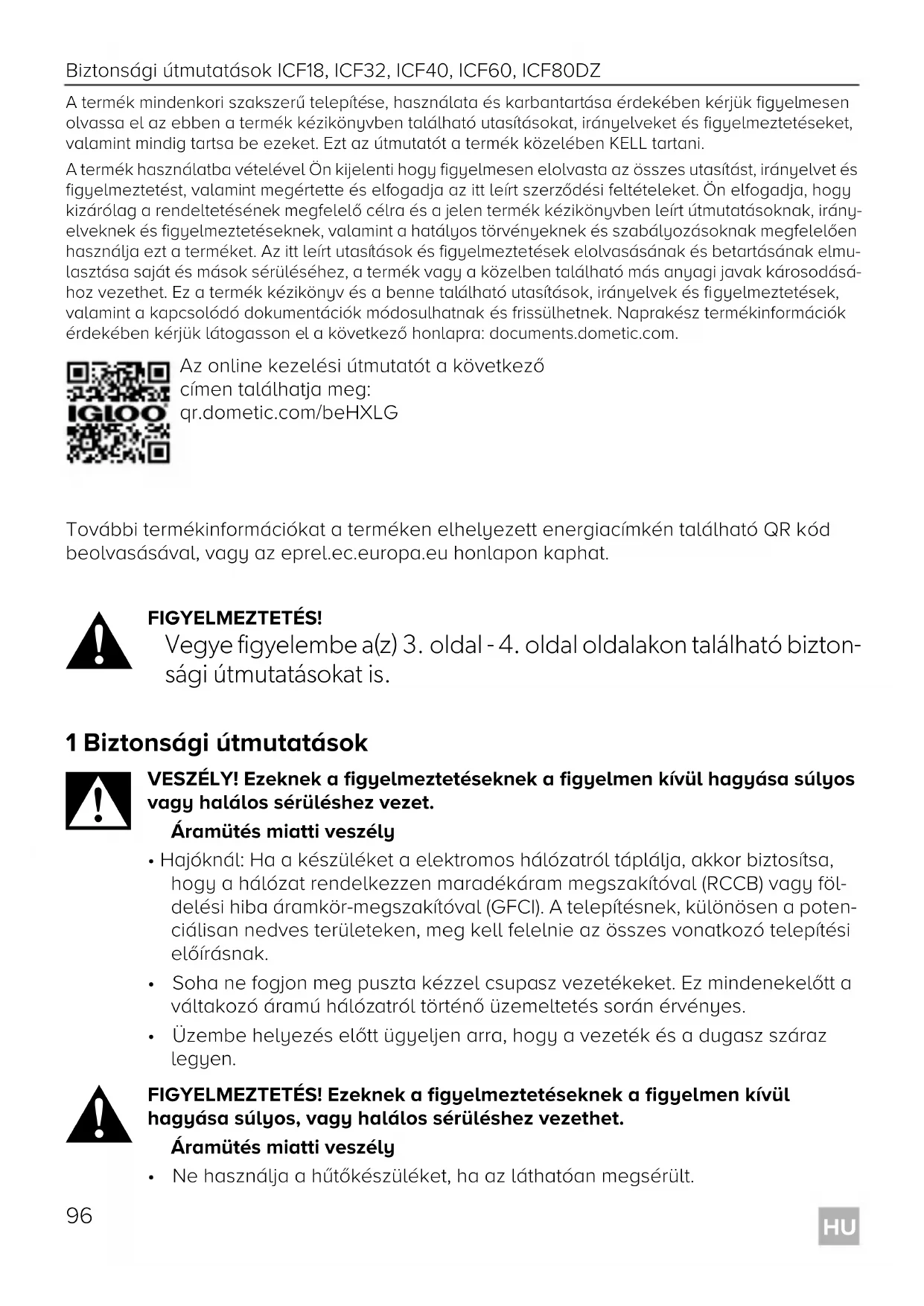 - Ne használja a hűtőkészüléket, ha az láthatóan megsérült. Az online kezelési útmutatót a következő címen találhatja meg: qr.dometic.com/beHXLG Igloo ICF18, ICF32, ICF40, ICF60, ICF80DZ_ SOM_4445103836_ EMEA24-ar _202x-xx-xx.book Page 96 Friday, September 15, 2023 12:50 PMICF18, ICF32, ICF40, ICF60, ICF80DZ Biztonsági útmutatások