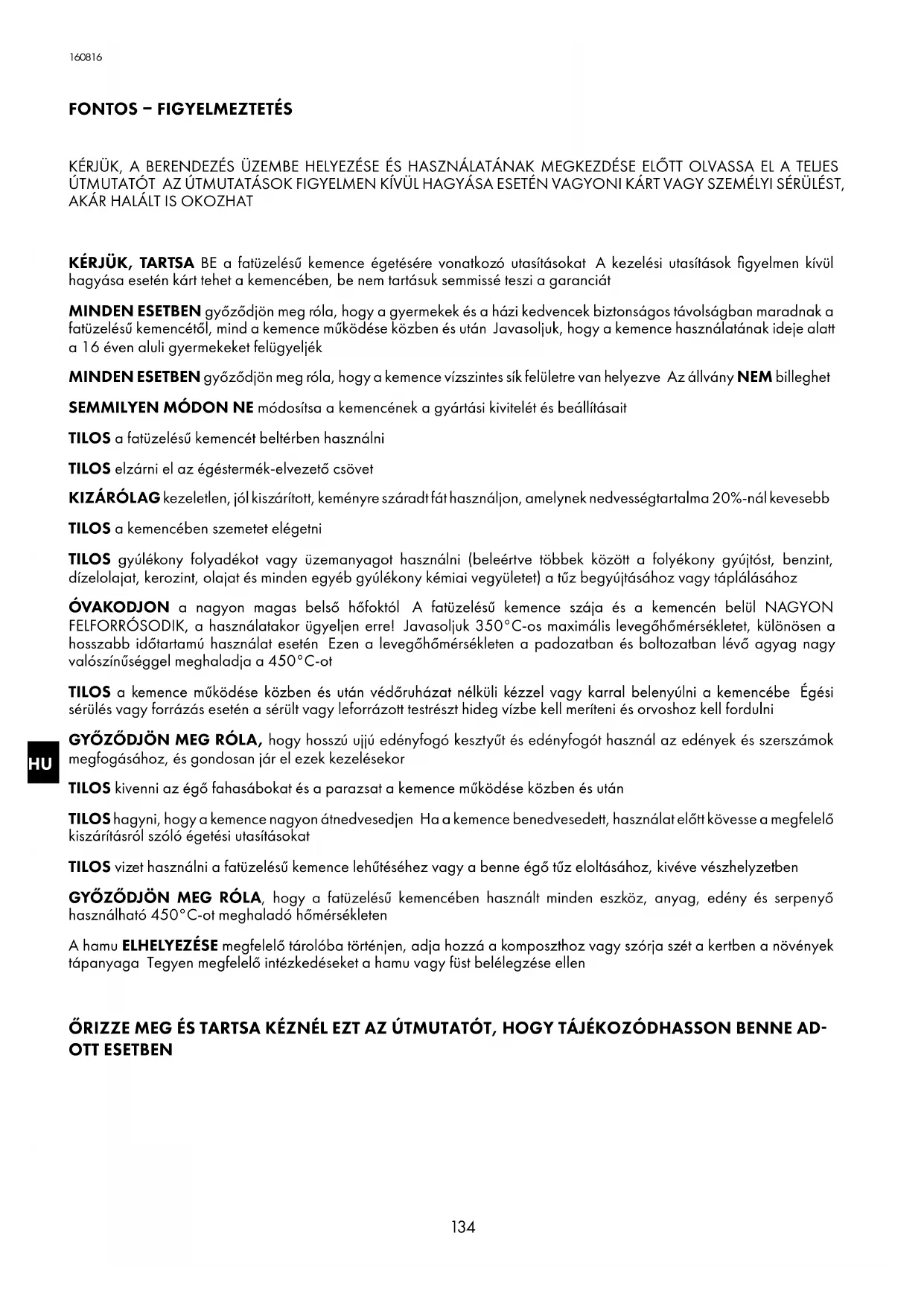 KÉRJÜK, TARTSA BE a fatüzelésű kemence égetésére vonatkozó utasításokat A kezelési utasítások figyelmen kívül hagyása esetén kárt tehet a kemencében, be nem tartásuk semmissé teszi a garanciát MINDEN ESETBEN győződjön meg róla, hogy a gyermekek és a házi kedvencek biztonságos távolságban maradnak a fatüzelésű kemencétől, mind a kemence működése közben és után Javasoljuk, hogy a kemence használatának ideje alatt a 16 éven aluli gyermekeket felügyeljék MINDEN ESETBEN győződjön meg róla, hogy a kemence vízszintes sík felületre van helyezve Az állvány NEM billeghet SEMMILYEN MÓDON NE módosítsa a kemencének a gyártási kivitelét és beállításait TILOS a fatüzelésű kemencét beltérben használni TILOS elzárni el az égéstermék-elvezető csövet KIZÁRÓLAG kezeletlen, jól kiszárított, keményre száradt fát használjon, amelynek nedvességtartalma 20%-nál kevesebb TILOS a kemencében szemetet elégetni TILOS gyúlékony folyadékot vagy üzemanyagot használni (beleértve többek között a folyékony gyújtóst, benzint, dízelolajat, kerozint, olajat és minden egyéb gyúlékony kémiai vegyületet) a tűz begyújtásához vagy táplálásához ÓVAKODJON a nagyon magas belső hőfoktól A fatüzelésű kemence szája és a kemencén belül NAGYON FELFORRÓSODIK, a használatakor ügyeljen erre! Javasoljuk 350°C-os maximális levegőhőmérsékletet, különösen a hosszabb időtartamú használat esetén Ezen a levegőhőmérsékleten a padozatban és boltozatban lévő agyag nagy valószínűséggel meghaladja a 450°C-ot TILOS a kemence működése közben és után védőruházat nélküli kézzel vagy karral belenyúlni a kemencébe Égési sérülés vagy forrázás esetén a sérült vagy leforrázott testrészt hideg vízbe kell meríteni és orvoshoz kell fordulni GYŐZŐDJÖN MEG RÓLA, hogy hosszú ujjú edényfogó kesztyűt és edényfogót használ az edények és szerszámok megfogásához, és gondosan jár el ezek kezelésekor TILOS kivenni az égő fahasábokat és a parazsat a kemence működése közben és után TILOS hagyni, hogy a kemence nagyon átnedvesedjen Ha a kemence benedvesedett, használat előtt kövesse a megfelelő kiszárításról szóló égetési utasításokat TILOS vizet használni a fatüzelésű kemence lehűtéséhez vagy a benne égő tűz eloltásához, kivéve vészhelyzetben GYŐZŐDJÖN MEG RÓLA, hogy a fatüzelésű kemencében használt minden eszköz, anyag, edény és serpenyő használható 450°C-ot meghaladó hőmérsékleten A hamu ELHELYEZÉSE megfelelő tárolóba történjen, adja hozzá a komposzthoz vagy szórja szét a kertben a növények tápanyaga Tegyen megfelelő intézkedéseket a hamu vagy füst belélegzése ellen ŐRIZZE MEG ÉS TARTSA KÉZNÉL EZT AZ ÚTMUTATÓT, HOGY TÁJÉKOZÓDHASSON BENNE AD- OTT ESETBEN