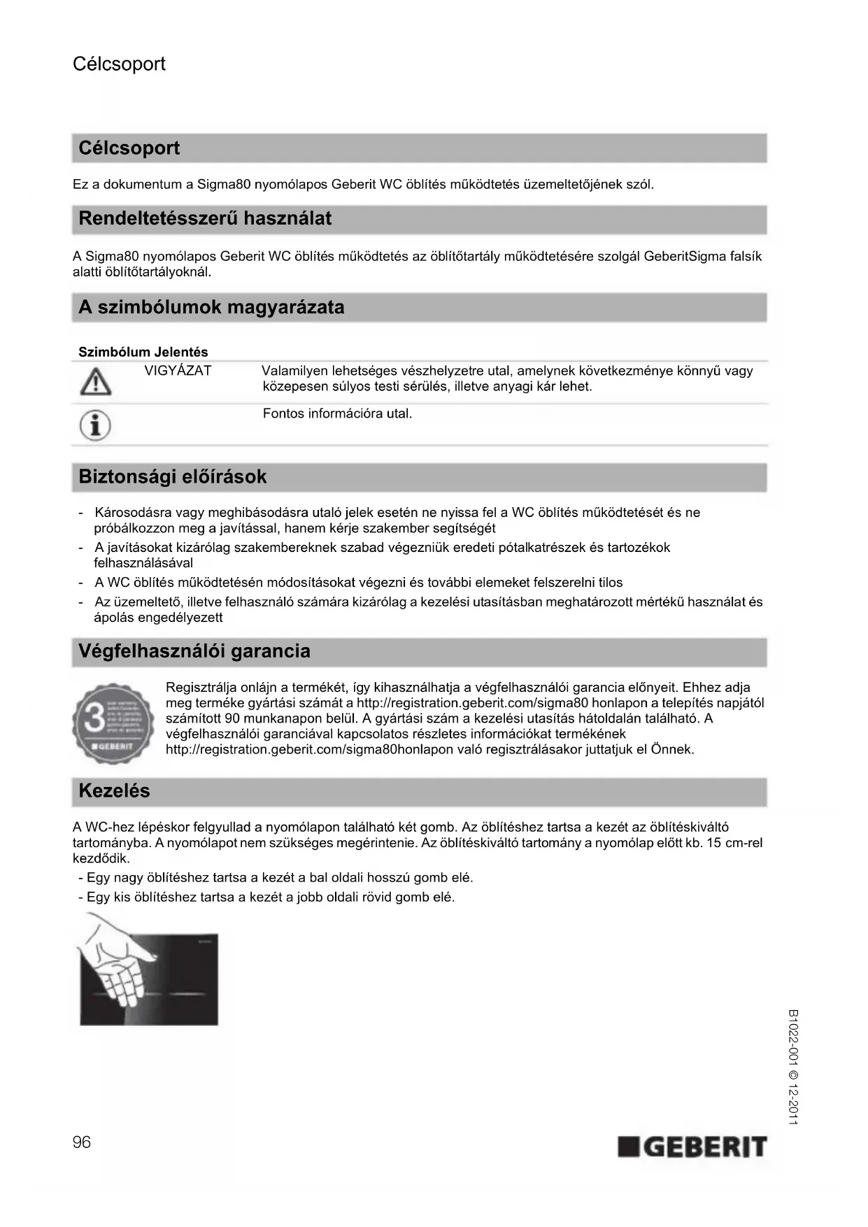 Materiał Niniejszy produkt jest zgodny z wymogami dyrektywy 2002/95/EG RoHS (Ograniczenie użycia substancji niebezpiecznych w urządzeniach elektrycznych i elektronicznych). Utylizacja W oparciu o dyrektywę 2002/96/EG WEEE (Utylizacja zużytego sprzętu elektrycznego i elektronicznego) producenci urządzeń elektrycznych zobowiązani są do odbioru starego sprzętu i jego właściwej utylizacji. Ten symbol informuje, że dany produkt nie może być utylizowany razem z pozostałymi odpadami. W celu prawidłowej utylizacji, zużyte urządzenia należy zwracać bezpośrednio do firmy Geberit. Adresy punktów, w których można dokonać zwrotu starych urządzeń, są dostępne u dystrybutora firmy Geberit lub na stronie internetowej www.geberit.com. Pielęgnacja Czyszczenie przycisku uruchamiającego UWAGA Żrące i szorujące środki czyszczące mogą uszkodzić powierzchnię. Nie używać środków czyszczących zawierających chlor lub kwas, środków polerujących lub żrących ` Wyczyścić przycisk uruchamiający łagodnym środkiem czyszczącym i wodą. ` Użyć wilgotnej ściereczki. Do czyszczenia przycisku uruchamiającego firma Geberit zaleca zestaw do czyszczenia Geberit AquaClean (numer artykułu 242.547.00.1). Utylizacja96 Célcsoport B1022-001 © 12-2011 Ez a dokumentum a Sigma80 nyomólapos Geberit WC öblítés működtetés üzemeltetőjének szól. A Sigma80 nyomólapos Geberit WC öblítés működtetés az öblítőtartály működtetésére szolgál GeberitSigma falsík alatti öblítőtartályoknál. - Károsodásra vagy meghibásodásra utaló jelek esetén ne nyissa fel a WC öblítés működtetését és ne próbálkozzon meg a javítással, hanem kérje szakember segítségét - A javításokat kizárólag szakembereknek szabad végezniük eredeti pótalkatrészek és tartozékok felhasználásával - A WC öblítés működtetésén módosításokat végezni és további elemeket felszerelni tilos - Az üzemeltető, illetve felhasználó számára kizárólag a kezelési utasításban meghatározott mértékű használat és ápolás engedélyezett Regisztrálja onlájn a termékét, így kihasználhatja a végfelhasználói garancia előnyeit. Ehhez adja meg terméke gyártási számát a http://registration.geberit.com/sigma80 honlapon a telepítés napjától számított 90 munkanapon belül. A gyártási szám a kezelési utasítás hátoldalán található. A végfelhasználói garanciával kapcsolatos részletes információkat termékének http://registration.geberit.com/sigma80honlapon való regisztrálásakor juttatjuk el Önnek. A WC-hez lépéskor felgyullad a nyomólapon található két gomb. Az öblítéshez tartsa a kezét az öblítéskiváltó tartományba. A nyomólapot nem szükséges megérintenie. Az öblítéskiváltó tartomány a nyomólap előtt kb. 15 cm-rel kezdődik. - Egy nagy öblítéshez tartsa a kezét a bal oldali hosszú gomb elé. - Egy kis öblítéshez tartsa a kezét a jobb oldali rövid gomb elé. Célcsoport Rendeltetésszerű használat A szimbólumok magyarázata Szimbólum Jelentés VIGYÁZAT Valamilyen lehetséges vészhelyzetre utal, amelynek következménye könnyű vagy közepesen súlyos testi sérülés, illetve anyagi kár lehet. Fontos információra utal. Biztonsági előírások Végfelhasználói garancia KezelésBeállítások B1022-001 © 12-2011
