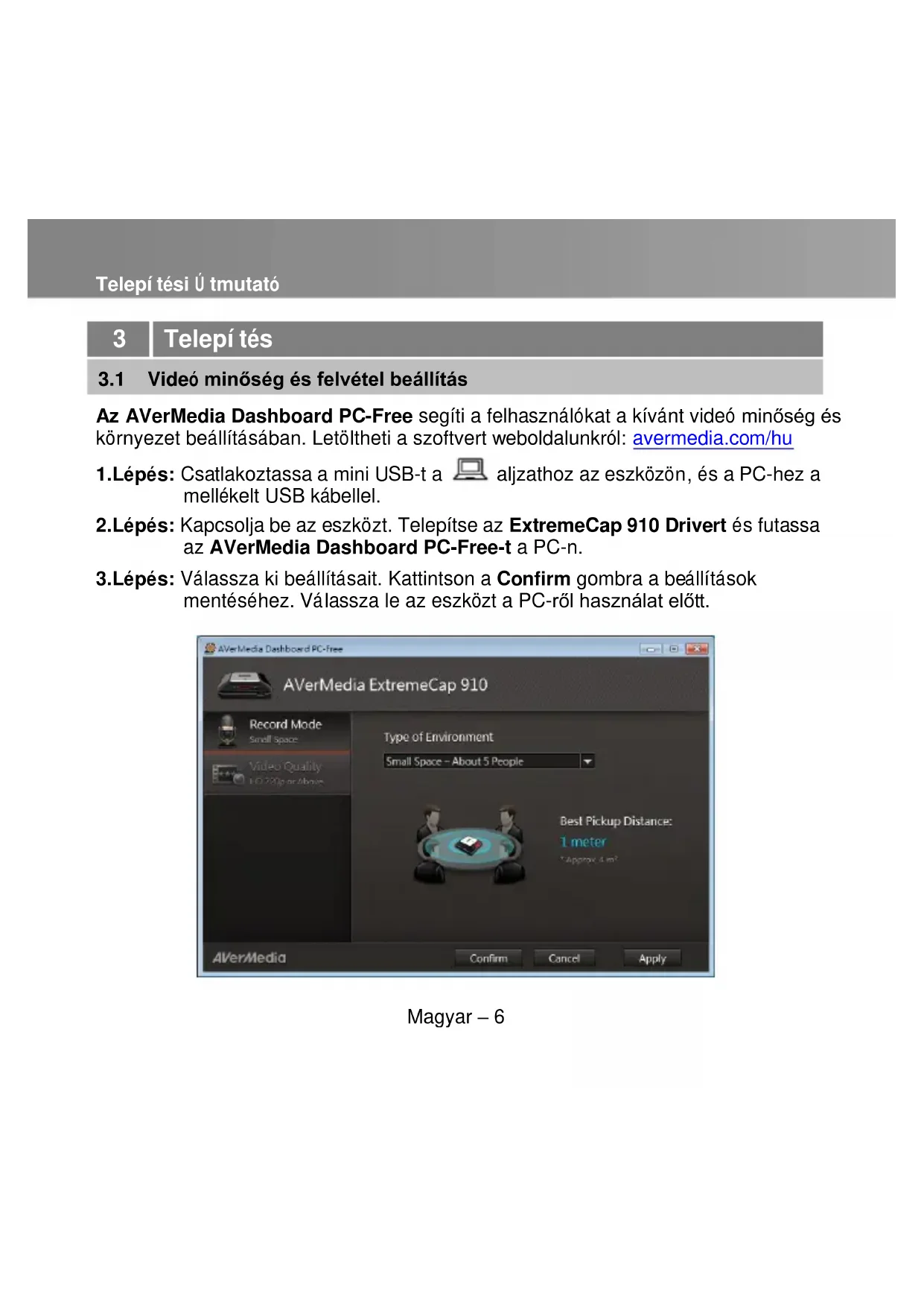 Az AVerMedia Dashboard PC-Free segíti a felhasználókat a kívánt videó minőség és környezet beállításában. Letöltheti a szoftvert weboldalunkról: avermedia.com/hu 1.Lépés: Csatlakoztassa a mini USB-t a aljzathoz az eszközön, és a PC-hez a mellékelt USB kábellel. 2.Lépés: Kapcsolja be az eszközt. Telepítse az ExtremeCap 910 Drivert és futassa az AVerMedia Dashboard PC-Free-t a PC-n. 3.Lépés: Válassza ki beállításait. Kattintson a Confirm gombra a beállítások mentéséhez. Válassza le az eszközt a PC-ről használat előtt.Telepítési Ú tmutató Magyar – 7