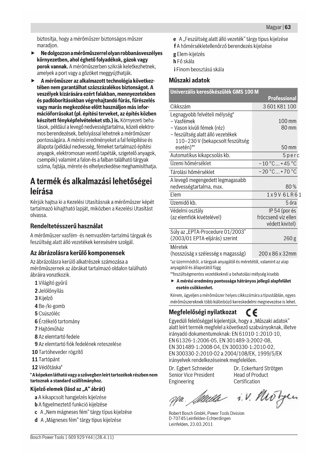 - A képeken látható vagy a szövegben leírt tartozékok részben nem tartoznak a standard szállítmányhoz. Kijelző elemek (lásd az „A” ábrát) a A kikapcsolt hangjelzés kijelzése b A figyelmeztető funkció kijelzése c A „Nem mágneses fém” tárgy típus kijelzése d A „Mágneses fém” tárgy típus kijelzése e A „Feszültség alatt álló vezeték” tárgy típus kijelzése f A hőmérsékletellenőrző berendezés kijelzése g Elem-kijelzés h Fő skála i Finom beosztású skála Műszaki adatok Megfelelőségi nyilatkozat Egyedüli felelőséggel kijelentjük, hogy a „Műszaki adatok” alatt leírt termék megfelel a következő szabványoknak, illetve irányadó dokumentumoknak: EN 61010-1:2010-10, EN 61326-1:2006-05, EN 301489-3:2002-08, EN 301489-1:2008-04, EN 300330-1:2010-02, EN 300330-2:2010-02 a 2004/108/EK, 1999/5/EK irányelvek rendelkezéseinek megfelelően. Robert Bosch GmbH, Power Tools Division D-70745 Leinfelden-Echterdingen Leinfelden, 23.03.2011 Univerzális keresőkészülék GMS 100 M Professional Cikkszám 3 601 K81 100 Legnagyobb felvételi mélység* – Vasfémek – Vason kívüli fémek (réz) – feszültség alatt álló vezetékek 110–230 V (bekapcsolt feszültség esetén)** 100 mm 80 mm 50 mm Automatikus kikapcsolás kb. 5perc Üzemi hőmérséklet –10 °C...+45 °C Tárolási hőmérséklet –20 °C...+70 °C A levegő megengedett legmagasabb nedvességtartalma, max. 80 % Elem 1x9V 6LR61 Üzemidő kb. 5óra Védelmi osztály (az elemfiók kivételével) IP 54 (por és fröccsenő víz ellen védett kivitel) Súly az „EPTA-Procedure 01/2003” (2003/01 EPTA-eljárás) szerint 260 g Méretek (hosszúság x szélesség x magasság) 200 x 86 x 32mm *az üzemmódtól, a tárgyak anyagától és méretétől, valamint az alap anyagától és állapotától függ**feszültségmentes vezetékeknél a behatolási mélység kisebb f A mérési eredmény pontossága hátrányos jellegű alapfelület esetén csökkenhet. Kérem, ügyeljen a mérőműszer helyes cikkszámára a típustáblán, egyes mérőműszereknek több különböző kereskedelmi megnevezése is lehet. Dr. Egbert Schneider Senior Vice President Engineering Dr. Eckerhard Strötgen Head of Product Certification OBJ_BUCH-1418-001.book Page 63 Thursday, April 28, 2011 9:54 AM64 | Magyar 1 609 929 Y44 | (28.4.11) Bosch Power Tools Összeszerelés Elem behelyezése/kicserélése A mérőműszer üzemeltetéséhez alkáli-mangánelemek használatát javasoljuk. A 8 elemfiók fedelének felnyításához nyomja el a nyíl által jelzett irányba a 9 reteszelést és hajtsa fel az akkumulátorfiók fedelét. Tegye be a készülékkel szállított elemet. Ügyeljen az elemfiók belső oldalán ábrázolt helyes polarítás betartására. A g akkumulátor kijelző mindig az akkumulátor pillanatnyi állapotát mutatja: – Az akkumulátor teljesen fel van töltve – Az akkumulátor kapacitása 2/3, vagy kevesebb – Az akkumulátor kapacitása 1/3, vagy kevesebb – Cserélje ki az akkumulátort f Vegye ki az elemet a mérőműszerből, ha hosszabb ideig nem használja. Az elem egy hosszabb tárolás során korrodálhat, vagy magától kimerülhet. Üzemeltetés f Óvja meg a mérőműszert a nedvességtől és a közvetlen napsugárzás behatásától. f Ne tegye ki a mérőműszert extrém hőmérsékleteknek vagy hőmérsékletingadozásoknak. Nagyobb hőmér- sékletingadozások után hagyja a mérőműszert temperálódni, mielőtt azt bekapcsolná. Extrém hőmér- sékletek vagy hőmérsékletingadozások esetén a mérőműszer pontossága és a kijelzőn megjelenő értékek hibásakká válhatnak. f Ha a mérőműszer közelében adóberendezések vannak, például WLAN, UMTS, repülőtéri radar, rádióadó, vagy mikrohullámú berendezések, ez befolyással lehet a mérési funkcióra. Üzembevétel Be- és kikapcsolás f A mérőműszer bekapcsolása előtt győződjön meg arról, hogy a 6 érzékelő tartomány nem nedves. Szükség esetén egy kendővel dörzsölje szárazra a mérőműszert. f Ha a mérőműszert erős hőmérsékletváltozásoknak vetették alá, akkor a bekapcsolás előtt várja meg, amíg az megfelelően temperálódik. A mérőműszer bekapcsolásához nyomja meg a 4 be-/kikap- csoló billentyűt A mérőműszer kikapcsolásához nyomja meg ismét a 4 be-/kikapcsoló billentyűt. Ha a mérőműszeren kb. 5 percig egyik billentyűt sem nyomják meg, és nem detektálnak azzal tárgyakat, a mérőműszer az akkumulátor kímélésére automatikusan kikapcsol. A hangjelzés be- és kikapcsolása A hangjelzést bekapcsolt mérőműszeren a 4 be-/ki-gomb néhány másodperces benyomásával be vagy ki lehet kapcsolni. Kikapcsolt hangjelzés esetén a kijelzőben megjelenik az a jel. Működési mód (lásd az „A”–„B” ábrát) A mérőműszerrel a 6 érzékelő tartomány alatti alapot lehet a z mérési irányban a maximális érzékelési mélységig (lásd „Műszaki adatok”) megvizsgálni. A készülék olyan tárgyakat ismer fel, amelyek anyaga különbözik a fal anyagától. A mérőműszert mindig egyenes irányban, az alapra nem túl erős nyomással rányomva mozgassa az alap felett, anélkül, hogy felemelné az alapról vagy hogy megváltoztatná a beren- dezésre gyakorolt nyomást. A mérés közben az 5 csúszókáknak állandóan érintkezésben kell lenniük a vizsgált felülettel. Mérési folyamat A bekapcsolás után az 1 gyűrű zöld színben világít. Helyezze fel a mérőműszert a megvizsgálandó felületre és mozgassa az x- és y-tengely irányában. Ha a mérőműszer egy tárgyhoz közeledik, akkor a h fő skálán a kitérés növekszik és az 1 gyűrű sárga színben világít. Ha a mérőműszer távolodik a tárgytól, a kitérés csökken. Egy tárgy felett a h fő skála a legnagyobb kitérést mutatja; az 1 gyűrű piros színben világít és felhangzik egy hangjelzés. Kisebb, vagy