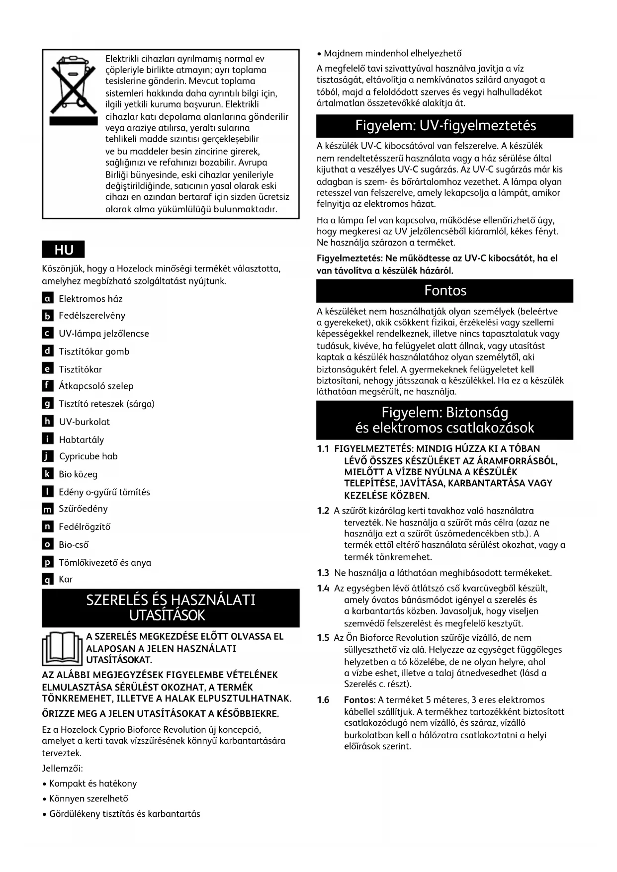 és az algásodás leáll) kikapcsolhatja az egységet. Majd távolítsa el, mossa át alaposan, tisztítsa és szárítsa meg, majd tárolja száraz és fagytól védett helyen. Mindig fedél nélkül tárolja az egységet, hogy gondoskodjon az elegendő szellőzésről és száradásról. Hibaelhárítás / GYIKquestions Probléma Lehetséges ok Elhárítás Nincs vízáramlás a szűrőn keresztül a tóba. A tápszivattyú nincs bekapcsolva vagy nem működik. Ellenőrizze, hogy a szivattyú működik-e és be van-e kapcsolva. Eltömődött a bevezető tömlő. Ellenőrizze, hogy nincs-e eltömődve a bevezető tömlő és a tóból visszatérő tömlő. Az átalakító szelep Hulladék állásba van állítva. Fordítsa az átalakító szelepet Tó állásba. Csökkentett áramlás a szűrőn keresztül Eltömődtek a habok. Tisztítsa meg a szűrőt (lásd a Tisztítás c. részt). Eltömődött a bevezető tömlő. Ellenőrizze, hogy nincs-e eltömődve a bevezető tömlő és a tóból visszatérő tömlő. A víz nem tiszta Az új szűrő még nem működik hatékonyan. A tó vizének tisztasága 2-3 héten belül kezd javulni, de a teljes biológiai érés akár 6-8 hetet is igénybe vehet, mielőtt a szűrő teljes mértékben hatékonnyá válik. Nem megfelelő a szűrő mérete a tóhoz. Ellenőrizze, hogy a tó kialakításának megfelelő szűrőt használ-e. Nem megfelelő a tápszivattyú mérete. Ellenőrizze az áramlási sebességet. Lásd a 2.2 részt. Nem ég az UV- lámpa. Ellenőrizze az UV jelzőlencsét. Cserélje ki az UV-lámpát. Régi az UV- lámpa. 12 havonta cserélje ki az UV-lámpát. A haboknak tisztításra van szükségük. Tisztítsa meg a szűrőt (lásd a Tisztítás c. részt). A tóból visszatérő tömlő kimenete a bevezető szivattyú felett van elhelyezve. Helyezze úgy a szivattyút és a tóból visszatérő tömlőt úgy, hogy azok minél távolabb legyenek egymástól. A tóban túl sok hal van. Csökkentse a tóban lévő halak számát. Túletetés. Csak annyi táplálékot adjon a halaknak, amennyit néhány perc alatt el tudnak fogyasztani. Naponta csak egyszer etessen.Probléma Lehetséges ok Elhárítás Nem forog a tisztítókar. A szivattyú működik a tisztítás kezdetén. Kapcsolja ki a szivattyút. Forgassa a kart mindkét irányba többször. Kapcsolja be a szivattyút (lásd a Tisztítás c. részt). Hozelock Cyprio tiszta vízre vonatkozó jótállás Ha Hozelock Cyprio Bioforce Revolution termékünket a megfelelő szivattyúval használja, GARANTÁLJUK, HOGY VIZE TISZTA LESZ, ELLENKEZŐ ESETBEN VISSZAFIZETJÜK PÉNZÉT. Ez a jótállás a vásárlást követő 12 hónap során érvényes, feltéve, ha