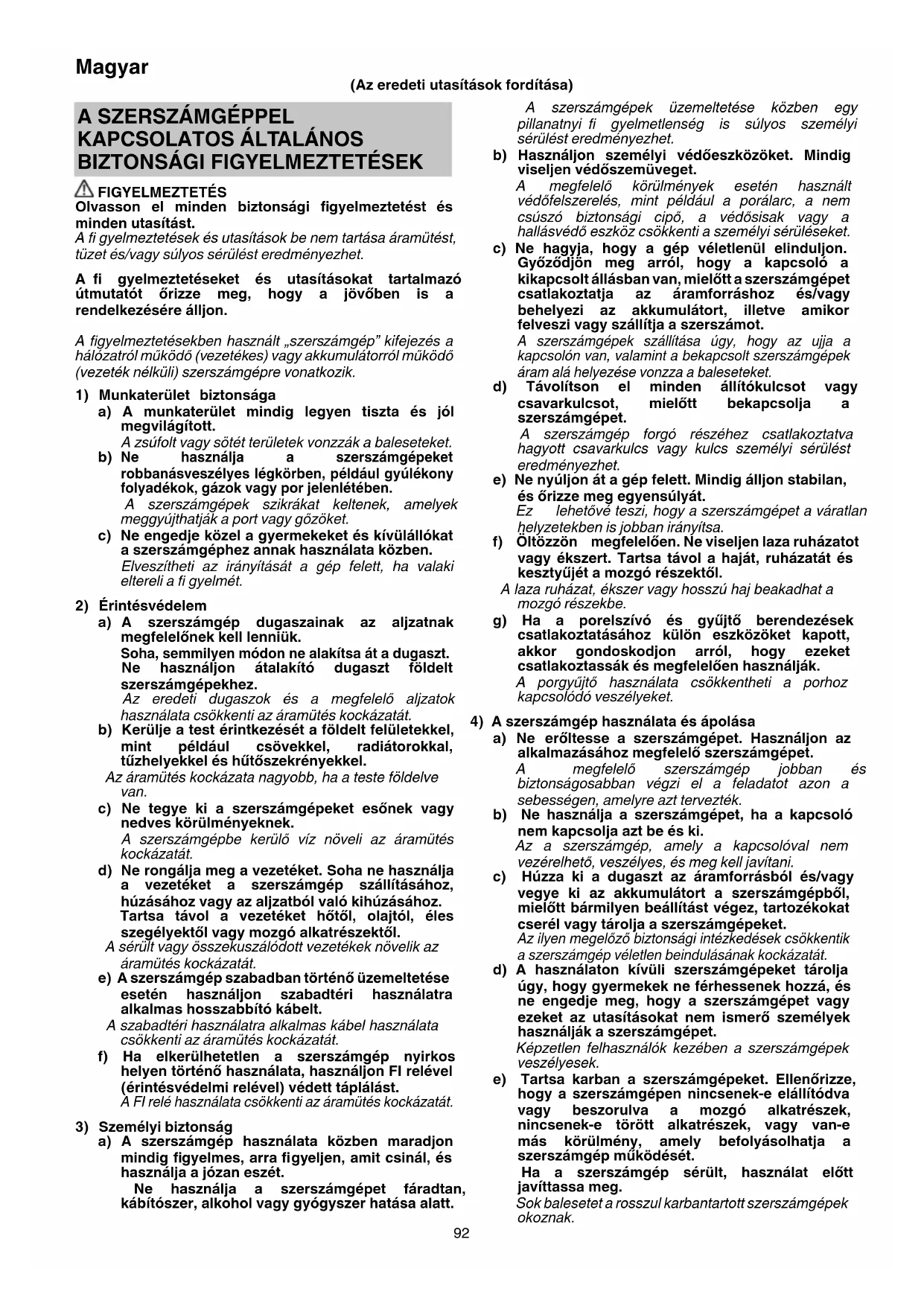 FIGYELMEZTETÉS Olvasson el minden biztonsági fi gyelmeztetést és minden utasítást. A fi gyelmeztetések és utasítások be nem tartása áramütést, tüzet és/vagy súlyos sérülést eredményezhet. A fi gyelmeztetéseket és utasításokat tartalmazó útmutatót őrizze meg, hogy a jövőben is a rendelkezésére álljon. A fi gyelmeztetésekben használt „szerszámgép” kifejezés a hálózatról működő (vezetékes) vagy akkumulátorról működő (vezeték nélküli) szerszámgépre vonatkozik.