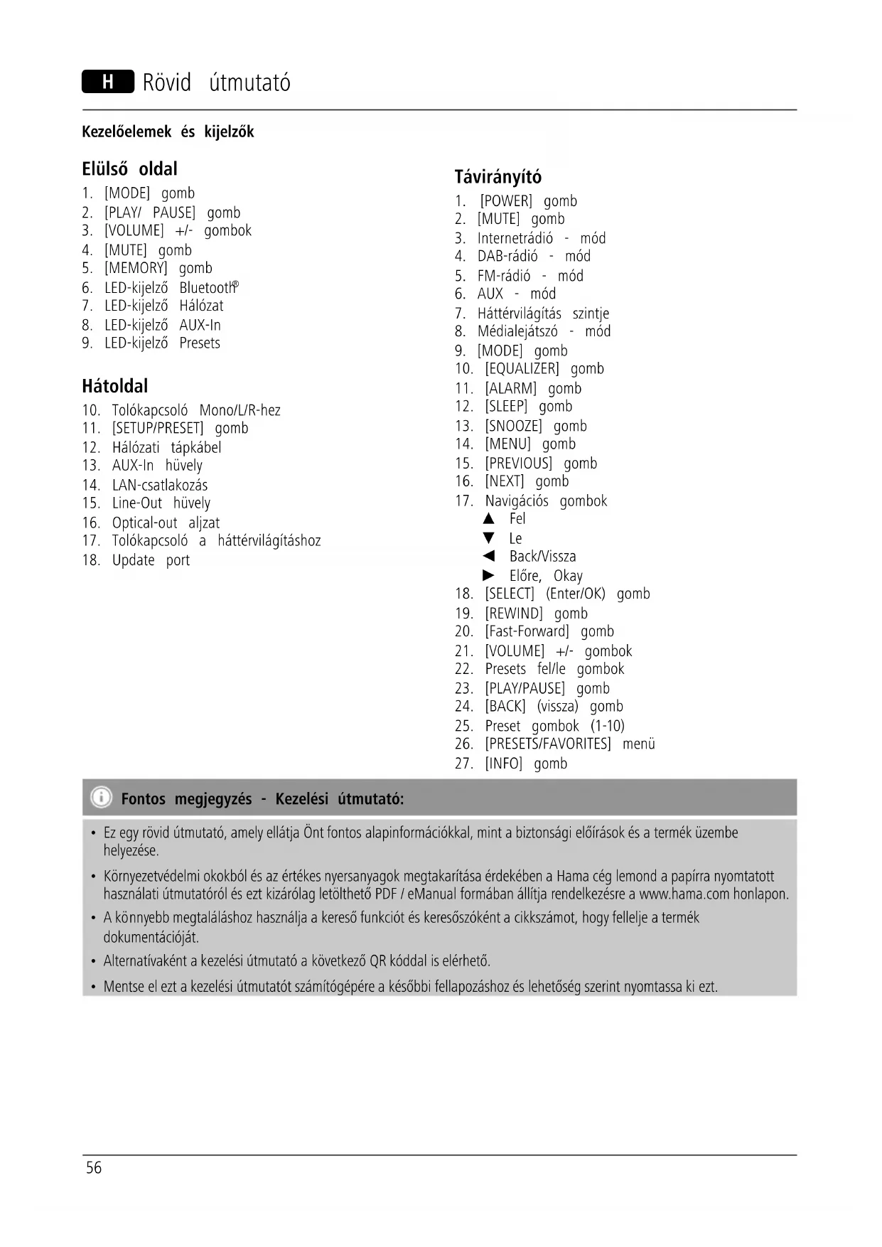 - Környezetvédelmi okokból és az értékes nyersanyagok megtakarítása érdekében a Hama cég lemond a papírra nyomtatott használati útmutatóról és ezt kizárólag letölthető PDF / eManual formában állítja rendelkezésre a www.hama.com honlapon.