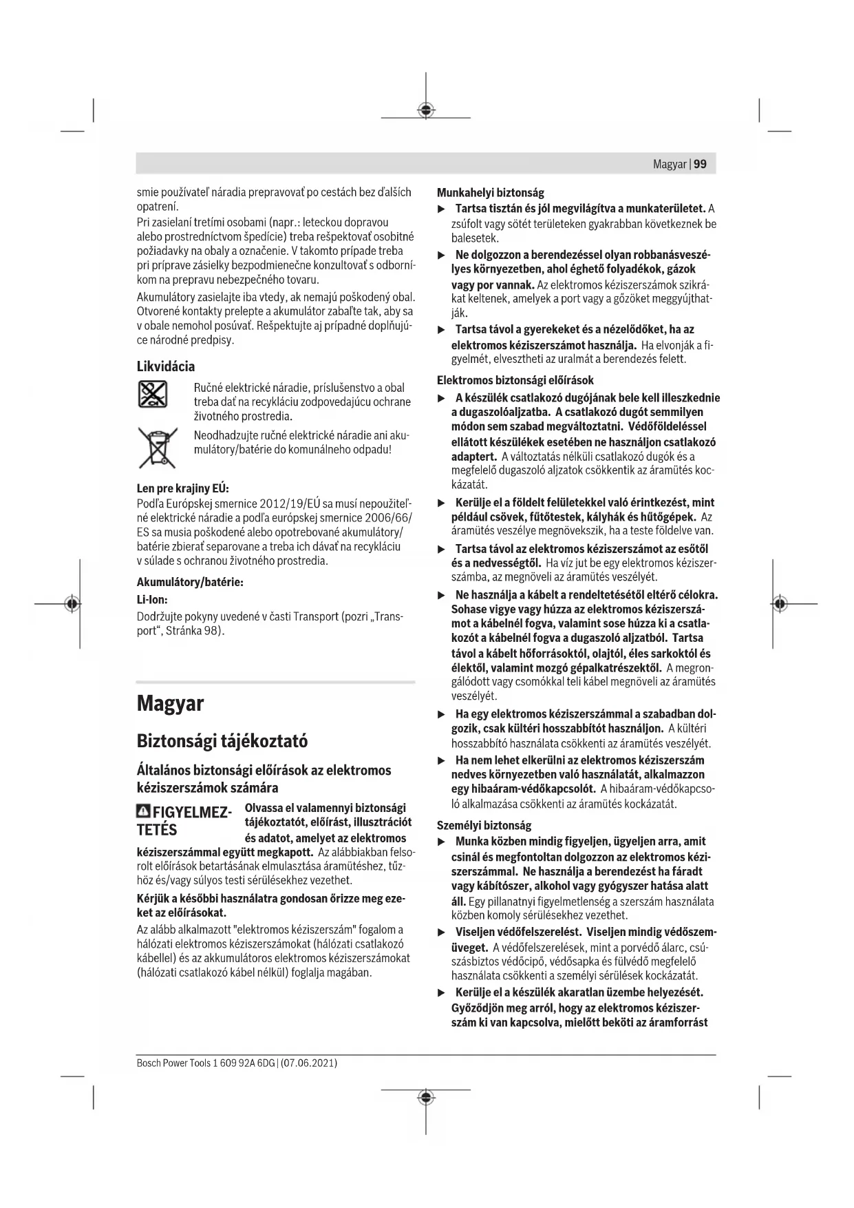 Magas fordulatszám tartomány, kis átmérőjű fúróval végzett munkákhoz. Ha a (4) fokozatváltó átkapcsolót nem lehet ütközésig eltol- ni, a fúrófejnél fogva forgassa kissé el a (1) szerszámbefogó egységet. Hőmérsékletfüggő túlterhelés elleni védelem Rendeltetésszerű használat esetén az elektromos kéziszer- számot nem lehet túlterhelni. Túl erős terhelés, vagy az akku- mulátor megengedett legmagasabb hőmérsékletének a túllé- pése esetén az elektronika kikapcsolja az elektromos kézi- szerszámot, amíg az vissza nem tér az optimális hőmérséklet tartományba. Be- és kikapcsolás Az elektromos kéziszerszám üzembe helyezéséhez nyomja be és tartsa benyomva a (12) be-/kikapcsolót. A (9) munkahely megvilágító lámpa világít kissé vagy telje- sen megnyomott (12) be-/kikapcsoló esetén világít és gon- doskodik arról, hogy a munkaterület hátrányos külső megvi- lágítás esetén is megfelelően meg legyen világítva. Az elektromos kéziszerszám kikapcsolásához eressze el a (12) be-/kikapcsolót. A fordulatszám beállítása A bekapcsolt elektromos kéziszerszám fordulatszámát annak megfelelően szabályozhatja, mennyire nyomja be a (12) be-/ kikapcsolót. A (12) be‑/kikapcsolóra gyakorolt enyhe nyomás alacsony löketszámot eredményez. Növekvő nyomás esetén a forsu- latszám is növekszik. Munkavégzési tanácsok u Az elektromos kéziszerszámot csak kikapcsolt állapot- ban tegye fel az anyacsavarra / csavarra. A forgó betét- szerszámok lecsúszhatnak. Ha hosszabb ideig alacsony fordulatszámmal dolgozott, ak- kor az elektromos kéziszerszámot a lehűtéshez kb. 3 percig maximális fordulatszámmal üresjáratban járassa. Karbantartás és szerviz Karbantartás és tisztítás u Az elektromos kéziszerszámon végzendő minden munka (például karbantartás, szerszámcsere, stb.) megkezdése előtt, valamint szállításhoz és tároláshoz vegye ki az akkumulátort az elektromos kéziszerszám- ból. Ellenkező esetben a be‑/kikapcsoló véletlen megérin- tésekor bekapcsolódó készülék sérüléseket okozhat. u Tartsa mindig tisztán az elektromos kéziszerszámot és annak szellőzőnyílásait, hogy jól és biztonságosan dol- gozhasson. A betétszerszámot, a szerszám befogó egységet, és az elekt- romos kéziszerszám és az akkumulátor szellőző nyílásait minden egyes használat után tisztítsa meg. Vevőszolgálat és alkalmazási tanácsadás A vevőszolgálat a terméke javításával és karbantartásával, valamint a pótalkatrészekkel kapcsolatos kérdésekre szíve- sen válaszol. A pótalkatrészekkel kapcsolatos robbantott áb- rák és egyéb információk a következő címen találhatók: www.bosch-pt.com A Bosch Alkalmazási Tanácsadó Team a termékeinkkel és 1 609 92A 6DG | (07.06.2021) Bosch Power ToolsРусский | 105 azok tartozékaival kapcsolatos kérdésekben szívesen nyújt segítséget. Ha kérdései vannak vagy pótalkatrészeket szeretne rendelni, okvetlenül adja meg a termék típustábláján található 10‑je- gyű cikkszámot. Magyarország Robert Bosch Kft. 1103 Budapest Gyömrői út. 120. A www.bosch-pt.hu oldalon online megrendelheti készüléké- nek javítását. Tel.:+3618798502 Fax: +3618798505 info.bsc@hu.bosch.com www.bosch-pt.hu További szerviz-címek itt találhatók: www.bosch-pt.com/serviceaddresses Szállítás A benne található lithium-ionos-akkumulátorokra a veszélyes árukra vonatkozó előírások érvényesek. A felhasználók az ak- kumulátorokat a közúti szállításban minden további nélkül szállíthatják. Ha az akkumulátorok szállításával harmadik személyt (példá- ul: légi vagy egyéb szállító vállalatot) bíznak meg, akkor fi- gyelembe kell venni a csomagolásra és a megjelölésre vonat- kozó különleges követelményeket. Ebben az esetben a kül- demény előkészítésébe be kell vonni egy veszélyes áru szak- embert. Csak akkor küldje el az akkumulátort, ha a háza nincs meg- rongálódva. Ragassza le a nyitott érintkezőket és csomagolja be úgy az akkumulátort, hogy az a csomagoláson belül ne mozoghasson. Vegye figyelembe az adott országon belüli, az előbbieknél esetleg szigorúbb helyi előírásokat. Eltávolítás Az elektromos kéziszerszámokat, az akkumulá- torokat, a tartozékokat és a csomagolást a kör- nyezetvédelmi szempontoknak megfelelően kell újrafelhasználásra előkészíteni. Ne dobja ki az elektromos kéziszerszámokat és az akkumulátorokat/elemeket a háztartási sze- métbe! Csak az EU‑tagországok számára: A 2012/19/EU európai irányelvnek megfelelően a már nem használható elektromos kéziszerszámokat és a 2006/66/EK európai irányelvnek megfelelően a már nem használható ak- kumulátorokat/elemeket külön össze kell gyűjteni és a kör- nyezetvédelmi szempontoknak megfelelően kell újrafelhasz- nálásra leadni. Akkumulátorok/elemek: Li-ion: Kérjük vegye figyelembe a Szállítás fejezetben található tájé- koztatót (lásd „Szállítás”, Oldal105).