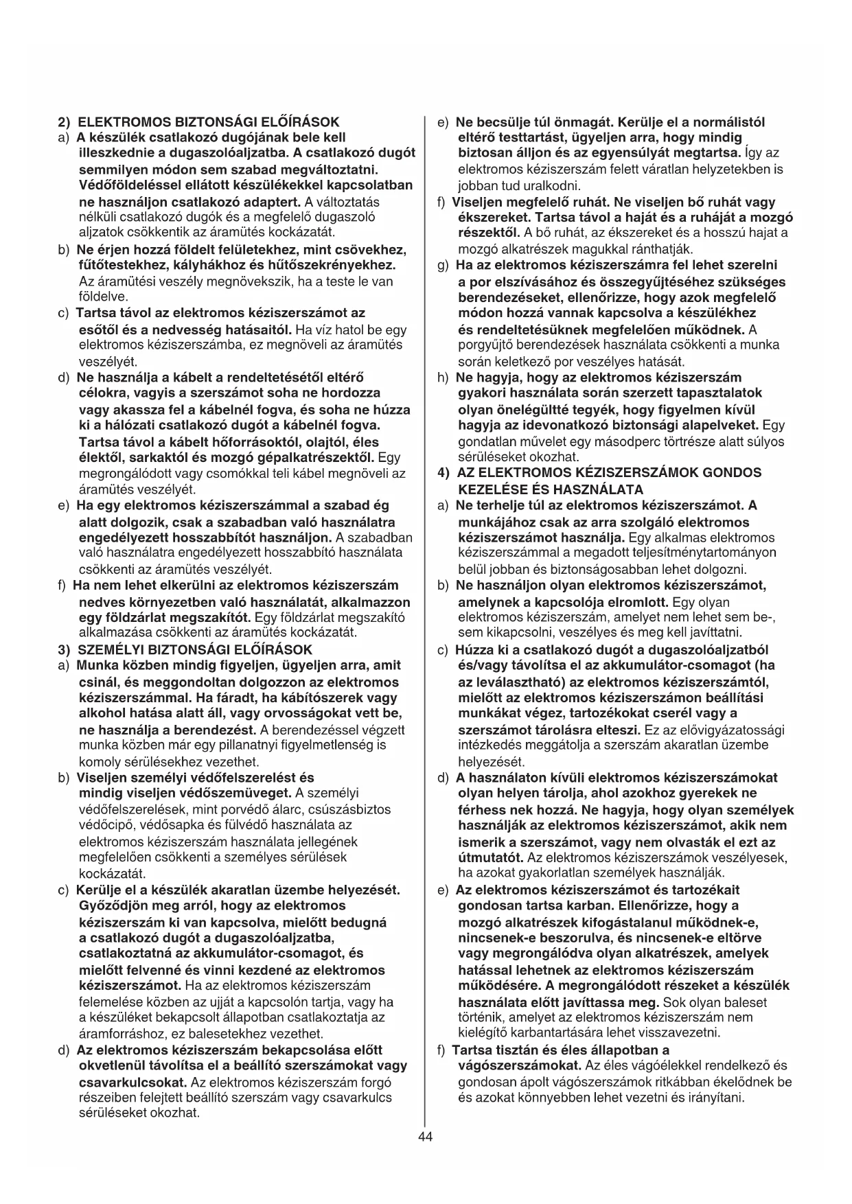 a) Munka közben mindig gyeljen, ügyeljen arra, amit csinál, és meggondoltan dolgozzon az elektromos kéziszerszámmal. Ha fáradt, ha kábítószerek vagy alkohol hatása alatt áll, vagy orvosságokat vett be, ne használja a berendezést. A berendezéssel végzett munka közben már egy pillanatnyi gyelmetlenség is komoly sérülésekhez vezethet. b) Viseljen személyi védőfelszerelést és mindig viseljen védőszemüveget. A személyi védőfelszerelések, mint porvédő álarc, csúszásbiztos védőcipő, védősapka és fülvédő használata az elektromos kéziszerszám használata jellegének megfelelően csökkenti a személyes sérülések kockázatát. c) Kerülje el a készülék akaratlan üzembe helyezését. Győződjön meg arról, hogy az elektromos kéziszerszám ki van kapcsolva, mielőtt bedugná a csatlakozó dugót a dugaszolóaljzatba, csatlakoztatná az akkumulátor-csomagot, és mielőtt felvenné és vinni kezdené az elektromos kéziszerszámot. Ha az elektromos kéziszerszám felemelése közben az ujját a kapcsolón tartja, vagy ha a készüléket bekapcsolt állapotban csatlakoztatja az áramforráshoz, ez balesetekhez vezethet. d) Az elektromos kéziszerszám bekapcsolása előtt okvetlenül távolítsa el a beállító szerszámokat vagy csavarkulcsokat. Az elektromos kéziszerszám forgó részeiben felejtett beállító szerszám vagy csavarkulcs sérüléseket okozhat.45 pormaszkot és amennyiben csatlakoztatható, dolgozzon porelszívó berendezéssel
