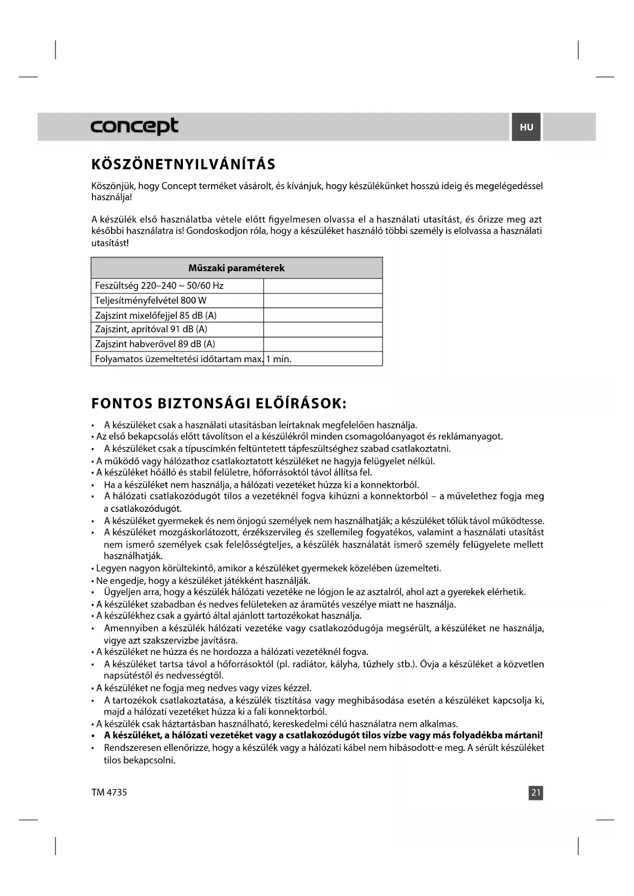 HASZNÁLATI ÚTMUTATÓ TM4735 Concept