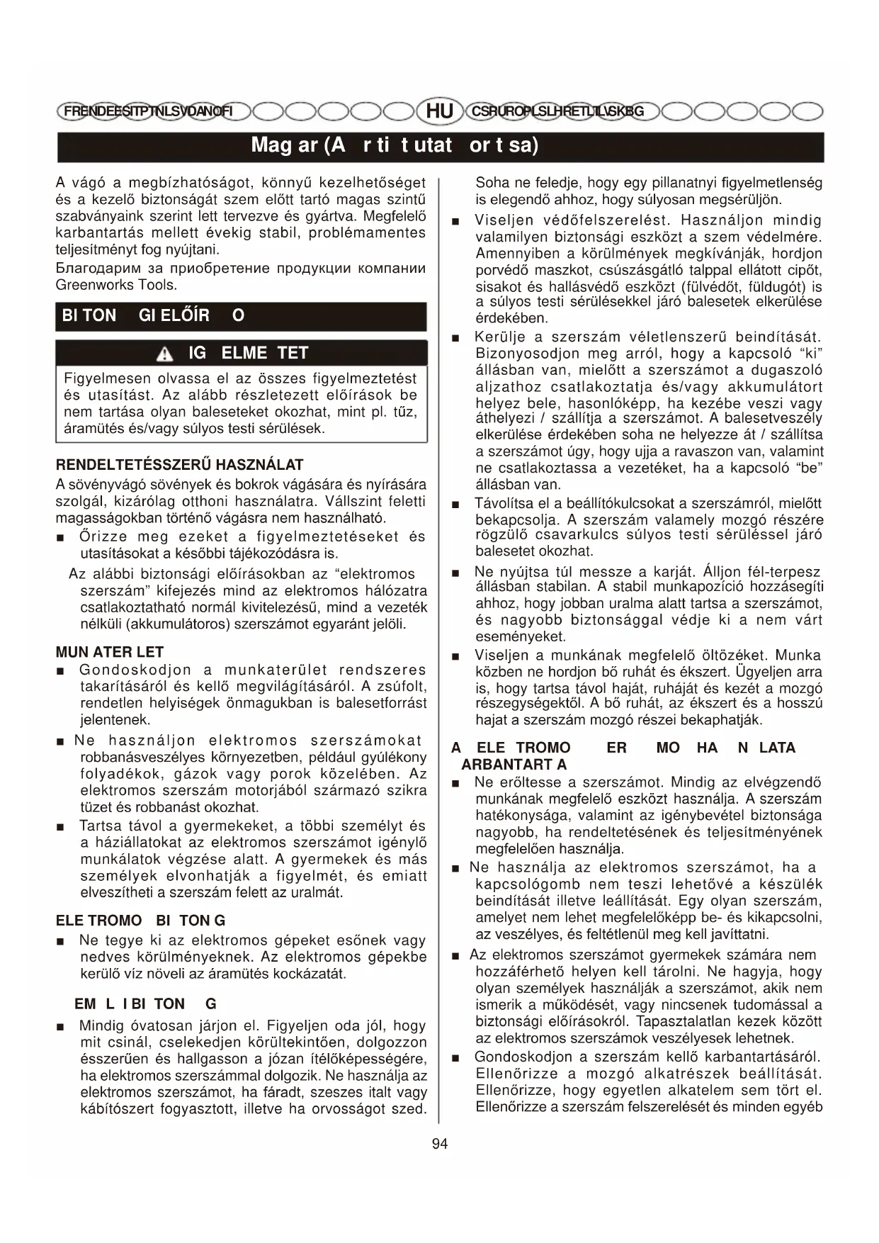 CS RU RO PL SL HR ET LT LV SK BG A vágó a megbízhatóságot, N|QQ\Ħ kezelhetĘVpJHt pV a NH]HOĘ biztonságát szem HOĘtt tartó magas szintĦ szabványaink szerint lett tervezve pV gyártva. 0HJIHOHOĘ karbantartás mellett pYHNLJ stabil, prREOpmamentes WHOMHVtWPpQ\WIRJQ\~MWDQL Ȼɥɚɝɨɞɚɪɢɦ ɡɚ ɩɪɢɨɛɪɟɬɟɧɢɟ ɩɪɨɞɭɤɰɢɢ ɤɨɦɩɚɧɢɢ Greenworks Tools. BI TON GI (/ėËRO