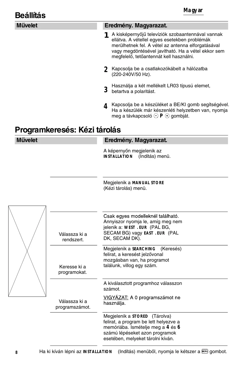 Kapcsolja be a készüléket a BE/KI gomb segítségével. Ha a készülék már készenléti helyzetben van, nyomja meg a távkapcsoló gombját. Programkeresés: Kézi tárolás Mıvelet Eredmény. Magyarazat. A képernyŒn megjelenik az INSTALLATION (Indítás) menü. Megjelenik a MANUAL STORE (Kézi tárolás) menü. Válassza ki a rendszert. Keresse ki a programokat. Annyiszor nyomja le, amíg meg nem jelenik a: WEST . EUR (PAL BG, SECAM BG) vagy EAST . EUR (PAL DK, SECAM DK). Megjelenik a SEARCHING (Keresés) felirat, a keresést jelzŒvonal mozgásban van, ha programot találunk, villog egy szám. A kiválasztott programhoz válasszon számot. Válassza ki a programszámot. Megjelenik a STORED (Tárolva) felirat, a program be lett helyezve a memóriába. Ismételje meg a 4 és 6 számú lépéseket azon programok esetében, melyeket tárolni kíván.