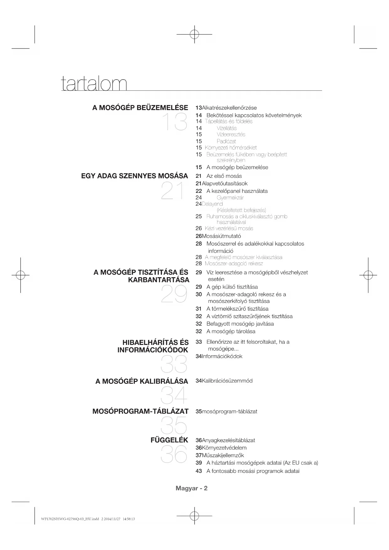 fordulat/perc 1200 1000 A termék külseje és műszaki jellemzői a hatékonyabb működtetés érdekében előzetes figyelmeztetés nélkül módosulhatnak. WF1702NHWG-02796Q-03_HU.indd 38 2014/11/27 14:58:24Magyar - 39