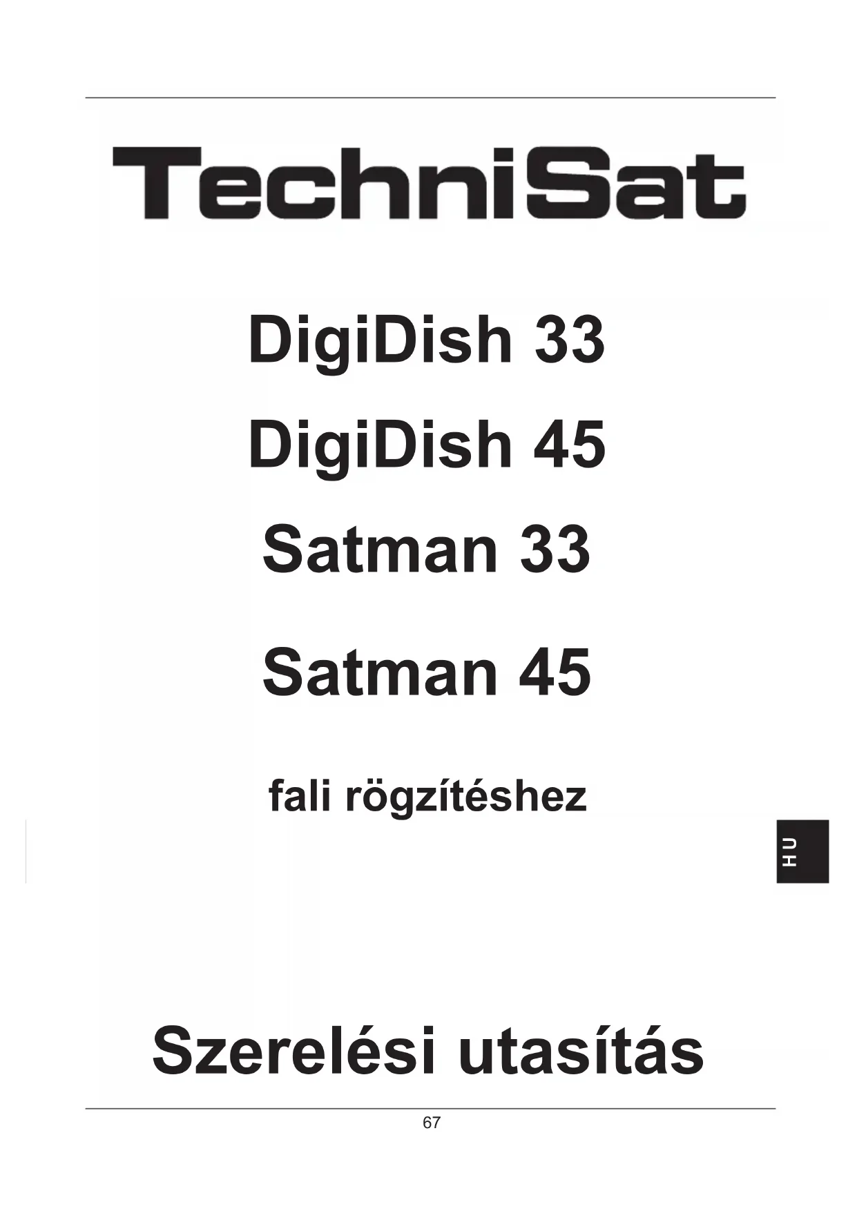 Parametry LNB: LOF low band: 9750 MHz LOF high band: 10600 MHz Přepínání low / high band: 22 kHz signál přijímače Volitelné příslušenství: Trubkové tvarovky pro montáž na stožár Kat. č.: 0000/0500 Balkónový stojan Kat. č.: 0000/1751 Držák s přísavnou nožkou Kat. č.: 0000/1758 Balkónový stojan Kat. č.: 0000/1755 Stojan na betonovou desku Kat. č.: 0000/1756 Tento výrobek nese označení CE a splňuje všechny potřebné normy EU. Změny a tiskové chyby vyhrazeny. Stav 06/12 DigiDish a TechniSat jsou registrované obchodní značky firmy TechniSat Digital GmbH Postfach 560 - 54541 Daun www.technisat.com Horká linka: +49 (0) 3925 9220 1806 Pondělí - Pátek 8:00 - 18:00 hod (platí běžné telefonní poplatky za telefonní hovory ze zahraničí)67 H U DigiDish 33 DigiDish 45 Satman 33 Satman 45 fali rögzítéshez Szerelési utasítás68 H U Tisztelt Ügyfelünk! Gratulálunk, hogy a TechniSat kiváló minőségű termékét választotta. Annak érdekében, hogy a termék minősége évekig megmaradjon, a tartó és a tükör alumíniumból készülnek. A tükör az ASTRA műholdak digitális jeleinek vételére szolgál. A szerelés előtt kérjük, gondo- san olvassa el a szerelési útmutatót, így a telepítést követően optimális vételi jellemzőket érhet el. Mielőtt elkezdené a szerelési munkálatokat, ellenőrizze a kültéri egység teljességét. A csomag tartalma (lásd 1. és 2. ábra)
