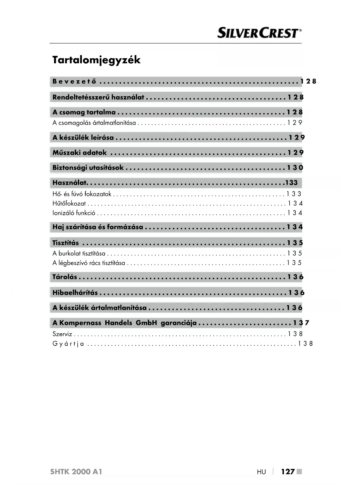 HASZNÁLATI ÚTMUTATÓ SHTK 2000 A1 SILVERCREST