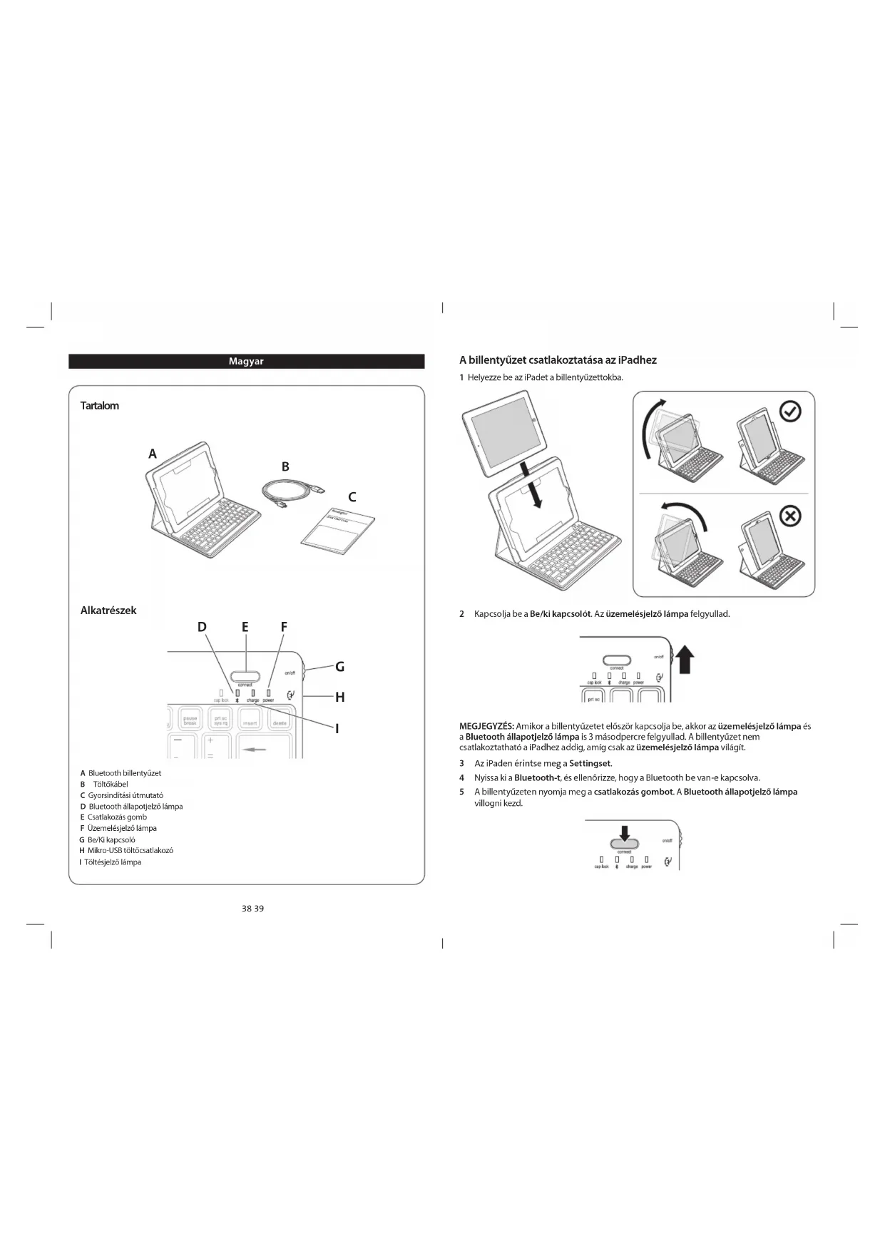 MEGJEGYZÉs: Amikor a billentyüzetet elször Kapcsolja be, akkor az uzemelésjelö lampa és a Bluetooth allapotjelö lampa is 3 masodperc felgyullad. A bilentyüzet nem cstlaktozathato i Pádhez addig, amig szek a uzemelésjelö lampa vilagt.