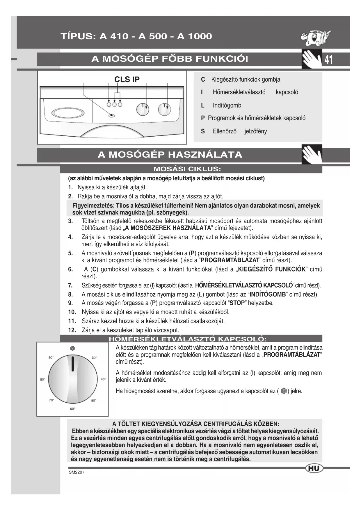 Ezt a gombot megnyomva a készülék rövid előmosást végez, maximum 40°C hőmér- sékleten és kb. 10 percen keresztül. Ez a funkció csak a „PAMUT”, „MŰSZÁLAS” és „NAPI” programnál használható.Megjegyzés: Ennél a funkciónál a mosószert az előmosáshoz kialakított rekeszbe is be kell tölteni.ELŐMOSÁS:A stop funkció a készülék nullázására szolgál. Ha bármilyen oknál fogva módosítani kíván egy már elindított mosási ciklust, vagy menet közben még valami mosnivalót akar behelyezni a készülékbe, akkor elegendő a programválasztó kapcsolót egyszerűen a “STOP” állásba vinnie, majd a kapcsolót a kívánt új programra állítania, és ezután megnyomnia a “START” gombot.Figyelem!! Ezt a funkciót csak akkor használja, ha mindenképpen szükséges, és csak akkor, ha a nullázandó program még nem fut 3 percnél hosszabb ideje. A nullázást követően az ajtó felnyitásáig 2 percet kell várni a reteszelés kioldására.Ezt a gombot megnyomva indíthatja el a készülék mosási ciklusát.NINCS CENTRIFUGÁZÁS:Ezt a funkciót kiválasztva a készülék centrifugázás nélkül hajtja végre a mosási cik-lust.Megjegyzés: Mivel a kiegészítő funkciók használata az előzetesen kiválasztott program típusától függ, így ha a funkciót nem fogadja el az adott program, akkor a gomb nem működik (lásd a PROGRAMTÁBLÁZAT című részt). INDÍTÓGOMB:43 SM2207