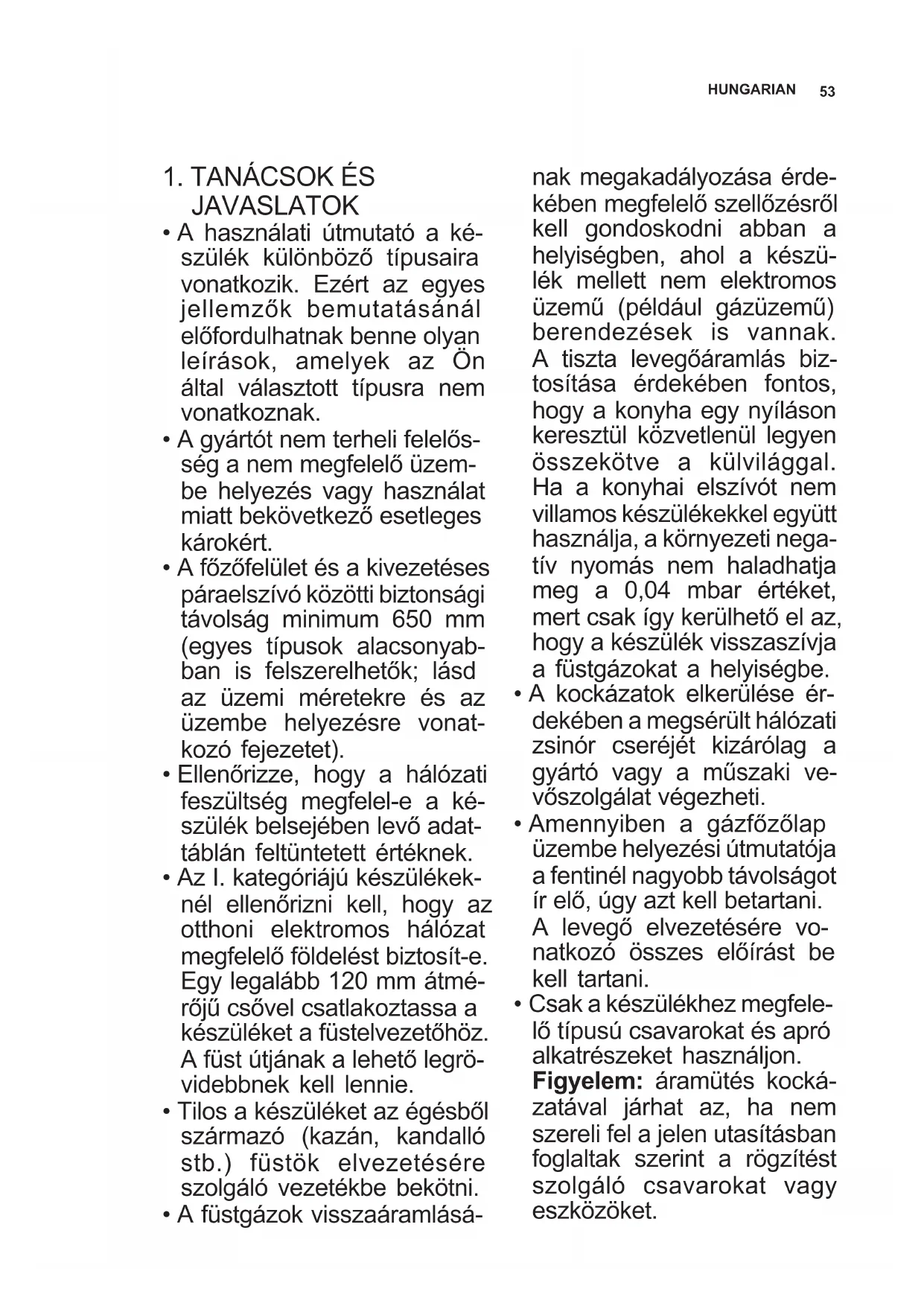 - A füstgázok visszaáramlásá- nak megakadályozása érde- kében megfelelő szellőzésről kell gondoskodni abban a helyiségben, ahol a készü- lék mellett nem elektromos üzemű (például gázüzemű) berendezések is vannak. A tiszta levegőáramlás biz- tosítása érdekében fontos, hogy a konyha egy nyíláson keresztül közvetlenül legyen összekötve a külvilággal. Ha a konyhai elszívót nem villamos készülékekkel együtt használja, a környezeti nega- tív nyomás nem haladhatja meg a 0,04 mbar értéket, mert csak így kerülhető el az, hogy a készülék visszaszívja a füstgázokat a helyiségbe.