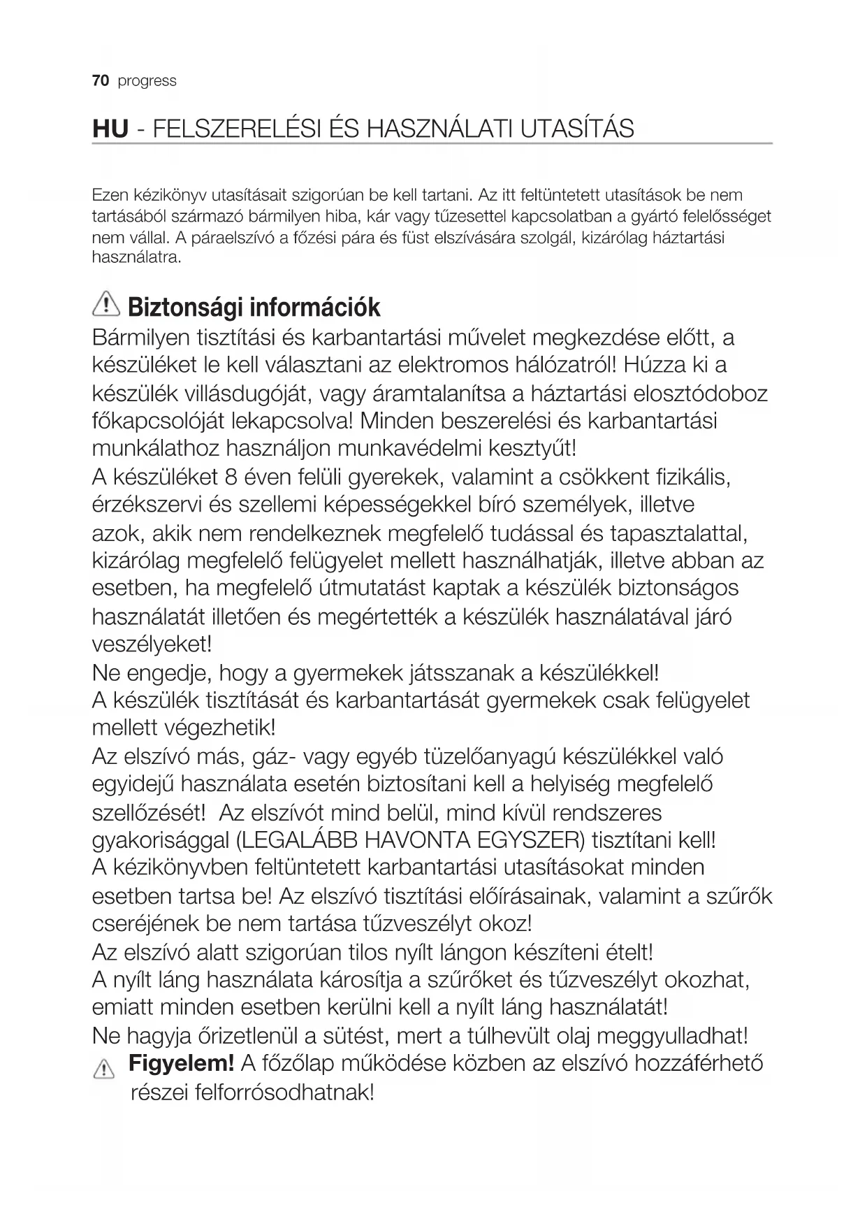E14 Napięcie (V) Wymiary (mm) 220-240 35x102 (średnica x długość) Kod ILCOS D (zgodnie z IEC 61231) DRBB/C-3-220-240-E14-35/10270 progress HU - FELSZERELÉSI ÉS HASZNÁLATI UTASÍTÁS Ezen kézikönyv utasításait szigorúan be kell tartani. Az itt feltüntetett utasítások be nem tartásából származó bármilyen hiba, kár vagy tűzesettel kapcsolatban a gyártó felelősséget nem vállal. A páraelszívó a főzési pára és füst elszívására szolgál, kizárólag háztartási használatra. Biztonsági információk Bármilyen tisztítási és karbantartási művelet megkezdése előtt, a készüléket le kell választani az elektromos hálózatról! Húzza ki a készülék villásdugóját, vagy áramtalanítsa a háztartási elosztódoboz főkapcsolóját lekapcsolva! Minden beszerelési és karbantartási munkálathoz használjon munkavédelmi kesztyűt! A készüléket 8 éven felüli gyerekek, valamint a csökkent zikális, érzékszervi és szellemi képességekkel bíró személyek, illetve azok, akik nem rendelkeznek megfelelő tudással és tapasztalattal, kizárólag megfelelő felügyelet mellett használhatják, illetve abban az esetben, ha megfelelő útmutatást kaptak a készülék biztonságos használatát illetően és megértették a készülék használatával járó veszélyeket! Ne engedje, hogy a gyermekek játsszanak a készülékkel! A készülék tisztítását és karbantartását gyermekek csak felügyelet mellett végezhetik! Az elszívó más, gáz vagy egyéb tüzelőanyagú készülékkel való egyidejű használata esetén biztosítani kell a helyiség megfelelő szellőzését! Az elszívót mind belül, mind kívül rendszeres gyakorisággal (LEGALÁBB HAVONTA EGYSZER) tisztítani kell! A kézikönyvben feltüntetett karbantartási utasításokat minden esetben tartsa be! Az elszívó tisztítási előírásainak, valamint a szűrők cseréjének be nem tartása tűzveszélyt okoz! Az elszívó alatt szigorúan tilos nyílt lángon készíteni ételt! A nyílt láng használata károsítja a szűrőket és tűzveszélyt okozhat, emiatt minden esetben kerülni kell a nyílt láng használatát! Ne hagyja őrizetlenül a sütést, mert a túlhevült olaj meggyulladhat! Figyelem! A főzőlap működése közben az elszívó hozzáférhető részei felforrósodhatnak!progress 71 Biztonsági utasítások Az izzó cseréjéhez kizárólag az e kézikönyv „karbantartás izzó cseréje” c. részben megadott típusú izzót használjon! Figyelem! Ne csatlakoztassa a készüléket az elektromos hálózatra, amíg a beszerelést teljesen el nem végezte! A füstelvezetéshez szükséges műszaki és biztonsági intézkedéseket illetően, az illetékes helyi hatóságok vonatkozó rendeleteit szigorúan tartsa be! A keringetett levegőt nem szabad a gáz vagy egyéb égéstermék üzemű készülékek füstjének elvezetéshez használt csőben szállítani! Ne használja az elszívót helytelenül felszerelt lámpával, illetve ne hagyja azt lámpa nélkül, mert áramütést okozhat! Soha ne használja az elszívót felszerelt rostély nélkül! Az elszívót SOHA ne használja tárolófelületként, hacsak az ilyen célra való használata nincs egyértelműen jelezve! Beszereléshez kizárólag a készülékhez mellékelt csavarokat használja! Amennyiben a csavar nem része a csomagnak, ügyeljen a megfelelő típusú csavarok beszerezésére! A beszerelési útmutatóban feltüntetett, megfelelő hosszúságú csavarokat használjon! Kétség esetén kérjen tájékoztatást a szakszerviztől, vagy hasonló képesítésű személyzettől! Figyelem! A csavarok és rögzítő elemeknek nem az útmutató szerinti felhelyezése áramütésveszélyt okozhat! Kőrnyezetvédelmi tudnivalók A következő jelzéssel ellátott anyagokat hasznosítsa újra: . Újrahasznosításhoz tegye a megfelelő konténerekbe a csomagolást. Járuljon hozzá környezetünk és egészségünk védelméhez, és hasznosítsa újra az elektromos és elektronikus hulladékot. A tiltó szimbólummal ellátott készüléket ne dobja a háztartási hulladék közé. Juttassa el a készüléket a helyi újrahasznosító telepre, vagy lépjen kapcsolatba a hulladékkezelésért felelős hivatallal. Használat Az elszívó külső elvezetésű elszívó vagy belső visszaforgatésos szűrős üzemmódban is használható. Felszerelés A hálózati feszültségnek azonosnak kell lennie a konyhai páraelszívó belsejében elhelyezett műszaki adattáblán feltüntetett feszültséggel. Ha az elszívó rendelkezik villásdugóval, csatlakoztassa egy hozzáférhető helyen elhelyezett, az érvényben lévő szabványoknak megfelelő dugaszoló aljzathoz, akár a beszerelést követően is. Ha nem rendelkezik csatlakozódugóval (közvetlen csatlakozás a hálózathoz) vagy a dugaszoló aljzat nem hozzáférhető, szereljen fel egy szabványos, kétpólusú megszakítót akár a beszerelést követően is, amely III. túláramkategória esetén biztosítja a hálózatról való teljes leválasztását, a telepítési szabályoknak megfelelően. Figyelem! Mielőtt az elszívó áramkörét visszaköti a hálózatba és ellenőrzi, hogy az elszívó helyesen működike, mindig ellenőrizze azt is, hogy a hálózati vezeték beszerelése szabályose.72 progress Nagy súlya miatt a készülék mozgatását és üzembe helyezését legalább két vagy több személynek kell végeznie. A főzőkészülék felülete és a konyhai szagelszívó legalsó része közötti minimális távolság nem lehet kisebb, mint 50cm elektromos főzőlap, és 65cm gáz vagy vegyes tüzelésű főzőlap esetén. Ha a gázfőzőlap beszerelési utasításában ennél nagyobb távolság szerepel, azt kellfigyelembe venni. Működése Az elszívó szíváserősségszabályozóval és főzőlapvilágításkapcsolóval ellátott kezelőpanellel rendelkezik.