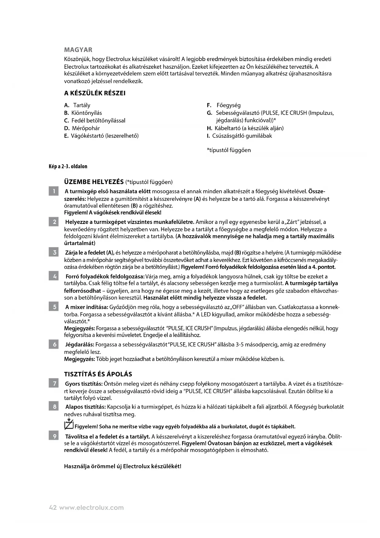 7 Gyors tisztítás: Öntsön meleg vizet és néhány csepp folyékony mosogatószert a tartályba. A vizet és a tisztítósze- rt keverje össze a sebességválasztó rövid ideig a “PULSE, ICE CRUSH” állásba kapcsolásával. Ezután öblítse ki a tartályt folyó vízzel. 8 Alapos tisztítás: Kapcsolja ki a turmixgépet, és húzza ki a hálózati tápkábelt a fali aljzatból. A főegység burkolatát nedves ruhával tisztítsa meg. Figyelem! Soha ne merítse vízbe vagy egyéb folyadékba alá a burkolatot, dugót és tápkábelt. 9 Távolítsa el a fedelet és a tartályt. A késszerelvényt a kiszereléshez forgassa óramutatóval egyező irányba. Öblít- se le a vágókéstartót vízzel és mosogatószerrel. Figyelem! Óvatosan bánjon az eszközzel, mert a vágókések rendkívül élesek! A fedél, a tartály és a mérőpohár mosogatógépben is elmosható. Használja örömmel új Electrolux készülékét!43www.electrolux.com