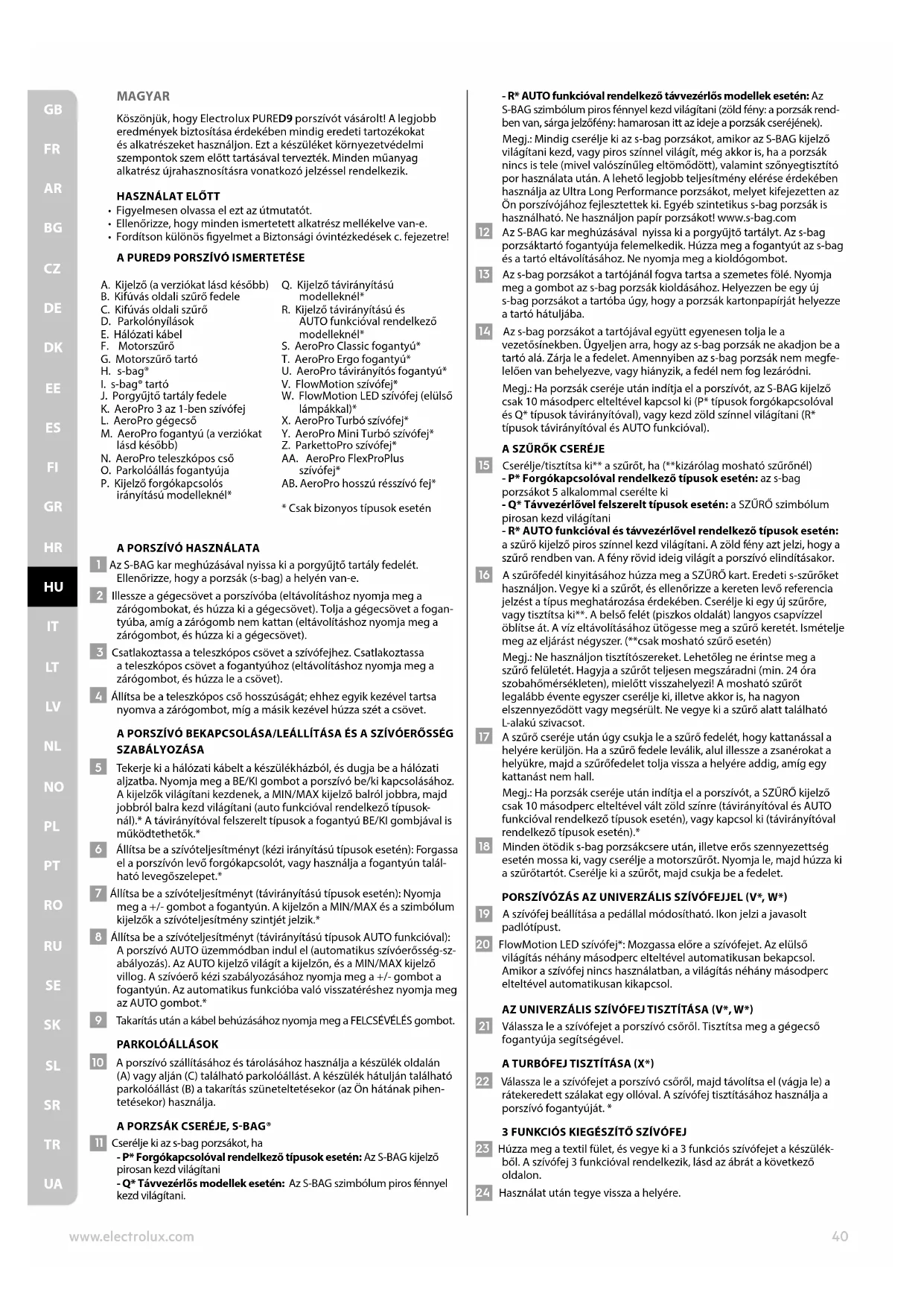 15 Cserélje/tisztítsa ki** a szűrőt, ha (**kizárólag mosható szűrőnél) - P* Forgókapcsolóval rendelkező típusok esetén: az s-bag porzsákot 5 alkalommal cserélte ki - Q* Távvezérlővel felszerelt típusok esetén: a SZŰRŐ szimbólum pirosan kezd világítani - R* AUTO funkcióval és távvezérlővel rendelkező típusok esetén: a szűrő kijelző piros színnel kezd világítani. A zöld fény azt jelzi, hogy a szűrő rendben van. A fény rövid ideig világít a porszívó elindításakor. 16 A szűrőfedél kinyitásához húzza meg a SZŰRŐ kart. Eredeti s-szűrőket használjon. Vegye ki a szűrőt, és ellenőrizze a kereten levő referencia jelzést a típus meghatározása érdekében. Cserélje ki egy új szűrőre, vagy tisztítsa ki**. A belső felét (piszkos oldalát) langyos csapvízzel öblítse át. A víz eltávolításához ütögesse meg a szűrő keretét. Ismételje meg az eljárást négyszer. (**csak mosható szűrő esetén) Megj.: Ne használjon tisztítószereket. Lehetőleg ne érintse meg a szűrő felületét. Hagyja a szűrőt teljesen megszáradni (min. 24 óra szobahőmérsékleten), mielőtt visszahelyezi! A mosható szűrőt legalább évente egyszer cserélje ki, illetve akkor is, ha nagyon elszennyeződött vagy megsérült. Ne vegye ki a szűrő alatt található L-alakú szivacsot. 17 A szűrő cseréje után úgy csukja le a szűrő fedelét, hogy kattanással a helyére kerüljön. Ha a szűrő fedele leválik, alul illessze a zsanérokat a helyükre, majd a szűrőfedelet tolja vissza a helyére addig, amíg egy kattanást nem hall. Megj.: Ha porzsák cseréje után indítja el a porszívót, a SZŰRŐ kijelző csak 10 másodperc elteltével vált zöld színre (távirányítóval és AUTO funkcióval rendelkező típusok esetén), vagy kapcsol ki (távirányítóval rendelkező típusok esetén).* 18 Minden ötödik s-bag porzsákcsere után, illetve erős szennyezettség esetén mossa ki, vagy cserélje a motorszűrőt. Nyomja le, majd húzza ki a szűrőtartót. Cserélje ki a szűrőt, majd csukja be a fedelet. PORSZÍVÓZÁS AZ UNIVERZÁLIS SZÍVÓFEJJEL V*, W* 19 A szívófej beállítása a pedállal módosítható. Ikon jelzi a javasolt padlótípust. 20 FlowMotion LED szívófej*: Mozgassa előre a szívófejet. Az elülső világítás néhány másodperc elteltével automatikusan bekapcsol. Amikor a szívófej nincs használatban, a világítás néhány másodperc elteltével automatikusan kikapcsol. AZ UNIVERZÁLIS SZÍVÓFEJ TISZTÍTÁSA V*, W* 21 Válassza le a szívófejet a porszívó csőről. Tisztítsa meg a gégecső fogantyúja segítségével. A TURBÓFEJ TISZTÍTÁSA X* 22 Válassza le a szívófejet a porszívó csőről, majd távolítsa el (vágja le) a rátekeredett szálakat egy ollóval. A szívófej tisztításához használja a porszívó fogantyúját. * 3 FUNKCIÓS KIEGÉSZÍTŐ SZÍVÓFEJ 23 Húzza meg a textil fület, és vegye ki a 3 funkciós szívófejet a készülék- ből. A szívófej 3 funkcióval rendelkezik, lásd az ábrát a következő oldalon. 24 Használat után tegye vissza a helyére. 40www.electrolux.com