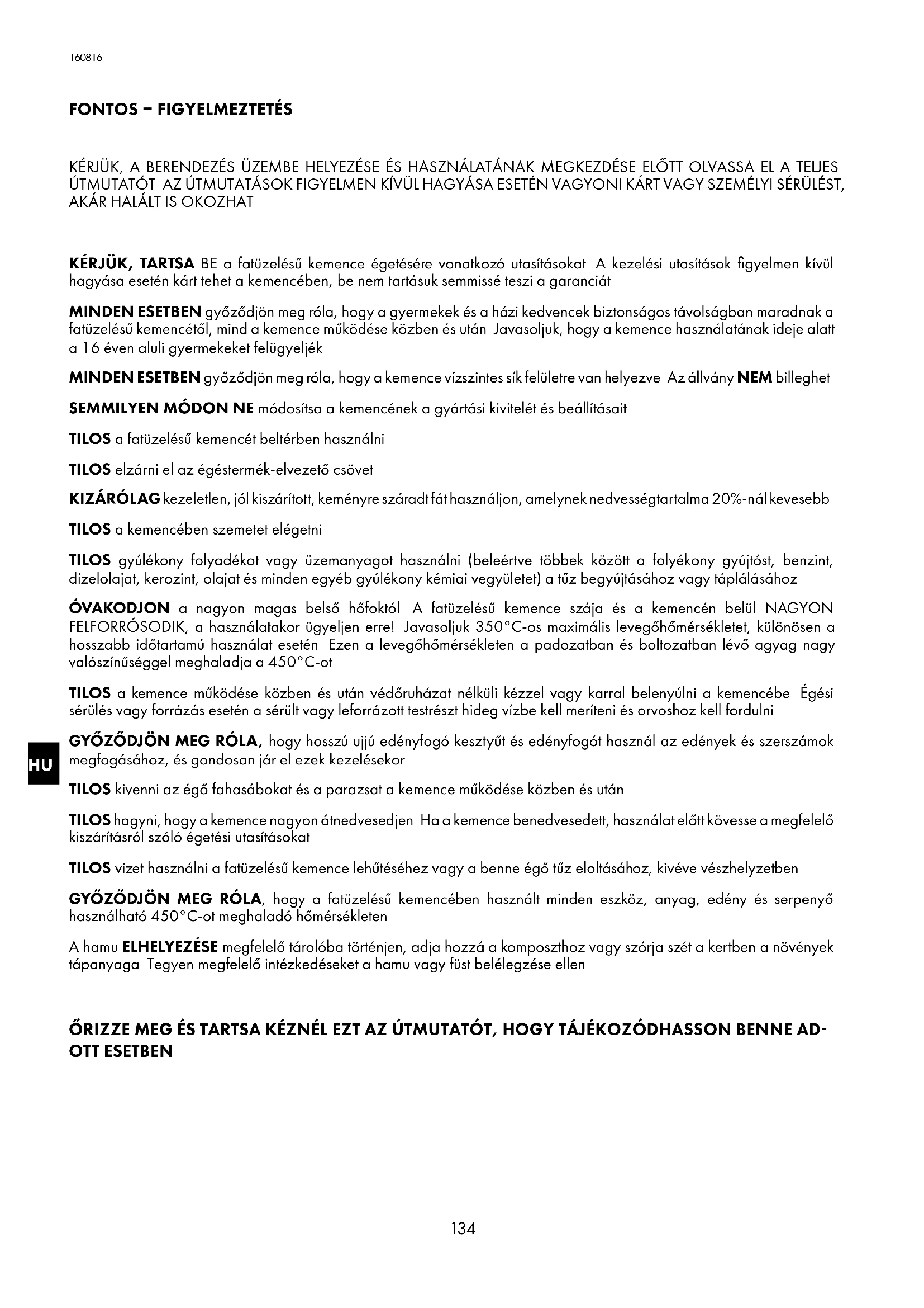 KÉRJÜK, TARTSA BE a fatüzelésű kemence égetésére vonatkozó utasításokat A kezelési utasítások figyelmen kívül hagyása esetén kárt tehet a kemencében, be nem tartásuk semmissé teszi a garanciát MINDEN ESETBEN győződjön meg róla, hogy a gyermekek és a házi kedvencek biztonságos távolságban maradnak a fatüzelésű kemencétől, mind a kemence működése közben és után Javasoljuk, hogy a kemence használatának ideje alatt a 16 éven aluli gyermekeket felügyeljék MINDEN ESETBEN győződjön meg róla, hogy a kemence vízszintes sík felületre van helyezve Az állvány NEM billeghet SEMMILYEN MÓDON NE módosítsa a kemencének a gyártási kivitelét és beállításait TILOS a fatüzelésű kemencét beltérben használni TILOS elzárni el az égéstermék-elvezető csövet KIZÁRÓLAG kezeletlen, jól kiszárított, keményre száradt fát használjon, amelynek nedvességtartalma 20%-nál kevesebb TILOS a kemencében szemetet elégetni TILOS gyúlékony folyadékot vagy üzemanyagot használni (beleértve többek között a folyékony gyújtóst, benzint, dízelolajat, kerozint, olajat és minden egyéb gyúlékony kémiai vegyületet) a tűz begyújtásához vagy táplálásához ÓVAKODJON a nagyon magas belső hőfoktól A fatüzelésű kemence szája és a kemencén belül NAGYON FELFORRÓSODIK, a használatakor ügyeljen erre! Javasoljuk 350°C-os maximális levegőhőmérsékletet, különösen a hosszabb időtartamú használat esetén Ezen a levegőhőmérsékleten a padozatban és boltozatban lévő agyag nagy valószínűséggel meghaladja a 450°C-ot TILOS a kemence működése közben és után védőruházat nélküli kézzel vagy karral belenyúlni a kemencébe Égési sérülés vagy forrázás esetén a sérült vagy leforrázott testrészt hideg vízbe kell meríteni és orvoshoz kell fordulni GYŐZŐDJÖN MEG RÓLA, hogy hosszú ujjú edényfogó kesztyűt és edényfogót használ az edények és szerszámok megfogásához, és gondosan jár el ezek kezelésekor TILOS kivenni az égő fahasábokat és a parazsat a kemence működése közben és után TILOS hagyni, hogy a kemence nagyon átnedvesedjen Ha a kemence benedvesedett, használat előtt kövesse a megfelelő kiszárításról szóló égetési utasításokat TILOS vizet használni a fatüzelésű kemence lehűtéséhez vagy a benne égő tűz eloltásához, kivéve vészhelyzetben GYŐZŐDJÖN MEG RÓLA, hogy a fatüzelésű kemencében használt minden eszköz, anyag, edény és serpenyő használható 450°C-ot meghaladó hőmérsékleten A hamu ELHELYEZÉSE megfelelő tárolóba történjen, adja hozzá a komposzthoz vagy szórja szét a kertben a növények tápanyaga Tegyen megfelelő intézkedéseket a hamu vagy füst belélegzése ellen ŐRIZZE MEG ÉS TARTSA KÉZNÉL EZT AZ ÚTMUTATÓT, HOGY TÁJÉKOZÓDHASSON BENNE AD- OTT ESETBEN