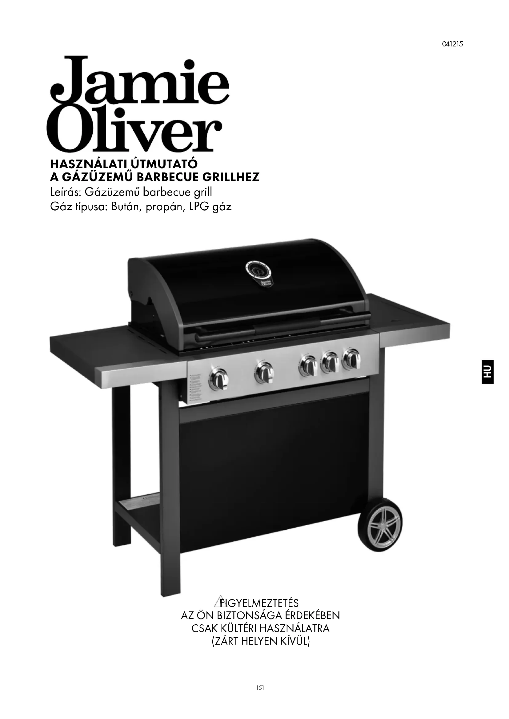 Olvassa el figyelmesen az útmutatót, és gondoskodjon róla, hogy a barbecue grillt megfelelően telepítse, szerelje össze, tartsa karban és javítsa, jelen útmutatóval összhangban. Amennyiben jelen utasításokat nem követi, az súlyos testi sérülést és/vagy vagyoni kárt eredményezhet. Amennyiben a barbecue grill összeállításával vagy működtetésével kapcsolatban kérdései merülnek fel, vegye fel a kapcsolatot értékesítőjével, gázszolgáltatójával, a gyártóval vagy annak képviselőjével, illetve támogatásért látogasson el a www.jamieoliverbbq.com weboldalra. Megjegyzések a felhasználó számára: „KIZÁRÓLAG KÜLTÉRI HASZNÁLATRA.” „A Barbecue HASZNÁLATÁT MEGELŐZŐEN OLVASSA EL AZ ÚTMUTATÓT. ” „FIGYELMEZTETÉS: A HOZZÁFÉRHETŐ ALKATRÉSZEK FORRÓAK LEHETNEK. GYERMEKEIT TARTSA TÁVOL. ” „HASZNÁLAT KÖZBEN NE MOZGASSA A Barbecue-t. ” “„A HASZNÁLATOT KÖVETŐEN ZÁRJA EL A GÁZELLÁTÁST A GÁZSZELEPNÉL. ”