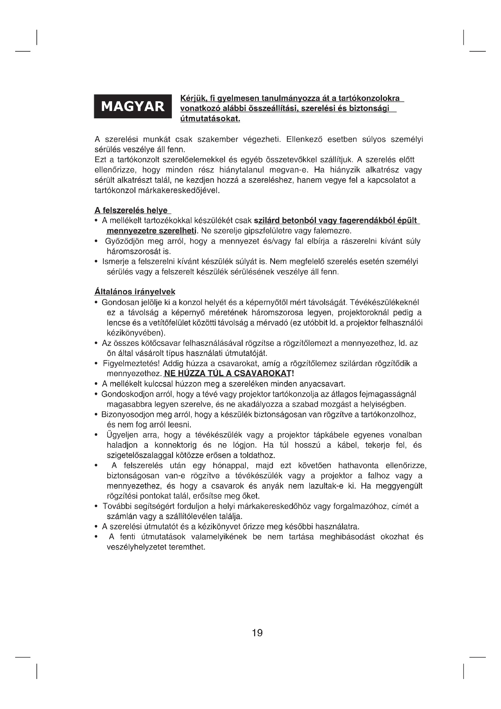 - Todas las marcas de los logotipos y los nombres de productos constituyen patentes o marcas registradas de sus titulares correspondientes, reconocidos como tal.19 Kérjük, fi gyelmesen tanulmányozza át a tartókonzolokra vonatkozó alábbi összeállítási, szerelési és biztonsági útmutatásokat. A szerelési munkát csak szakember végezheti. Ellenkező esetben súlyos személyi sérülés veszélye áll fenn. Ezt a tartókonzolt szerelőelemekkel és egyéb összetevőkkel szállítjuk. A szerelés előtt ellenőrizze, hogy minden rész hiánytalanul megvan-e. Ha hiányzik alkatrész vagy sérült alkatrészt talál, ne kezdjen hozzá a szereléshez, hanem vegye fel a kapcsolatot a tartókonzol márkakereskedőjével. A felszerelés helye