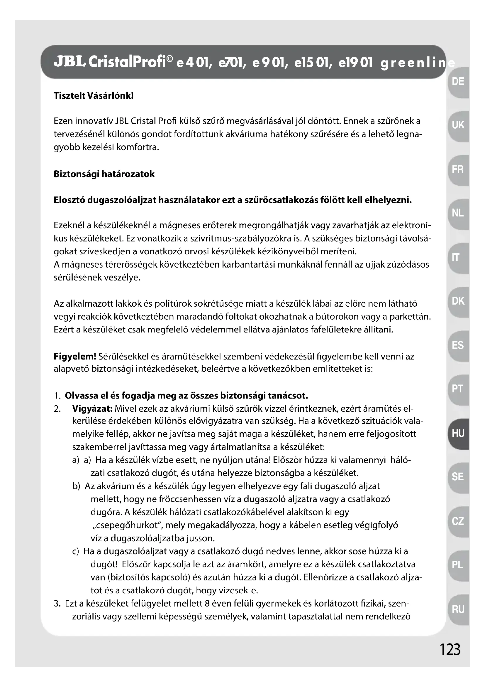 Série n.º _ _ - _ _- _ _ _ _ _ Data de compra: _ _ / _ _ / _ _ (favor incluir em todos os casos o comprovante de compra que lhe será devolvido juntamente com o aparelho) Motivo da reclamação: Data:................................................ Assinatura:................................................ Espaço reservado para o comprovante de compra:123 Tisztelt Vásárlónk!Ezen innovatív JBL Cristal Pro külső szűrő megvásárlásával jól döntött. Ennek a szűrőnek a tervezésénél különös gondot fordítottunk akváriuma hatékony szűrésére és a lehető legna-gyobb kezelési komfortra. Biztonsági határozatokElosztó dugaszolóaljzat használatakor ezt a szűrőcsatlakozás fölött kell elhelyezni.Ezeknél a készülékeknél a mágneses erőterek megrongálhatják vagy zavarhatják az elektroni-kus készülékeket. Ez vonatkozik a szívritmus-szabályozókra is. A szükséges biztonsági távolsá-gokat szíveskedjen a vonatkozó orvosi készülékek kézikönyveiből meríteni.A mágneses térerősségek következtében karbantartási munkáknál fennáll az ujjak zúzódásos sérülésének veszélye.Az alkalmazott lakkok és politúrok sokrétűsége miatt a készülék lábai az előre nem látható vegyi reakciók következtében maradandó foltokat okozhatnak a bútorokon vagy a parkettán. Ezért a készüléket csak megfelelő védelemmel ellátva ajánlatos fafelületekre állítani.Figyelem! Sérülésekkel és áramütésekkel szembeni védekezésül gyelembe kell venni az alapvető biztonsági intézkedéseket, beleértve a következőkben említetteket is:1. Olvassa el és fogadja meg az összes biztonsági tanácsot.