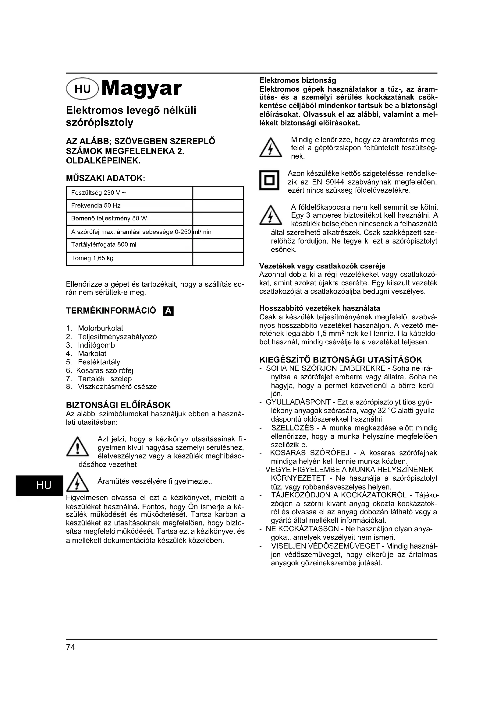 Az alábbi szimbólumokat használjuk ebben a haszná- lati utasításban: Azt jelzi, hogy a kézikönyv utasításainak fi - gyelmen kívül hagyása személyi sérüléshez, életveszélyhez vagy a készülék meghibáso- dásához vezethet Áramütés veszélyére fi gyelmeztet. Figyelmesen olvassa el ezt a kézikönyvet, mielőtt a készüléket használná. Fontos, hogy Ön ismerje a ké- szülék működését és működtetését. Tartsa karban a készüléket az utasításoknak megfelelően, hogy bizto- sítsa megfelelő működését. Tartsa ezt a kézikönyvet és a mellékelt dokumentációta készülék közelében. Elektromos biztonság Elektromos gépek használatakor a tűz-, az áram- ütés- és a személyi sérülés kockázatának csök- kentése céljából mindenkor tartsuk be a biztonsági előírásokat. Olvassuk el az alábbi, valamint a mel- lékelt biztonsági előírásokat. Mindig ellenőrizze, hogy az áramforrás meg- felel a géptörzslapon feltüntetett feszültség- nek. Azon készüléke kettős szigeteléssel rendelke- zik az EN 50I44 szabványnak megfelelően, ezért nincs szükség földelővezetékre. A fóldelőkapocsra nem kell semmit se kötni. Egy 3 amperes biztosítékot kell használni. A készülék belsejében nincsenek a felhasználó által szerelhető alkatrészek. Csak szakképzett sze- relőhöz forduljon. Ne tegye ki ezt a szórópisztolyt esőnek. Vezetékek vagy csatlakozók cseréje Azonnal dobja ki a régi vezetékeket vagy csatlakozó- kat, amint azokat újakra cserélte. Egy kilazult vezeték csatlakozóját a csatlakozóaljba bedugni veszélyes. Hosszabbító vezetékek használata Csak a készülék teljesítményének megfelelő, szabvá- nyos hosszabbító vezetéket használjon. A vezető mé- retének legalább 1,5 mm