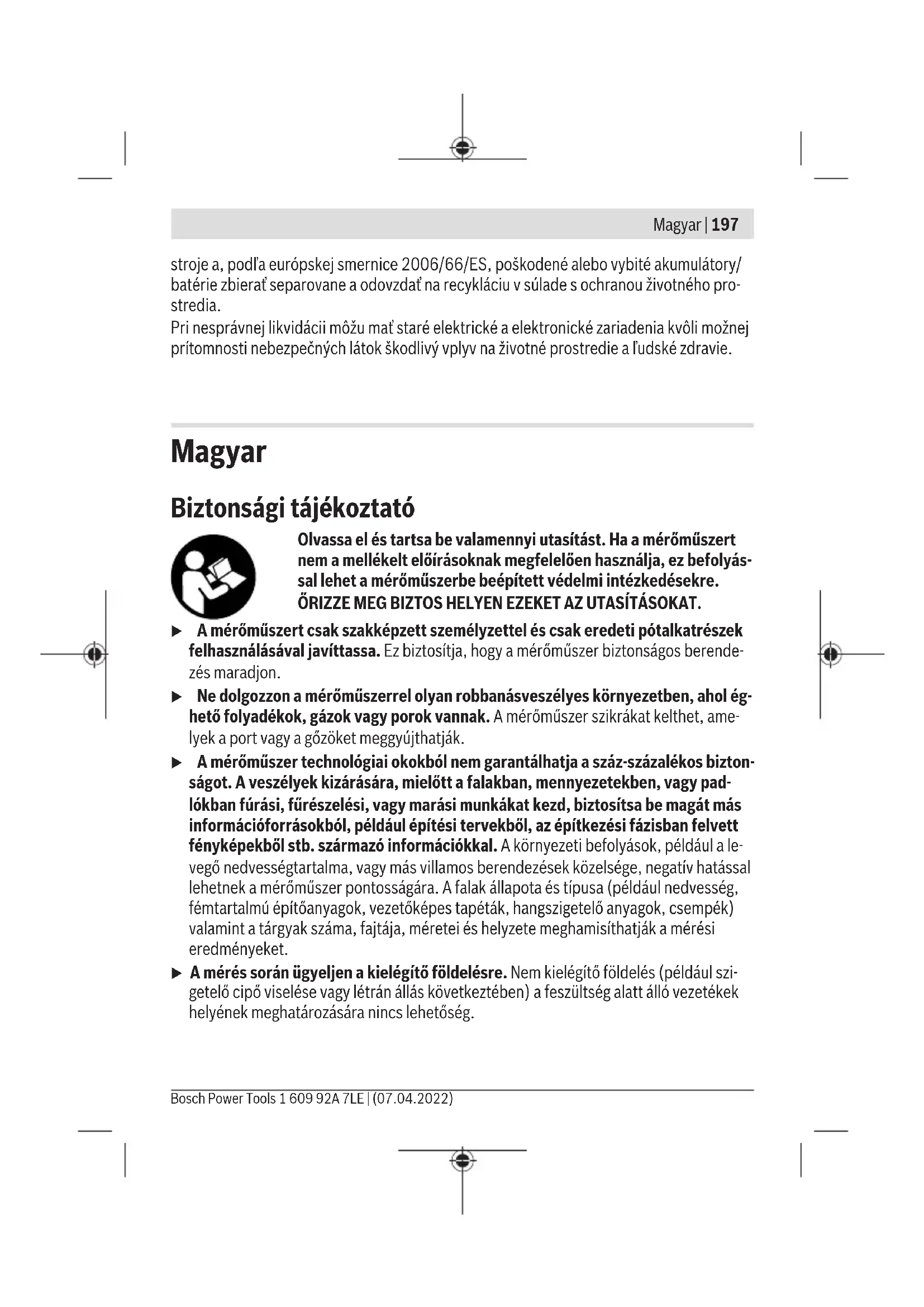 Elem 1×9V6LR61 Élettartam, kb. 5ó Súly az „EPTA-Procedure01:2014” (2014/01 EPTA‑eljárás) szerint 0,27kg Védelmi osztály IP 54 (por és fröccsenő víz ellen védett kivitel) A) az üzemmódtól, a tárgyak anyagától és méretétől, valamint az alap anyagától és állapotától függ B) alacsonyabb érzékelési mélység feszültség alatt nem álló vezetékek esetén C) Csak egy nem vezetőképes szennyezés lép fel, ámbár időnként a harmatképződés következté- ben ideiglenesen egy nullától eltérő vezetőképességre is lehet számítani. A mérőműszerét a típustáblán található (14) gyári számmal lehet egyértelműen azonosítani. u A mérési eredmény pontossága és az észlelési mélység rossz felületű alap esetén rosszabb lehet. Összeszerelés Elem behelyezése/kicserélése A mérőműszer üzemeltetéséhez alkáli-mangán-elemek alkalmazását javasoljuk. A(15)elemfiók fedelének felnyitásához nyomja meg a(16)reteszelést a nyíl által jelzett irányba és hajtsa fel az elemfiók fedelét. Tegye be az elemet. 1 609 92A 7LE | (07.04.2022) Bosch Power ToolsMagyar | 201 Ekkor ügyeljen az elemfiók fedél belső oldalán található ábrázolásnak megfelelő helyes polaritás betartására. u Vegye ki az elemet a mérőműszerből, ha hosszabb ideig nem használja. Az elem a mérőműszerben egy hosszabb tárolás során korrodálhat, vagy magától kimerülhet. Akkumulátor kijelző A(h)akkumulátor kijelző mindig az akkumulátor pillanatnyi állapotát mutatja: Kijelzés Kapacitás 60–100% 30–60% 5–30% 0–5% Üzemeltetés u Óvja meg a mérőműszert a nedvességtől és a közvetlen napsugárzás behatásá- tól. u Ne tegye ki a mérőműszert szélsőséges hőmérsékleteknek vagy hőmérsékletin- gadozásoknak. Nagyobb hőmérsékletingadozások esetén várja meg, amíg a hő- mérséklete kiegyenlítődik, mielőtt bekapcsolná. Szélsőséges hőmérsékletek vagy hőmérsékletingadozások esetén a mérőműszer és a kijelzés pontossága csökkenhet. u Ügyeljen arra, hogy a mérőműszer ne eshessen le és ne legyen kitéve erősebb lö- késeknek vagy ütéseknek. Erős külső behatások után és a működés során fellépő feltűnő jelenségek esetén ellenőriztesse a mérőműszert egy feljogosított Bosch-vevő- szolgálattal. u A mérési eredményekre a mérési elv következtében bizonyos környezeti feltéte- lek befolyással lehetnek. Ide tartoznak például a olyan berendezések közel volta, amelyek erős elektromos, mágneses vagy elektromágneses tereket hoznak lét- re, nedvesség, fémtartalmú építőanyagok, alumíniummal kasírozott hangszige- telő anyagok valamint vezetőképes tapéták vagy csempék. Ezért a falakban, mennyezetekben vagy padlókban végzendő fúrás, fűrészelés vagy marás megkezdése előtt nézzen utána más információforrásokban (például építési tervek) is. u A mérőműszert csak az erre a célra előirányzott (8)fogantyúfelületeknél fogva tartsa, hogy ne befolyásolja a mérési eljárást. Bosch Power Tools 1 609 92A 7LE | (07.04.2022)202 | Magyar u A mérőműszer hátoldalán a(13) érzékelő tartományban ne tegyen fel öntapadó címkéket vagy táblákat. A fémtáblák különösen erősen befolyásolják a mérési ered- ményeket. Mérés közben ne viseljen kesztyűt és ügyeljen a kielégítő földe- lésre. Ha nem áll fenn kielégítő földelés, a feszültség alatt álló vezeté- kek felismerése esetleg nem megfelelően működik. Mérés közben kerülje el olyan készülékek közelségét, amelyek erős elektromos, mágneses vagy elektromágneses mezőket bo- csátanak ki. Az olyan készülékeknél, amelyek sugárzása befolyással lehet a mérésre, lehetőség szerint deaktiválja a megfelelő funkciókat, vagy kapcsolja ki a készülékeket. Üzembe helyezés Be- és kikapcsolás u A mérőműszer bekapcsolása előtt gondoskodjon arról, hogy a (13) érzékelő tar- tomány ne legyen nedves. Szükség esetén dörzsölje szárazra egy kendővel a mérő- műszert. u Ha a mérőműszer előzőleg egy erős hőmérsékletváltozásnak volt kitéve, akkor a bekapcsolás előtt várja meg, amíg a hőmérséklete egy stabil értékre áll be. A mérőműszer bekapcsolásához nyomja meg a(5)Be-/Ki-gombot. A mérőműszer kikapcsolásához nyomja meg ismét a (5)Be-/Ki-gombot. Ha a mérőműszeren kb.5percig egyik gombot sem nyomják meg és a mérőműszer tár- gyakat sem észlel, a mérőműszer az elemek kímélésére automatikusan kikapcsol. A kijelző megvilágítás be- és kikapcsolása A(6)kijelzés megvilágítás gomb a kijelző megvilágításának be- és kikapcsolására szolgál. A hangjelzés be-/kikapcsolása A(7)hangjelzés gomb a hangjelzés be- és kikapcsolására szolgál. Kikapcsolt hangjelzés esetén a kijelzőben megjelenik a(a)jel. Működési mód (lásd aBábrát) A mérőműszerrel a(13)érzékelő tartomány alatti területet az Amérési irányban a maxi- mális érzékelési mélységig lehet megvizsgálni. A készülék olyan tárgyakat ismer fel, ame- lyek anyaga különbözik a fal anyagától. Mozgassa a mérőműszert egyenes vonalban aBirányban a falon. 1 609 92A 7LE | (07.04.2022) Bosch Power ToolsMagyar | 203 A mérőműszert mindig enyhén nyomja az alapfelületre és így mozgassa, anélkül hogy fel- emelné vagy a nyomóerőt megváltoztatná. A mérés közben a(12)csúszókáknak állandóan érintkezésben kell lenniük a vizsgált felü- lettel. A mérési folyamat Tegye rá a mérőműszert a megvizsgálásra kerülő felületre, majd mozgassa el aBirányba. – Ha a mérőműszer egy tárgyhoz közeledik, akkor a(i)mérőkijelző kitérése növekszik és a(1)lámpagyűrű sárga színben világít. – Ha a mérőműszer távolodik a tárgytól, a kitérés csökken. – Egy tárgy középpontja felett a mérőkijelző a legnagyobb kitérést mutatja; a(1)pi