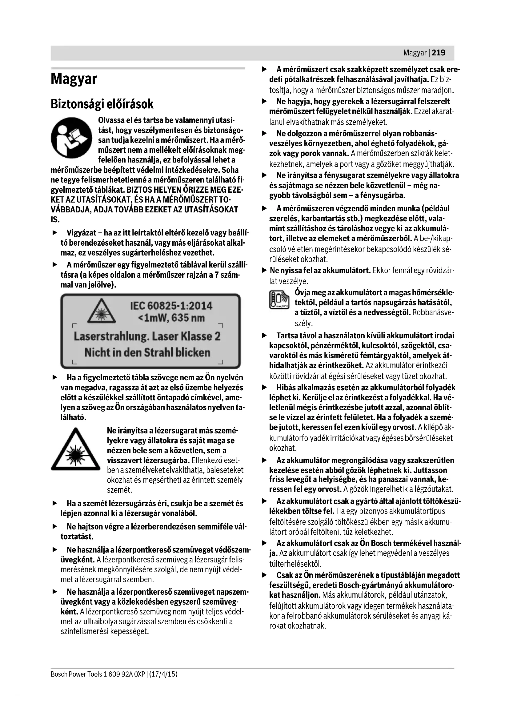 5) A Bluetooth®-Low-Energy technológián alapuló készülékeknél a modelltől és az operációs rendszertől függően előfordulhat, hogy nem lehet össze- köttetést felépíteni. A Bluetooth® készülékeknek támogatniuk kell az SPP-Profilt. 6) korlátozott teljesítmény <0 °C hőmérsékletek eseténA műszaki adatok a szállítmányhoz tartozó akkumulátorral kerültek meghatározásra. Az ön mérőműszere a típustáblán található 6 gyártási számmal egyértelműen azonosítható. Ø 40 mm Ø 55 mm Ø 100 mm 1 m 2 m 5 m Henk Becker Executive Vice President Engineering Helmut Heinzelmann Head of Product Certification PT/ETM9 OBJ_BUCH-2270-002.book Page 222 Friday, April 17, 2015 9:48 AMMagyar | 223 Bosch Power Tools 1 609 92A 0XP | (17/4/15) Üzemeltetés az akkumulátorral (a 3 601 K83 370 alkatrész-számú berendezésnél ez nincs) (lásd a „B” ábrát) Megjegyzés: Az Ön mérőműszerének nem megfelelő akku- mulátorok használata a mérőműszer megrongálódásához, vagy hibás működéséhez vezethet. Megjegyzés: Az akkumulátor részben feltöltve kerül kiszállí- tásra. Az akkumulátor teljes teljesítményének biztosítására az első alkalmazás előtt töltse fel teljesen az akkumulátort a töl- tőkészülékben. Csak a Műszaki Adatoknál megadott töltőkészülékeket használja. Csak ezek a töltőkészülékek vannak pontosan beállítva az Ön mérőműszerében használható lithium-io- nos-akkumulátorok töltésére. A Li-ion-akkumulátort bármikor fel lehet tölteni, anélkül, hogy ez megrövidítené az élettartamát. A töltési folyamat megsza- kítása nem árt az akkumulátornak. A mérőműszer automatikus kikapcsolása után ne nyomja tovább a be-/kikapcsoló gombot. Ez meg- rongálhatja az akkumulátort. A feltöltött 30 akkumulátor behelyezéséhez tolja azt bele a 29 akkumulátor-kosárba, amíg az érezhetően beugrik a rete- szelési helyzetbe és egy síkba kerül a mérőműszer fogantyújá- val. A 30 akkumulátor kivételéhez nyomja meg a 3 reteszelésfel- oldó gombokat és húzza ki az akkumulátort a 29 akkumulátor- kosárból. Ne erőltesse a kihúzást. Elemekkel való üzemeltetés (3 601 K83 370) (lásd a „C” ábrát) Az elemfiók 31 fedelének felnyitásához nyomja meg a 3 rete- szelésfeloldó gombokat és vegye le az elemfiók fedelét. Az elemek behelyezésekor ügyeljen az elemfiók fedelén talál- ható ábrának megfelelő helyes polaritásra. Tegye ismét fel az elemtartó 31 fedelét és pattintsa be a rete- szelési helyzetbe. Mindig valamennyi elemet egyszerre cserélje ki. Csak egyazon gyártó cégtől származó és azonos kapacitású elemeket hasz- náljon. Vegye ki az elemeket a mérőműszerből, ha azt hos- szabb ideig nem használja. Az elemek egy hosszabb táro- lás során korrodálhatnak, vagy magától kimerülhetnek. Feltöltési szintjelző display A g feltöltési szintjelző display az elemek, illetve a 30 akkumu- látor töltési szintjét mutatja. Üzemeltetés Üzembevétel Óvja meg a mérőműszert a nedvességtől, a közvetlen napsugárzás behatásától, valamint a szennyeződések- től és portól. Ne tegye ki a mérőműszert extrém hőmérsékleteknek vagy hőmérsékletingadozásoknak. Például ne hagyja hosszabb ideig a mérőműszert egy autóban. Nagyobb hőmérsékletingadozások után hagyja a mérőműszert tem- perálódni, mielőtt azt ismét üzembe venné. Extrém hőmér- sékletek vagy hőmérséklet ingadozások befolyásolhatják a mérőműszer mérési pontosságát. Ügyeljen a mérőműszer előírásszerű akklimatizálódá- sára. Erős hőmérsékletingadozások esetén az akklimatizá- lódási idő elérheti a 15 percet. Óvja meg a mérőműszert a heves lökésektől és a le- eséstől. Erős külső behatások után és a működés során fellépő feltünő jelenségek esetén ellenőriztesse a mérőmű- szert egy feljogosított Bosch-vevőszolgálattal. A mérőműszer egy rádió-interfésszel van felszerelve. Tartsa be a helyi üzemelési korlátozásokat, például re- pülőgépekben vagy kórházakban. Be- és kikapcsolás Vegye le a 21 védősapkát a 23 infravörös vevőlencséről és a másik 19 védősapkát az 5 légnedvesség és környezeti hőmér- séklet érzékelőről. Ügyeljen munka közben arra, hogy a 22 kamera, a 23 vevőlencse és az 5 érzékelő ne legyen elzár- va, illetve eltakarva mert akkor nem lehet a méréseket előírásszerűen végrehajtani. A mérőműszer bekapcsolásához nyomja meg a 12 be-/kikap- csoló gombot vagy a 4 Mérés gomot. A 18 kijelzőn megjelenik egy indítási sorozat. Az indítási sorozat befejezése után a mé- rőműszer az utolsó kikapcsolásnál tárolt üzemmódban van. A lézerek még nincsenek bekapcsolva. Kizárólag az első üzembe helyezés során az indítási sorozat után kiegészítőleg megjelenik a „Készülék” menü, amelyben a mérőműszer beállításait, mint például valamennyi kijelzés nyelvét lehet meghatározni (a menü kezelését lásd „„Készü- lék” almenü”, a 229. oldalon. Nyugtázzza a kiválasztott beál- lításokat, ehhez nyomja meg a 17 bal oldali funkcióbillentyűt. A „Készülék” almenüben valamennyi beállítást utólag is meg lehet változtatni. Sohase hagyja a bekapcsolt mérőműszert felügyelet nélkül és használat után mindig kapcsolja ki a mérő- műszert. A lézersugár más személyeket elvakíthat. Sohase irányítsa a lézersugarat személyekre vagy álla- tokra, és sohase nézzen bele közvetlenül, – még na- gyobb távolságból sem – a lézersugárba. A kijelző megvilágításának fényerejét a berendezés a gyári be- állítás esetén minden egyes gombnyomás után 30 másod- perccel energiatakarékossági meggondolásokból lecsökken- ti. A kijelző megvilágítása bármely gomb megnyomásakor azonnal visszaáll a teljes fényerőre. A „Világítási időt