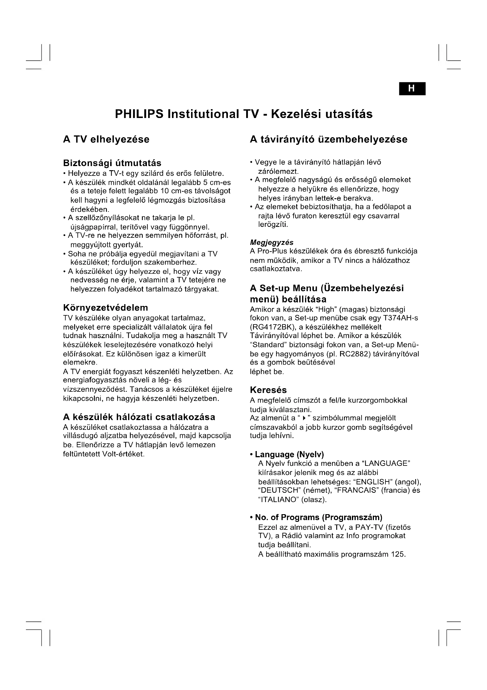 - Security (Beveiliging set-up menu) De "SECURITY" functie biedt de gebruiker de keuze uit twee instellingen: "HIGH" en "STANDARD". De fabrieksinstelling is "STANDARD". In de "Security High" stand is het set-up menu alleen toegankelijk met een afstandsbediening model T374AH (afstandsbediening van de beheerder). In de "Security Standard" stand is het set-up menu ook toegankelijk met een afstandsbediening van de gasten, door het wachtwoord in te toetsen.H PHILIPS Institutional TV - Kezelési utasítás A TV elhelyezése Biztonsági útmutatás Helyezze a TV-t egy szilárd és erõs felületre. A készülék mindkét oldalánál legalább 5 cm-es és a teteje felett legalább 10 cm-es távolságot kell hagyni a legfelelõ légmozgás biztosítása érdekében. A szellõzõnyílásokat ne takarja le pl. újságpapírral, terítõvel vagy függönnyel. A TV-re ne helyezzen semmilyen hõforrást, pl. meggyújtott gyertyát. Soha ne próbálja egyedül megjavítani a TV készüléket; forduljon szakemberhez. A készüléket úgy helyezze el, hogy víz vagy nedvesség ne érje, valamint a TV tetejére ne helyezzen folyadékot tartalmazó tárgyakat. Környezetvédelem TV készüléke olyan anyagokat tartalmaz, melyeket erre specializált vállalatok újra fel tudnak használni. Tudakolja meg a használt TV készülékek leselejtezésére vonatkozó helyi elõírásokat. Ez különösen igaz a kimerült elemekre. A TV energiát fogyaszt készenléti helyzetben. Az energiafogyasztás növeli a lég- és vízszennyezõdést. Tanácsos a készüléket éjjelre kikapcsolni, ne hagyja készenléti helyzetben. A készülék hálózati csatlakozása A készüléket csatlakoztassa a hálózatra a villásdugó aljzatba helyezésével, majd kapcsolja be. Ellenõrizze a TV hátlapján levõ lemezen feltüntetett Volt-értéket. A távirányító üzembehelyezése Vegye le a távirányító hátlapján lévõ zárólemezt. A megfelelõ nagyságú és erõsségû elemeket helyezze a helyükre és ellenõrizze, hogy helyes irányban lettek-e berakva. Az elemeket bebiztosíthatja, ha a fedõlapot a rajta lévõ furaton keresztül egy csavarral lerögzíti. Megjegyzés A Pro-Plus készülékek óra és ébresztõ funkciója nem mûködik, amikor a TV nincs a hálózathoz csatlakoztatva. A Set-up Menu (Üzembehelyezési menü) beállítása Amikor a készülék High (magas) biztonsági fokon van, a Set-up menübe csak egy T374AH-s (RG4172BK), a készülékhez mellékelt Távirányítóval léphet be. Amikor a készülék Standard biztonsági fokon van, a Set-up Menü- be egy hagyományos (pl. RC2882) távirányítóval és a gombok beütésével léphet be. Keresés A megfelelõ címszót a fel/le kurzorgombokkal tudja kiválasztani. Az almenüt a " szimbólummal megjelölt címszavakból a jobb kurzor gomb segítségével tudja lehívni. Language (Nyelv) A Nyelv funkció a menüben a LANGUAGE kiírásakor jelenik meg és az alábbi beállításokban lehetséges: ENGLISH (angol), DEUTSCH (német), FRANCAIS (francia) és ITALIANO (olasz). No. of Programs (Programszám) Ezzel az almenüvel a TV, a PAY-TV (fizetõs TV), a Rádió valamint az Info programokat tudja beállítani. A beállítható maximális programszám 125. Installation (Üzembehelyezés) Ennek a menünek a kinyitása minden védelmi funkciót töröl. A menük elhagyásához nyomja meg a Menu gombot. Input (Bevezetés) A menü "Input" címszavával kiválaszthatja a programhoz rendelendõ bevezetõ forrást, mely a programhoz lesz rendelve. Az alábbi értékek lehetségesek: Front End, AV1, AV2 és AV2YC (belsõ összekapcsolás, kizárólag rendszer TV esetén), valamint RADIO. System (Rendszer) Nyugat-Európa (PAL/SECAM-BG) és Kelet- Európa (PAL/SECAM-DK), Egyesült Királyság (PAL-I), Franciaország (SECAM-L/L'). Manual Search (Manuális keresés) MHz frekvenciát számgombokkal lehet keresni. A jobboldali kurzor segítségével automatikusan megindul a keresés; a frekvencia beütése alatt a még nem szereplõ számjegyeket a - jelek helyettesítik. Üssön be 0-t a 100 MHz-nél alacsonyabb frekvenciaértékek beállításához. Program no. (Programszám) A programtípust a jobb/bal kurzorgombokkal lehet kiválasztani. Ezek a gombok a lehetséges típusok között fognak választani: "TV", "INFO", "PAY-TV" és "RADIO". Ha egy bizonyos típus programszáma 0, akkor e típus kiírása nem jelenik meg. A fenti típusok programszámának megjelenítése érdekében mindig két számot írjon be, pl.: 01-et a TV1-nek, vagypedig üssön be 1-t és a fel/le kurzort használja. Store (Tárolás) A jelen programinformációt a bal/jobb kurzorgomb megnyomásával tárolja el. Ha viszont eltárolás nélkül akarja elhagyni a programot, akkor nyomja meg a Menu gombot. Fine Tune (Finom hangszín) A "control left/right" (bal/jobb ellenõrzés) gombokkal kezdheti a finom hangszín beállítást. Protection (Védelem) Ez a funkció azt mondja meg, hogy a kiválasztott program védelem alatt áll-e vagy sem. A kurzor jobb/bal mozgatógombjával a védelmet YES vagy NO helyzetbe lehet kapcsolni. Label (Elnevezés) Ez a menü címszó arra használható, hogy elnevezést/nevet adjon mindegyik programnak. A bal/jobb gombok megnyomásával be- illetve kiléphet az elnevezés mezõbõl; a fel/le kurzormozgató gomb megnyomásával alfanumerikus jeleket vihet be. Az M (Menu gomb) megnyomásával kiléphet a Label Menu címszóból. Teletext Language (Nyelv) A felhasználó ennek segítségével beállíthatja a kiválasztott csatornához használandó betûrendszert. A bal/jobb kurzormozgató gombbal válassza ki a különbözõ nyelvcsoportokhoz tartozó betût. W: Európai (Latin) / Nyugat E: Európai (Latin) / Kelet G: Görög A: Arab C: Cirill Video Blank (Képtörlés) Ezzel a címszóval a "YES" és "NO" között választhat, hogy bekapcsolja, illetve kikapcsolja a képtörlést. Audio Mute (Hangtörlés) Ezzel a címszóval a "YES" és "NO" között vála