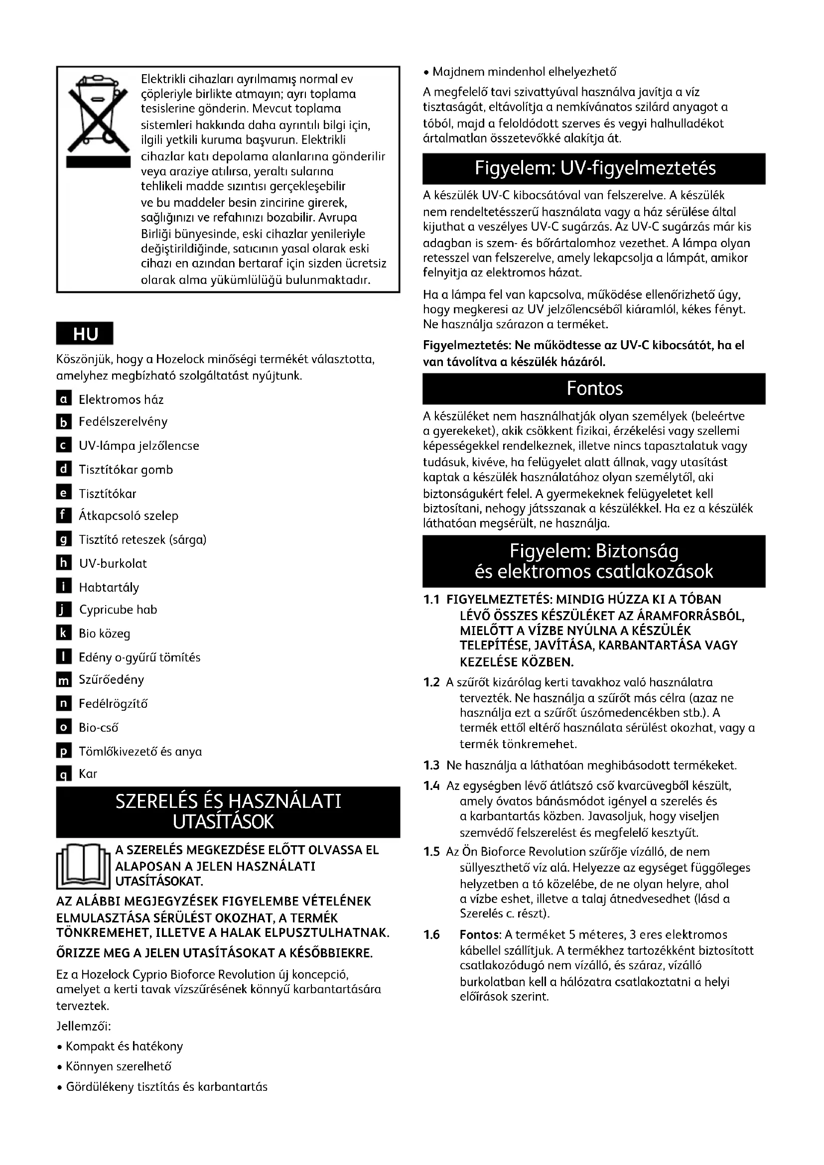 és az algásodás leáll) kikapcsolhatja az egységet. Majd távolítsa el, mossa át alaposan, tisztítsa és szárítsa meg, majd tárolja száraz és fagytól védett helyen. Mindig fedél nélkül tárolja az egységet, hogy gondoskodjon az elegendő szellőzésről és száradásról. Hibaelhárítás / GYIKquestions Probléma Lehetséges ok Elhárítás Nincs vízáramlás a szűrőn keresztül a tóba. A tápszivattyú nincs bekapcsolva vagy nem működik. Ellenőrizze, hogy a szivattyú működik-e és be van-e kapcsolva. Eltömődött a bevezető tömlő. Ellenőrizze, hogy nincs-e eltömődve a bevezető tömlő és a tóból visszatérő tömlő. Az átalakító szelep Hulladék állásba van állítva. Fordítsa az átalakító szelepet Tó állásba. Csökkentett áramlás a szűrőn keresztül Eltömődtek a habok. Tisztítsa meg a szűrőt (lásd a Tisztítás c. részt). Eltömődött a bevezető tömlő. Ellenőrizze, hogy nincs-e eltömődve a bevezető tömlő és a tóból visszatérő tömlő. A víz nem tiszta Az új szűrő még nem működik hatékonyan. A tó vizének tisztasága 2-3 héten belül kezd javulni, de a teljes biológiai érés akár 6-8 hetet is igénybe vehet, mielőtt a szűrő teljes mértékben hatékonnyá válik. Nem megfelelő a szűrő mérete a tóhoz. Ellenőrizze, hogy a tó kialakításának megfelelő szűrőt használ-e. Nem megfelelő a tápszivattyú mérete. Ellenőrizze az áramlási sebességet. Lásd a 2.2 részt. Nem ég az UV- lámpa. Ellenőrizze az UV jelzőlencsét. Cserélje ki az UV-lámpát. Régi az UV- lámpa. 12 havonta cserélje ki az UV-lámpát. A haboknak tisztításra van szükségük. Tisztítsa meg a szűrőt (lásd a Tisztítás c. részt). A tóból visszatérő tömlő kimenete a bevezető szivattyú felett van elhelyezve. Helyezze úgy a szivattyút és a tóból visszatérő tömlőt úgy, hogy azok minél távolabb legyenek egymástól. A tóban túl sok hal van. Csökkentse a tóban lévő halak számát. Túletetés. Csak annyi táplálékot adjon a halaknak, amennyit néhány perc alatt el tudnak fogyasztani. Naponta csak egyszer etessen.Probléma Lehetséges ok Elhárítás Nem forog a tisztítókar. A szivattyú működik a tisztítás kezdetén. Kapcsolja ki a szivattyút. Forgassa a kart mindkét irányba többször. Kapcsolja be a szivattyút (lásd a Tisztítás c. részt). Hozelock Cyprio tiszta vízre vonatkozó jótállás Ha Hozelock Cyprio Bioforce Revolution termékünket a megfelelő szivattyúval használja, GARANTÁLJUK, HOGY VIZE TISZTA LESZ, ELLENKEZŐ ESETBEN VISSZAFIZETJÜK PÉNZÉT. Ez a jótállás a vásárlást követő 12 hónap során érvényes, feltéve, ha