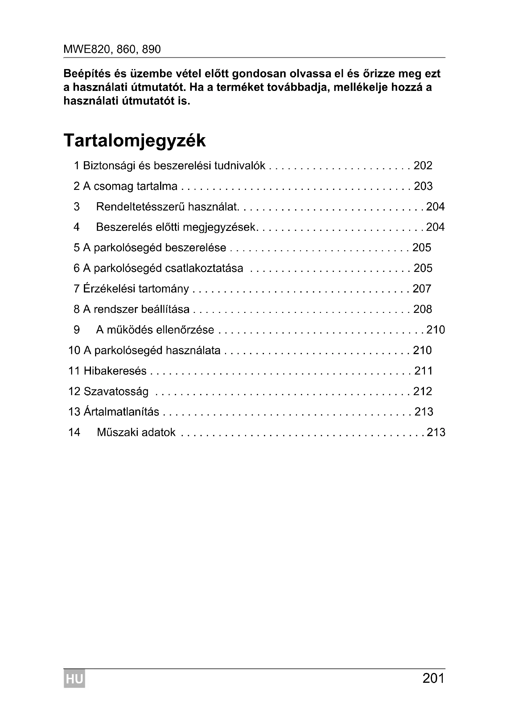 - 14 Műszaki adatok HU Biztonsági és beszerelési tudnivalók MWE820, 860, 890 p. 213
